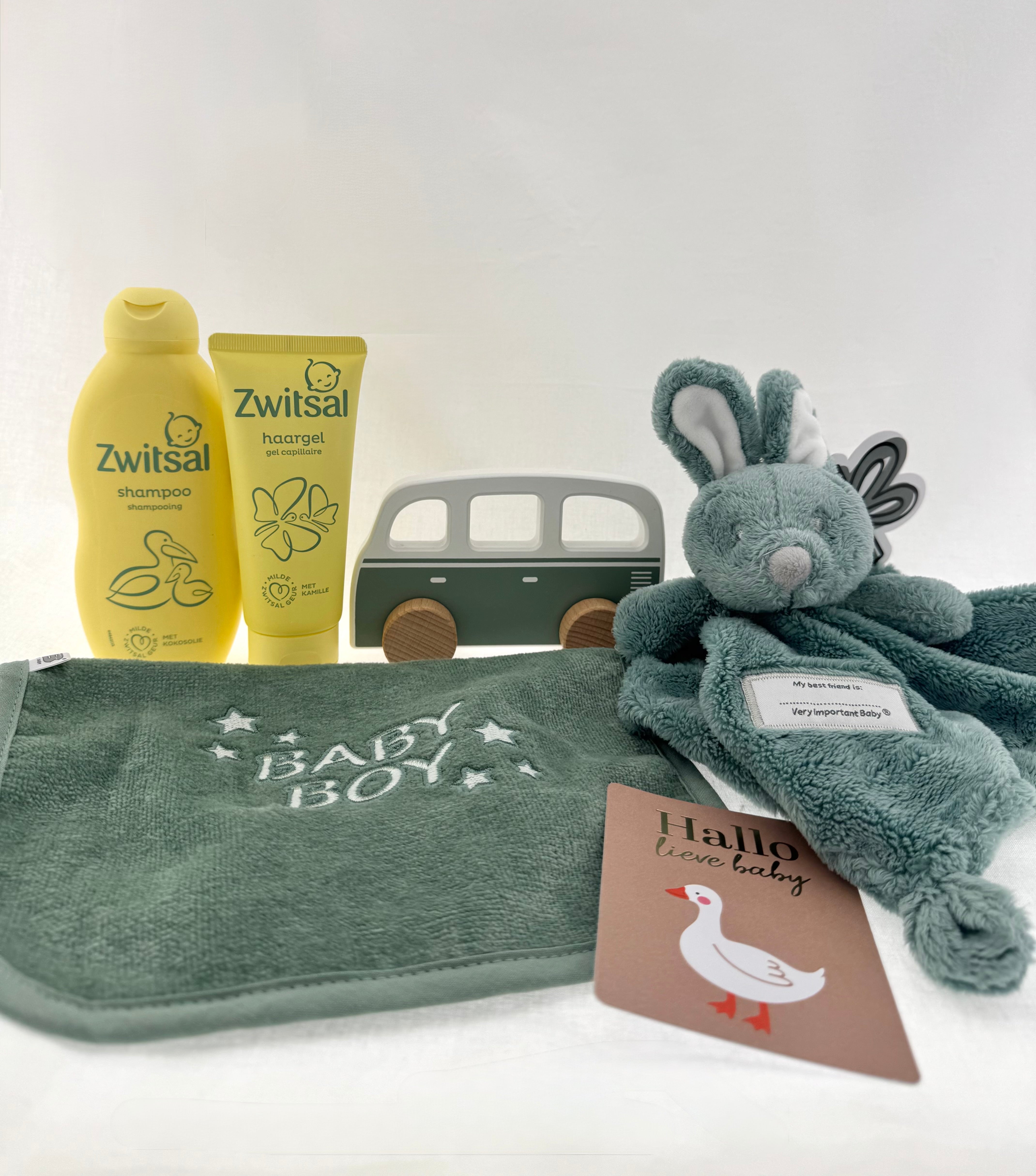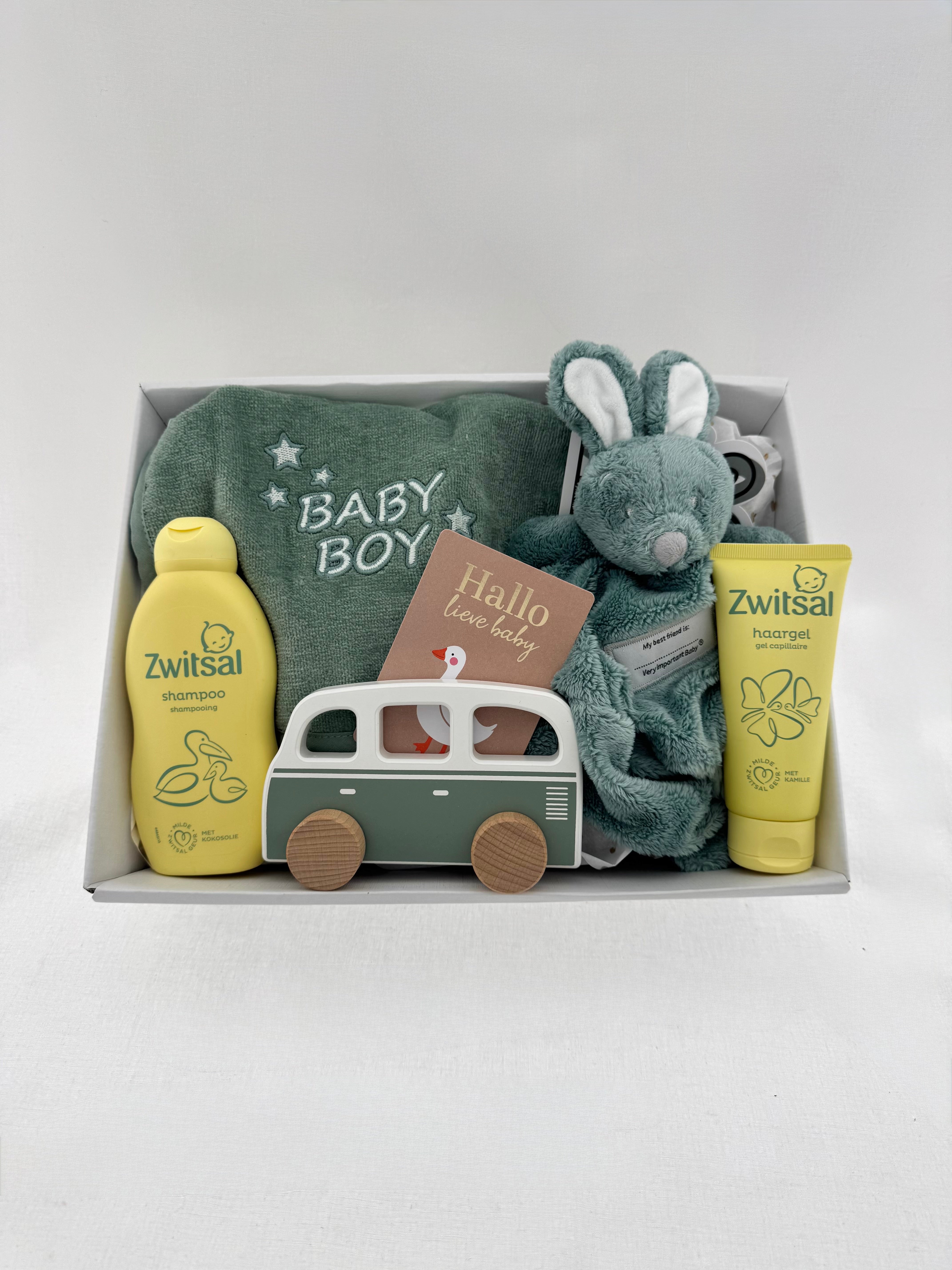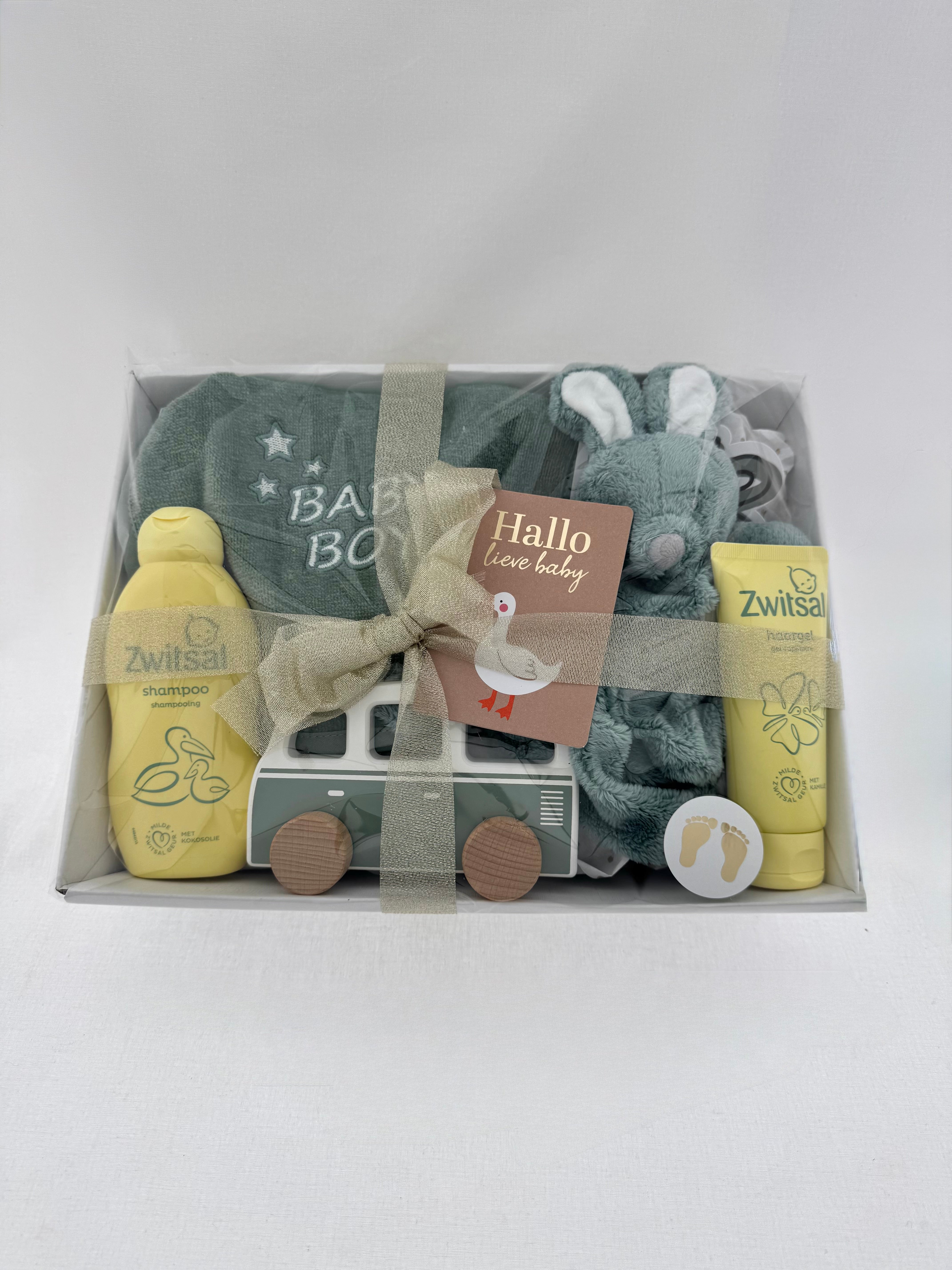 Een prachtig samengesteld kraamcadeau om de komst van een kleine jongen te vieren. Dit stijlvolle en zachte cadeausetje combineert verzorging, spelen en een blijvende herinnering in één liefdevolle box.