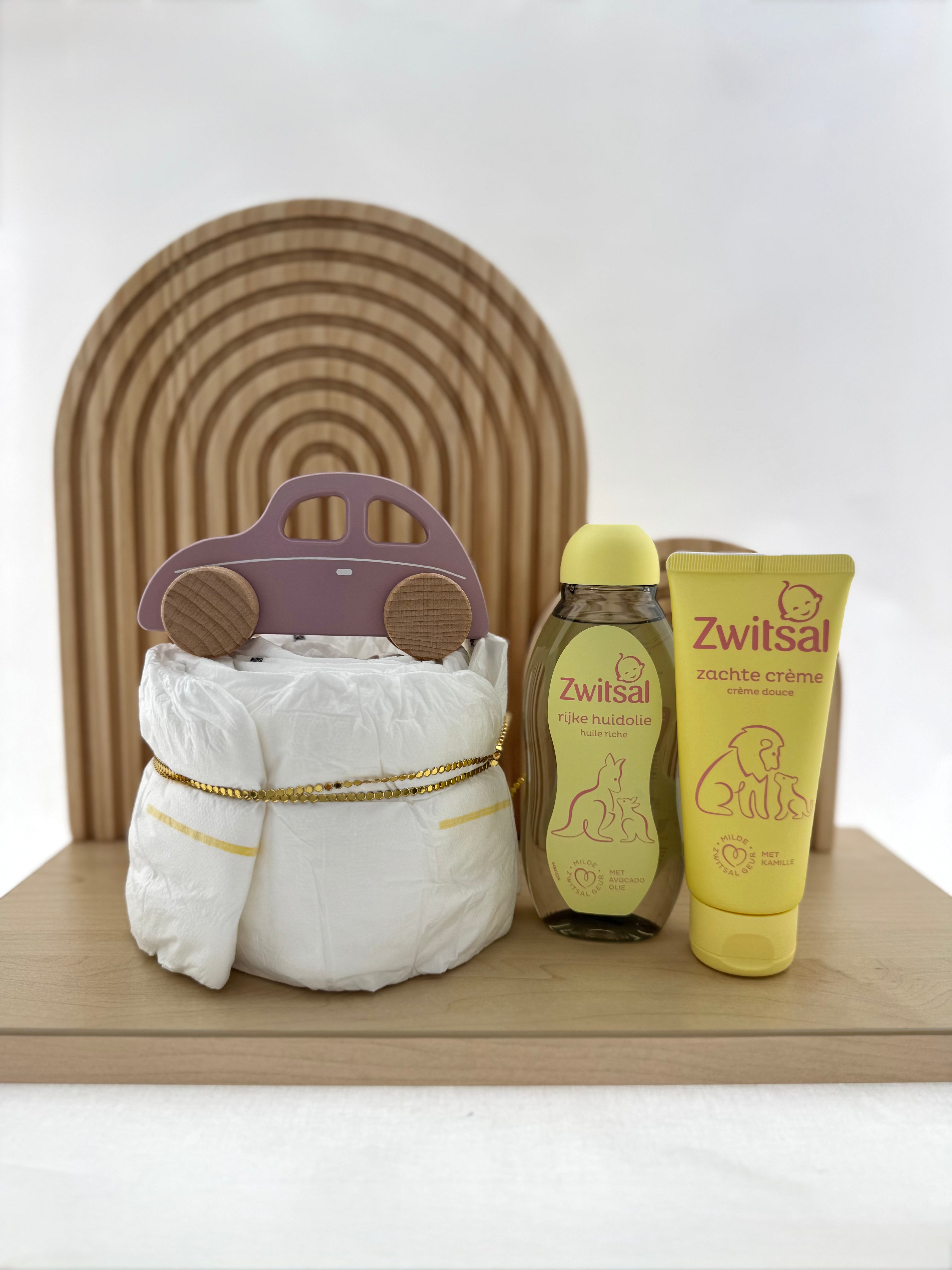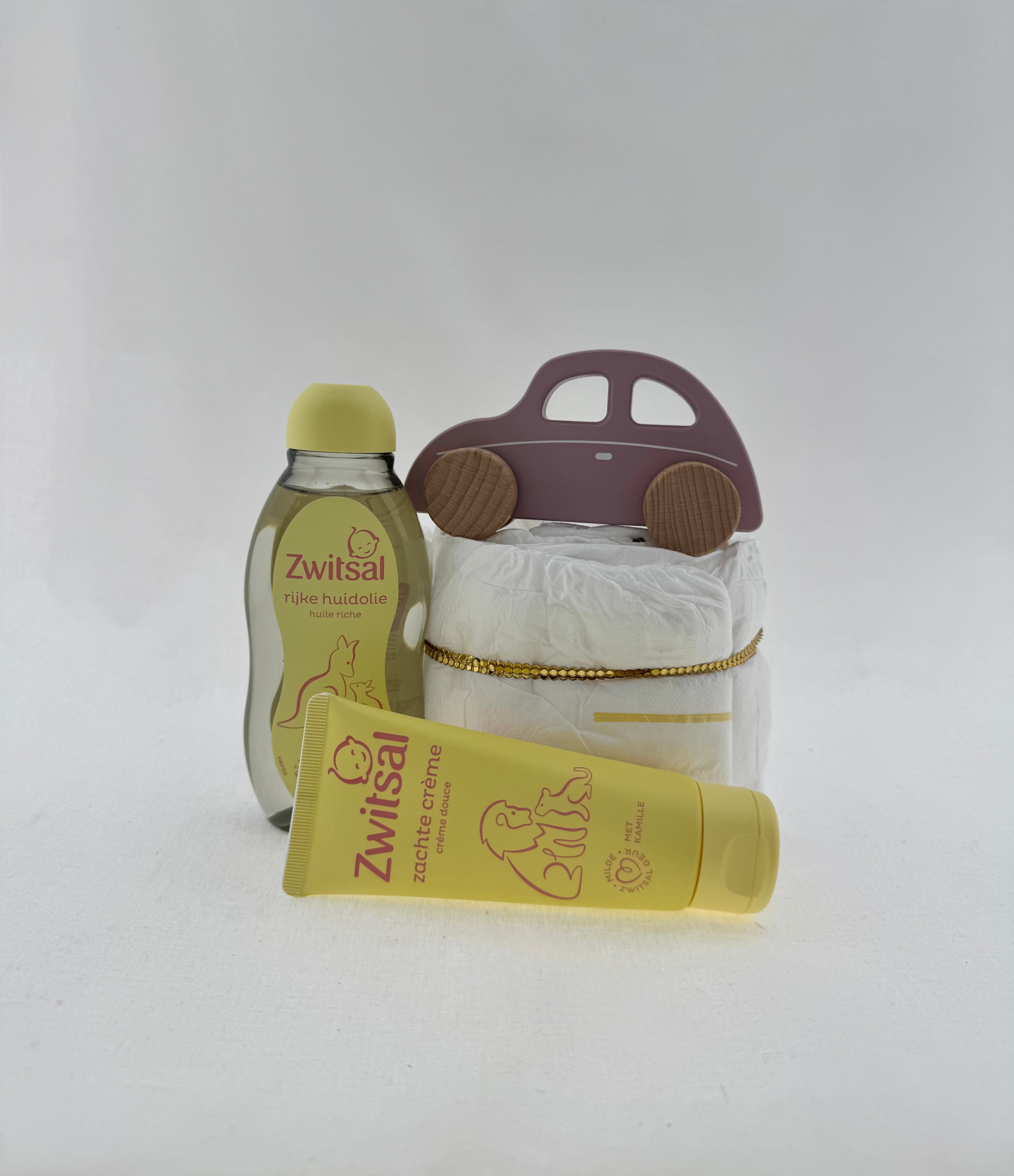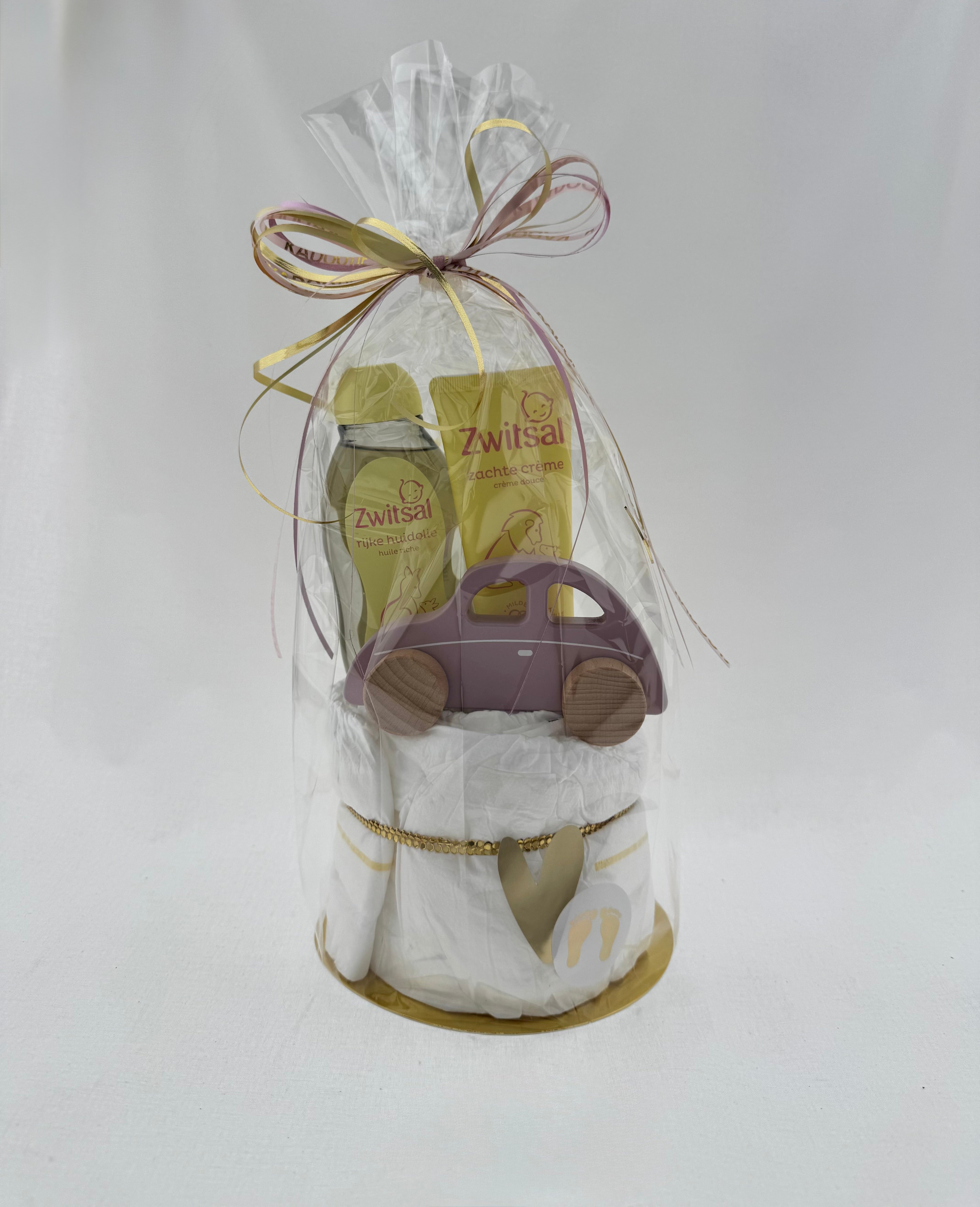 Dit pakket is lief om uit te pakken, handig om te gebruiken en een blijvende speelgoedauto als aandenken. Een warm “welkom kleintje” in één pakket.
