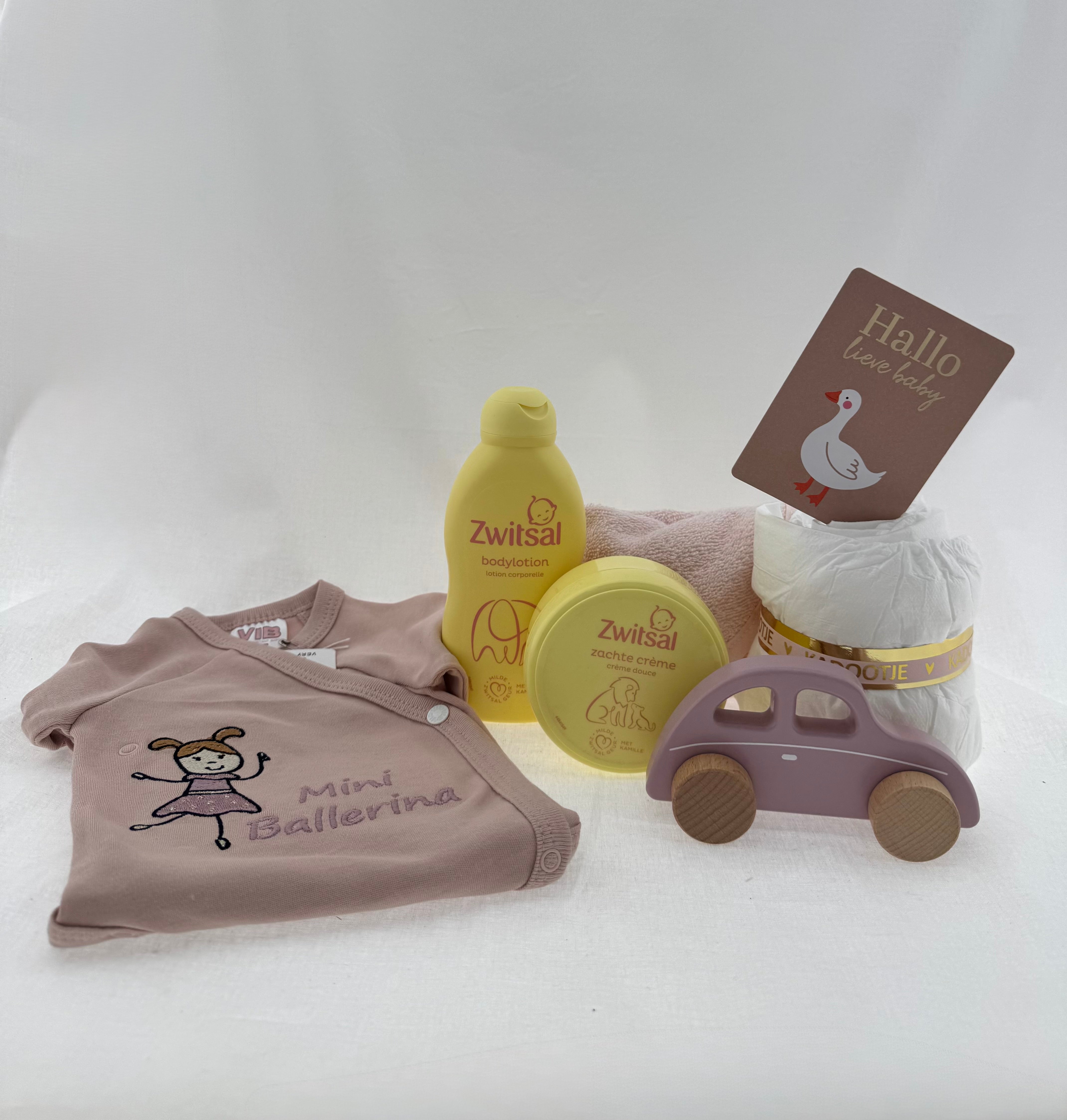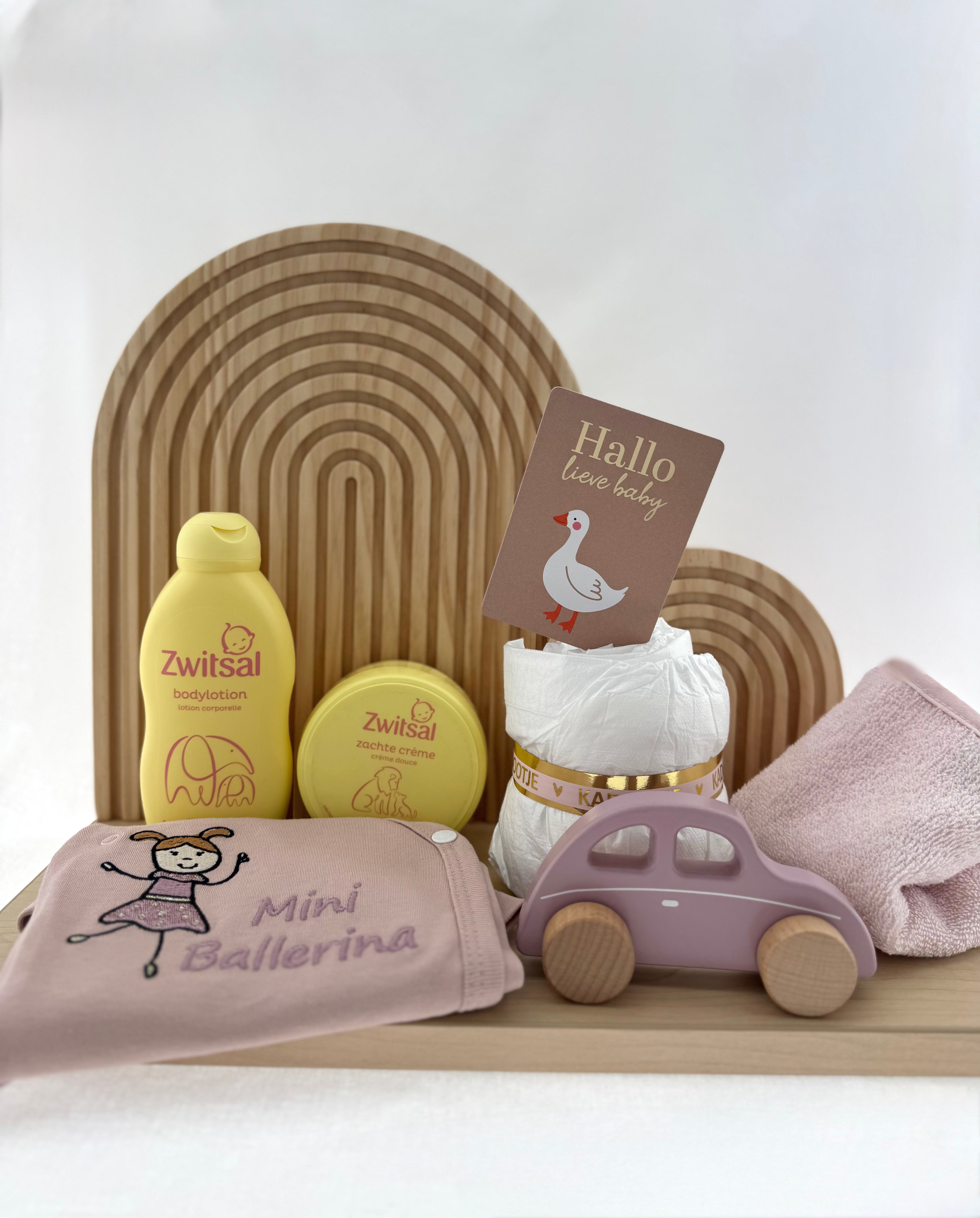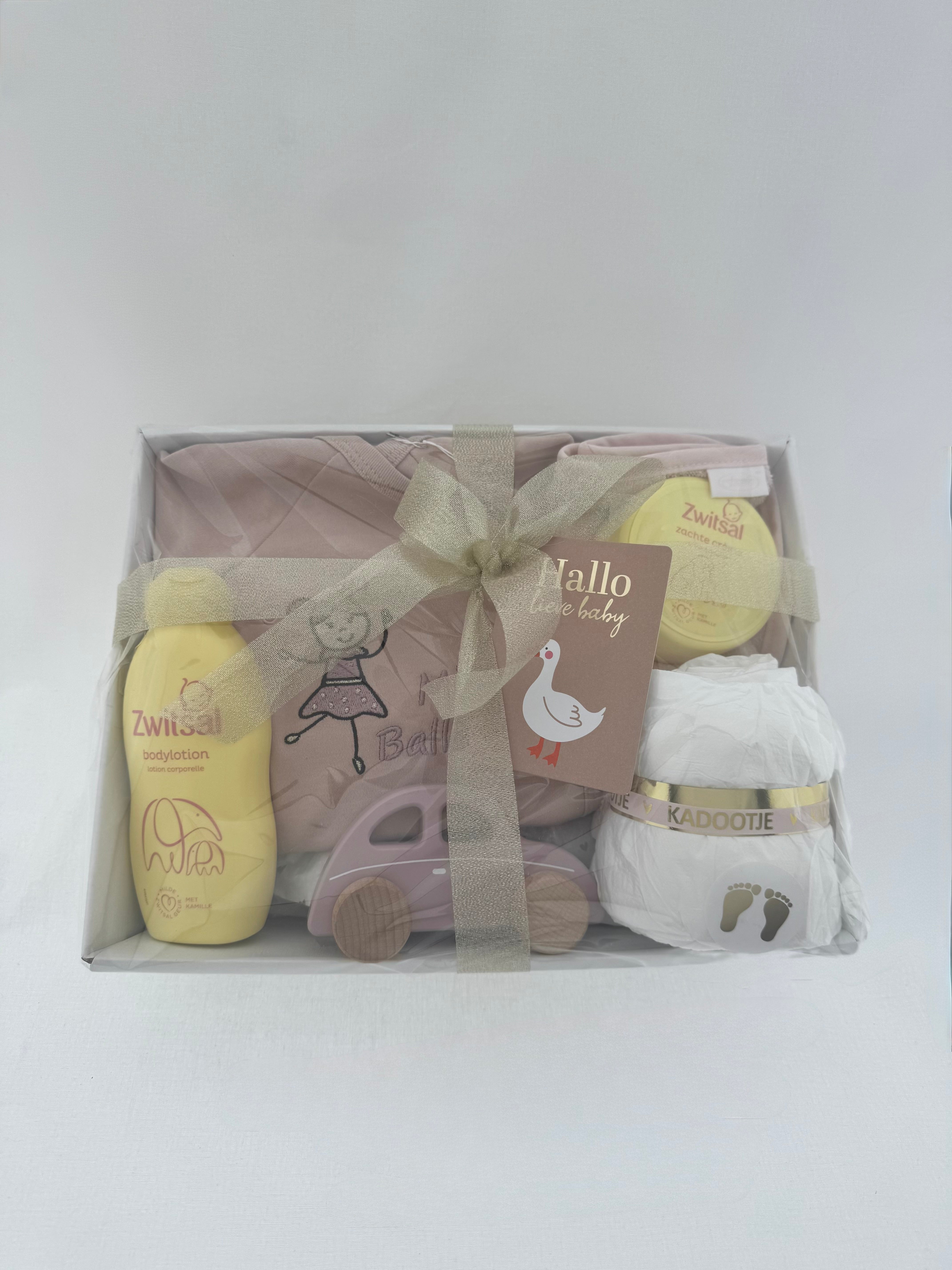 Een stijlvol en liefdevol kraamcadeau voor een kleine dame. Dit zachte en verfijnde cadeausetje is met zorg samengesteld en combineert praktische babyverzorging met lieve, blijvende items.