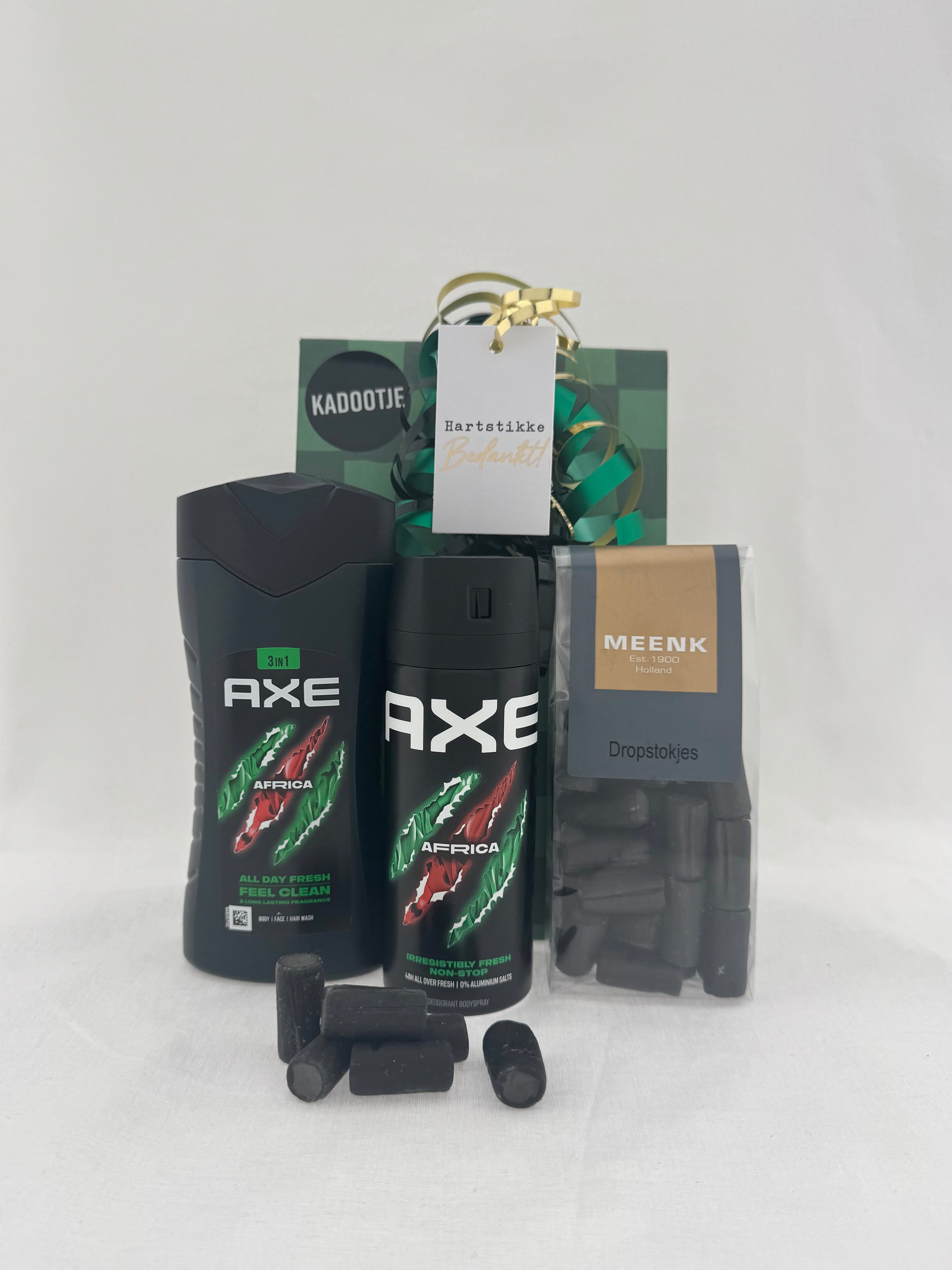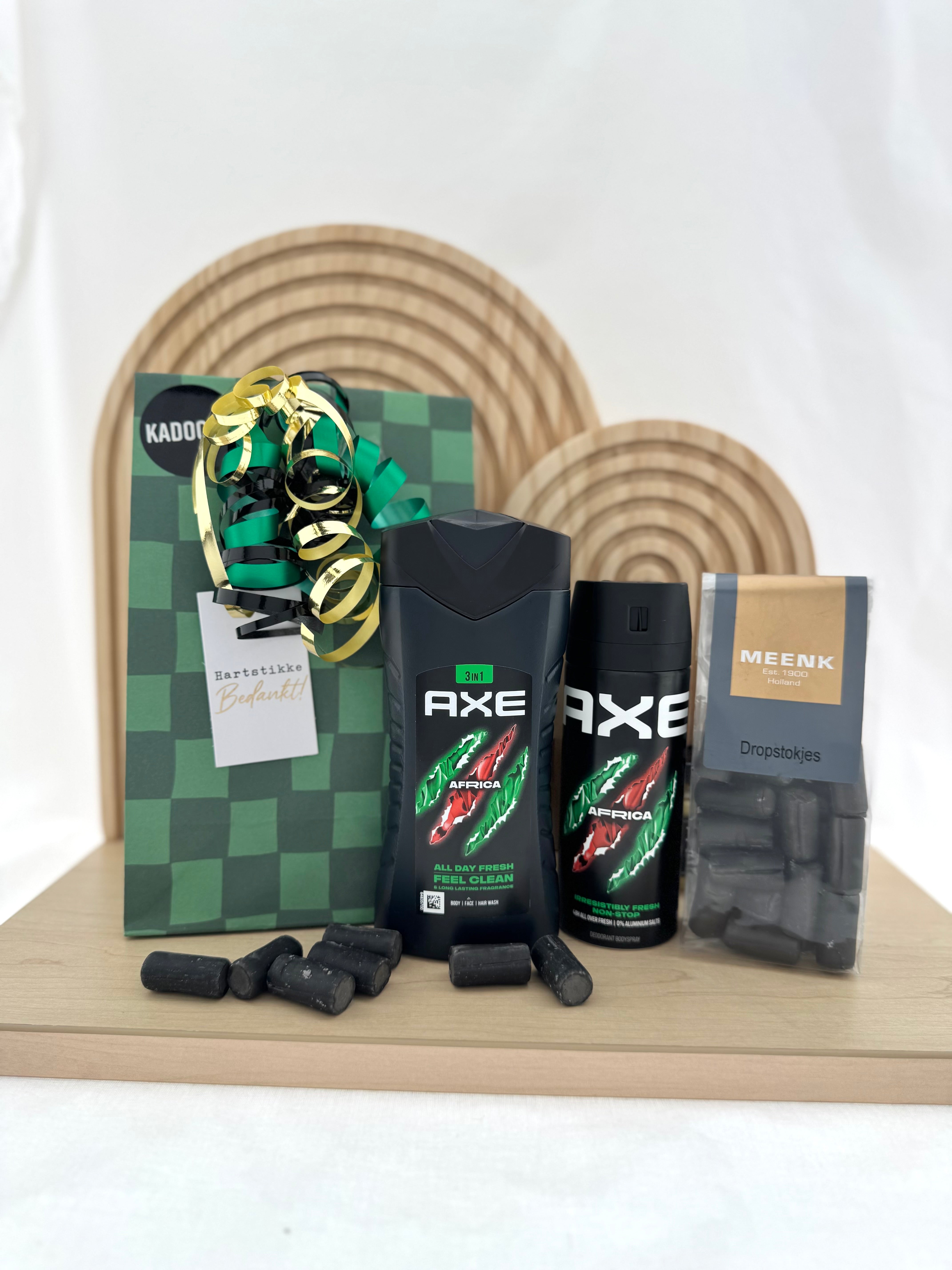 Een stoer en lekker verzorgingspakket, perfect als bedankje voor hem! Dit pakket combineert verfrissende verzorging met een typisch Hollands snoepmoment.