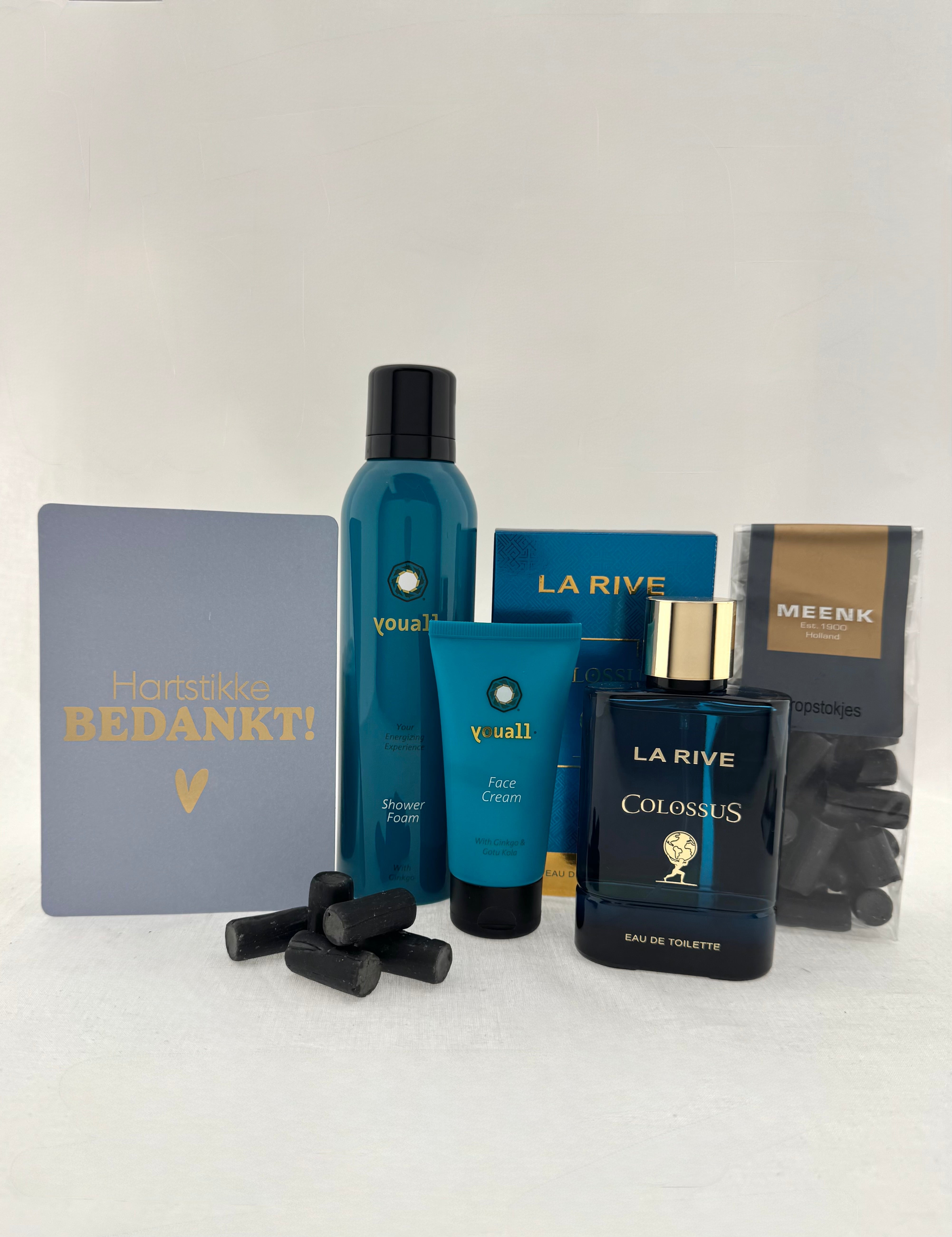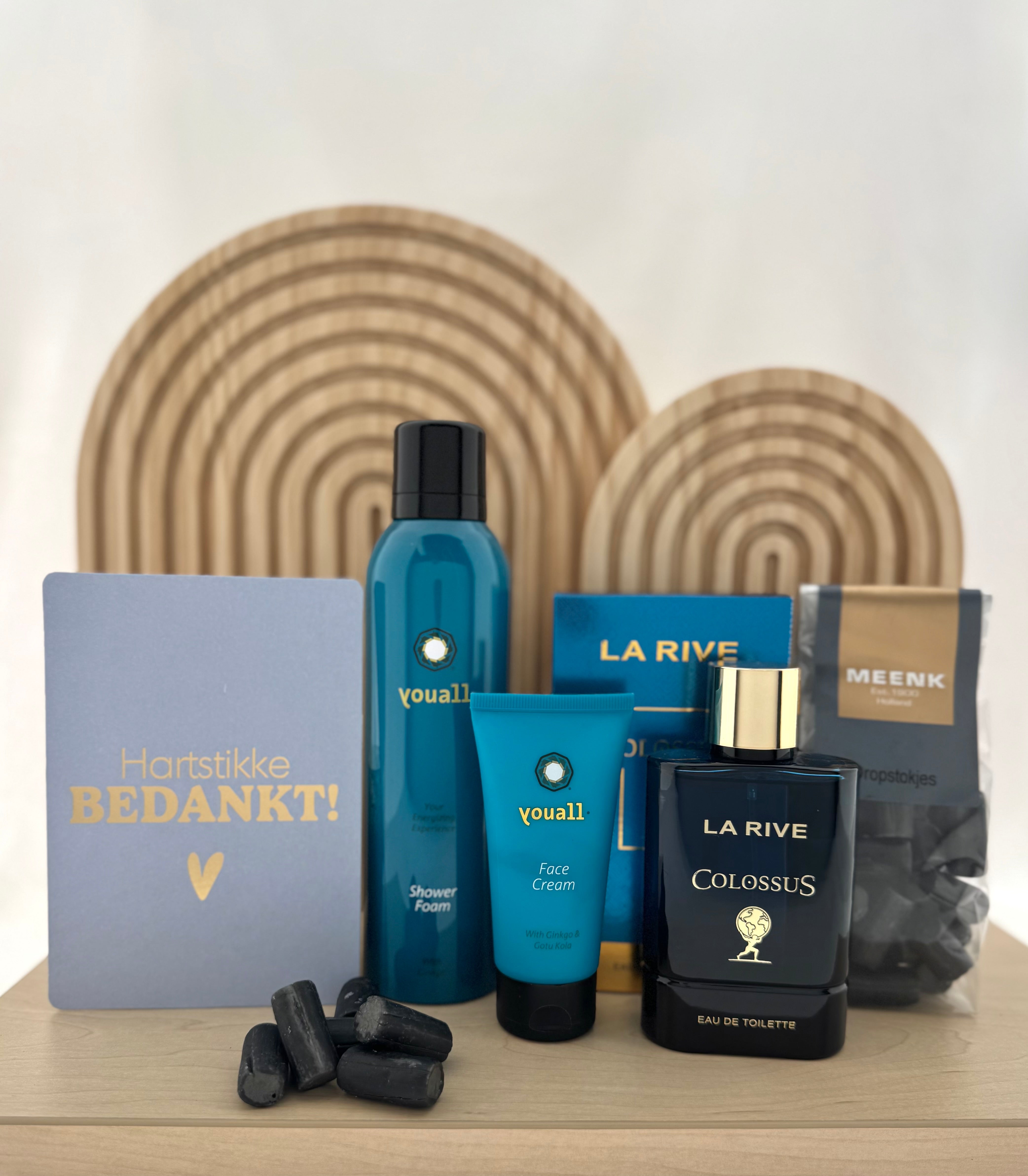 Verras hem met een stijlvol en luxe verzorgingspakket in elegante blauwtinten om hem te bedanken. Dit cadeau combineert verzorging, geur en een kleine lekkernij tot een compleet verwenpakket. Een mooie manier om je waardering te laten blijken.