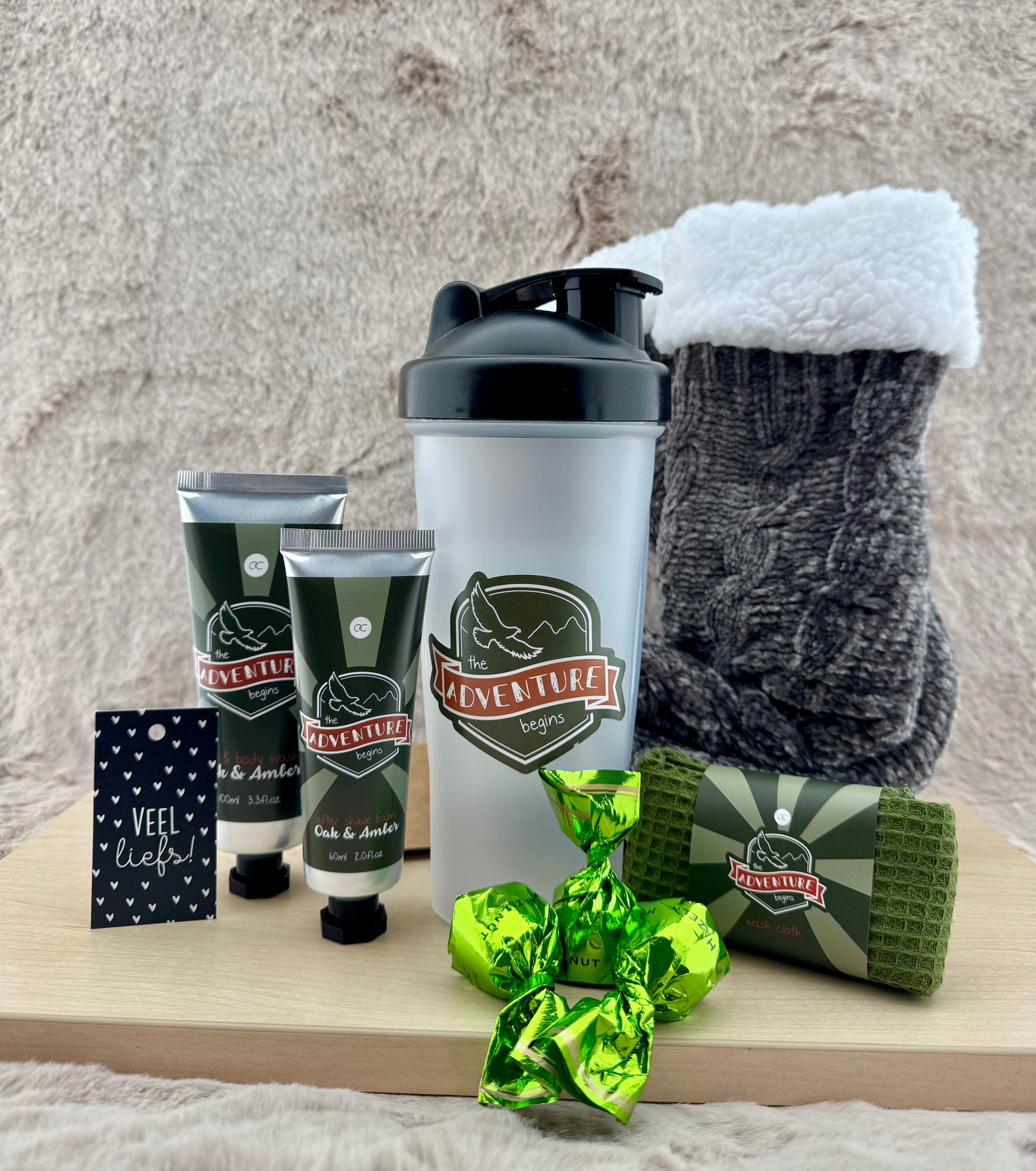 Een stoere en praktische shaker, perfect voor smoothies of proteïneshakes. Met het avontuurlijke ontwerp blijf je gemotiveerd voor je volgende avontuur, of dat nu in de sportschool of in de natuur is. met erin een aftershave en douchegel met een verfrissende geur van de bergen.