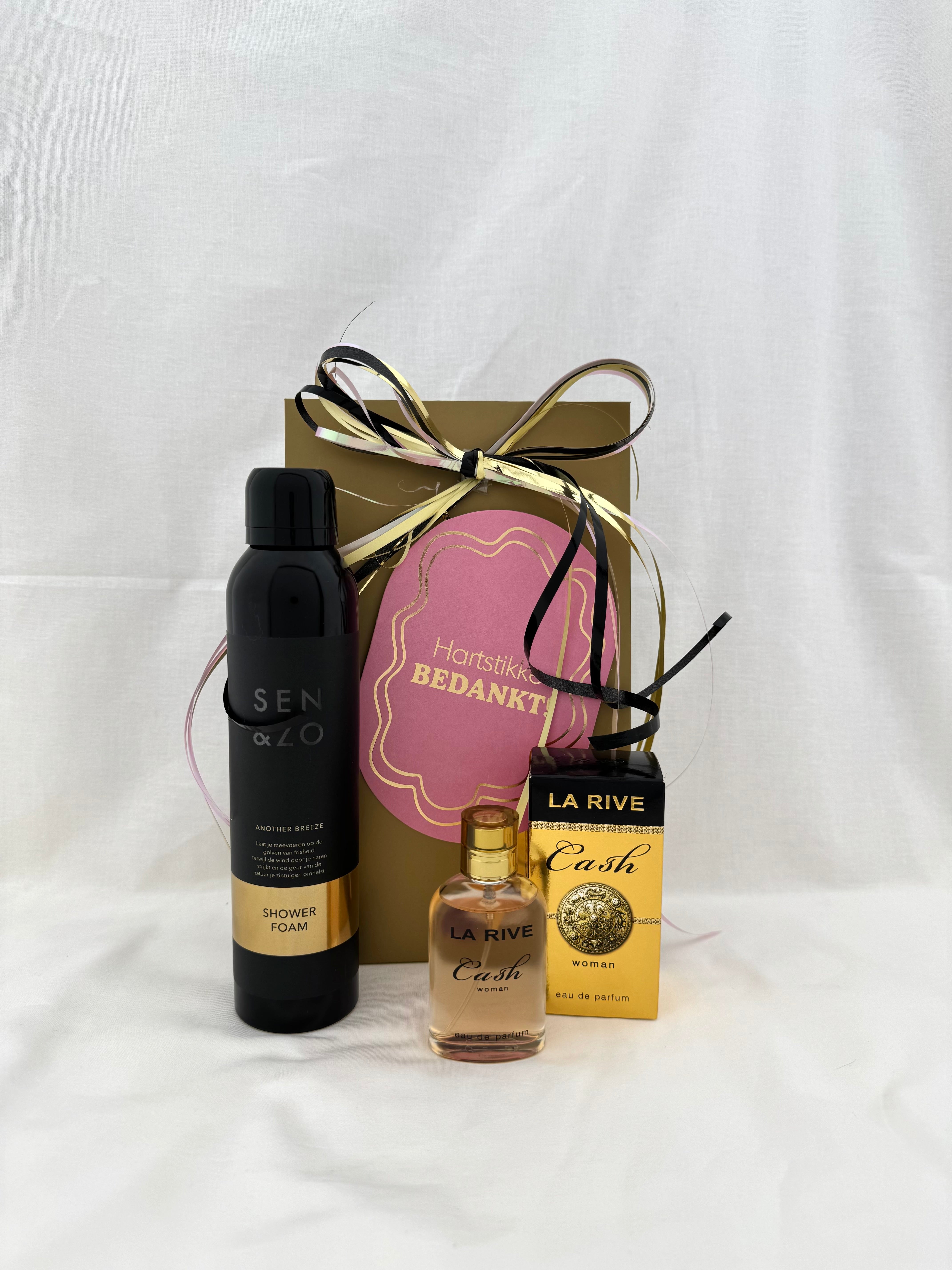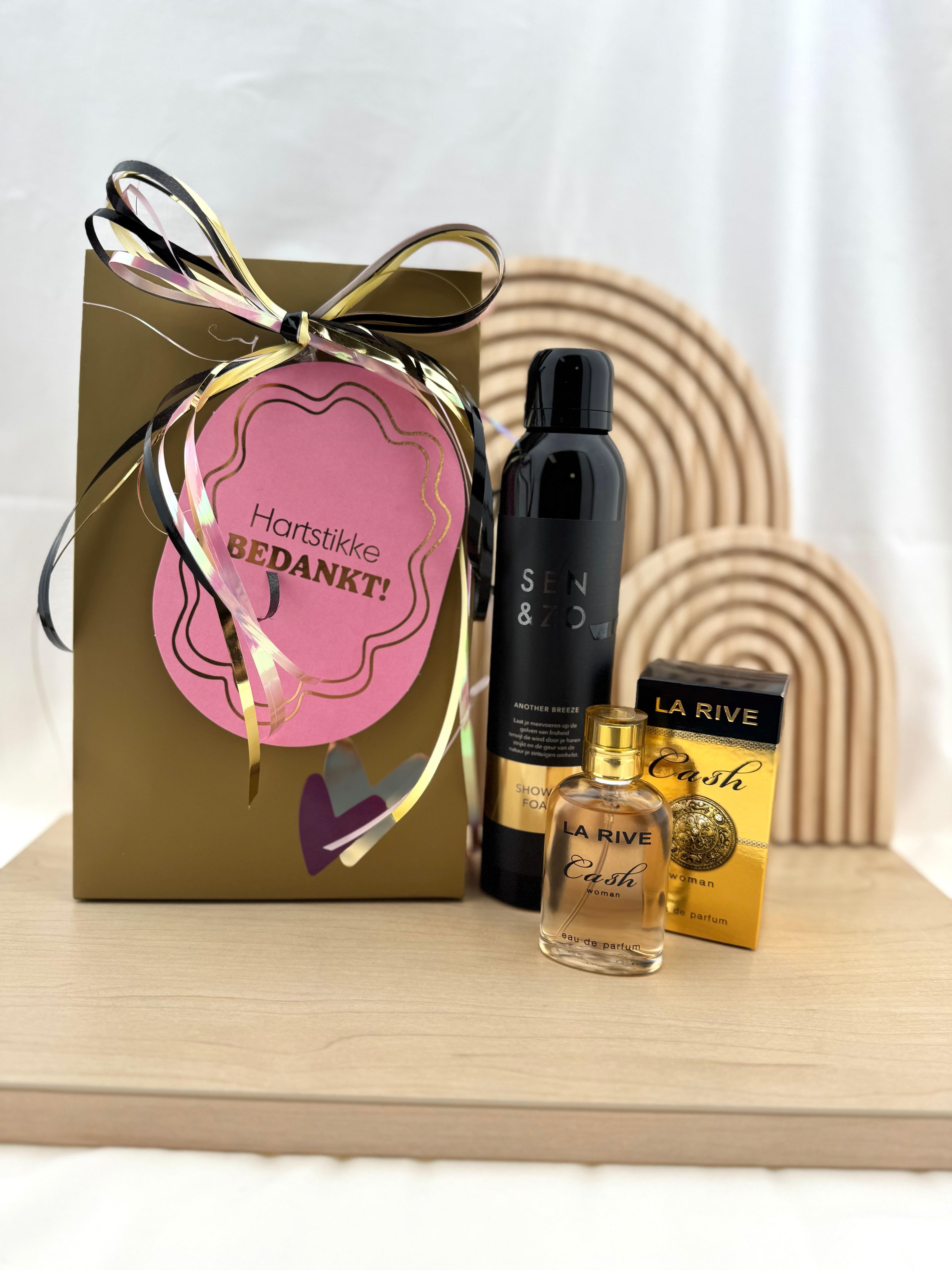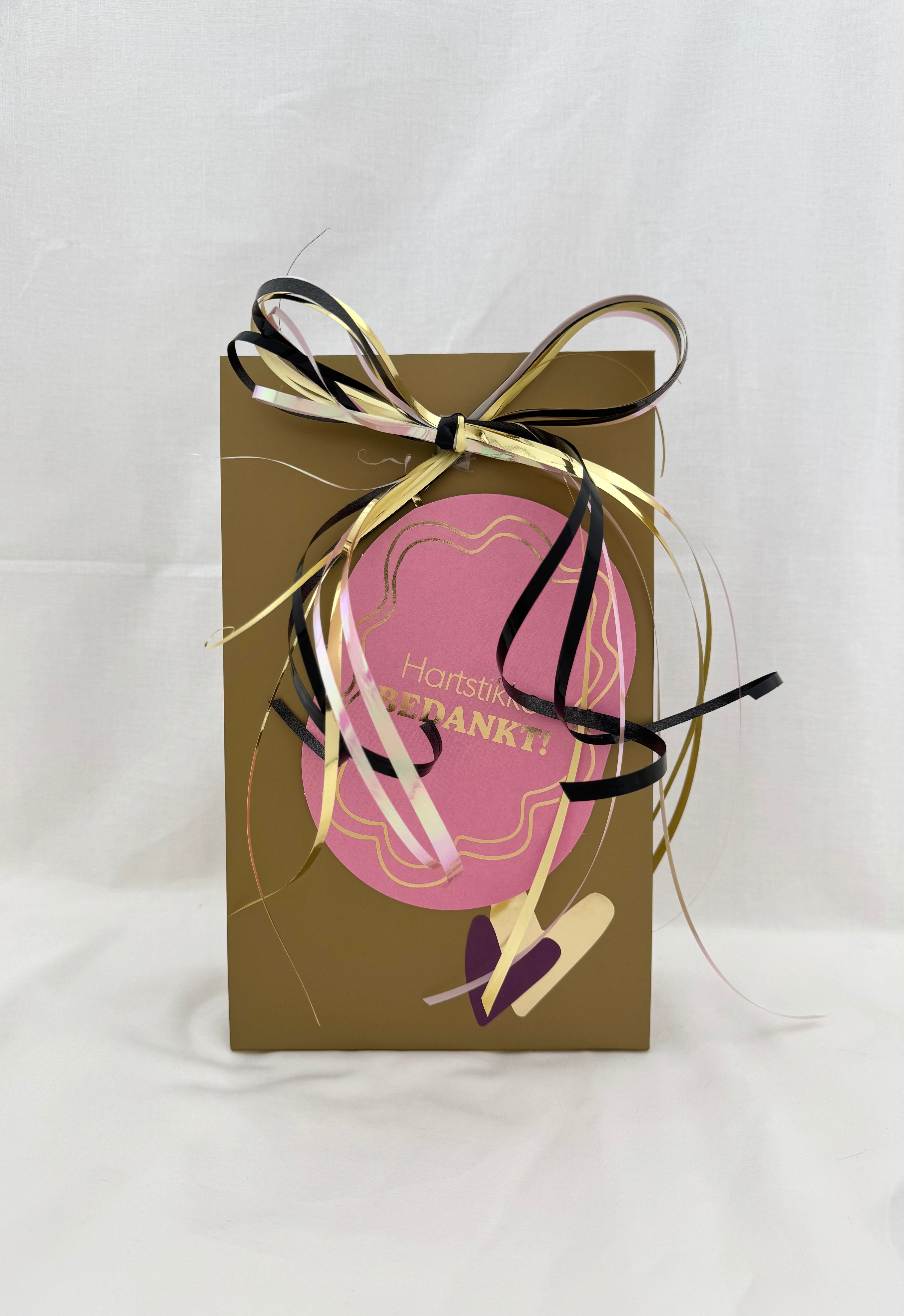 Verwen en verras met dit elegante bedankt cadeaupakket! perfect om iemand écht in het zonnetje te zetten. De set is stijlvol verpakt in een goudkleurige geschenkdoos met een feestelijk lint en een roze kaart met de tekst “Hartstikke Bedankt!”.