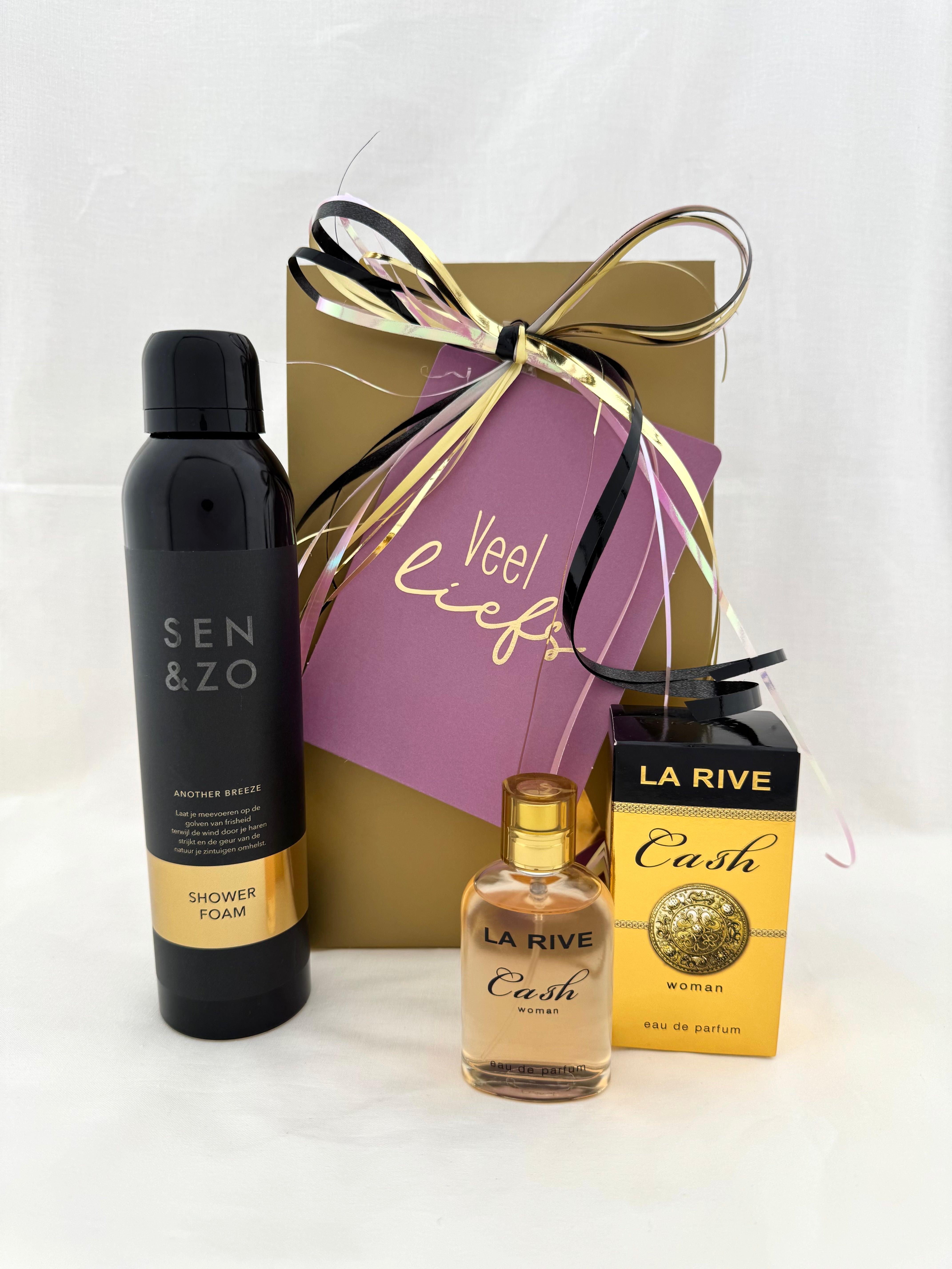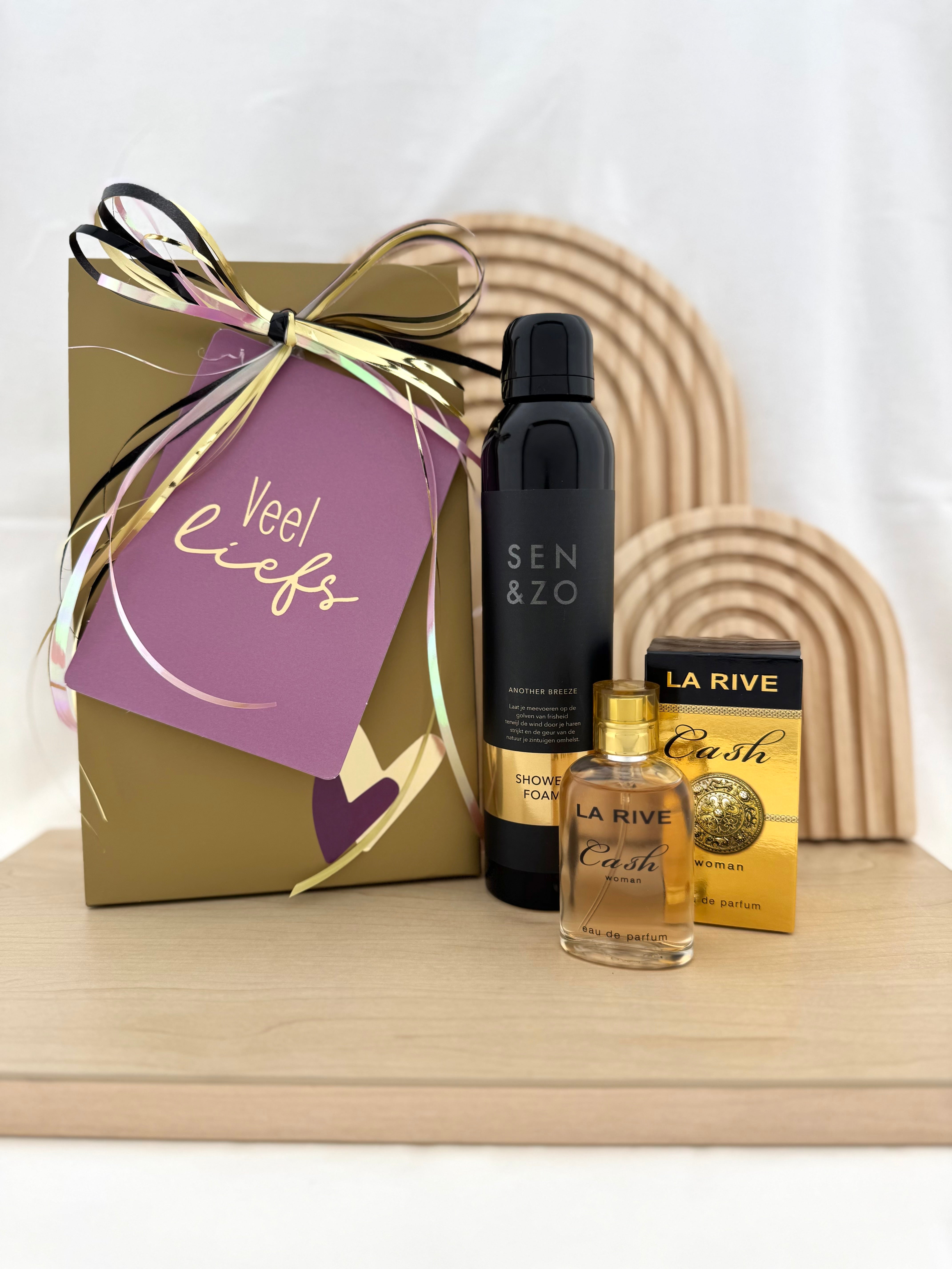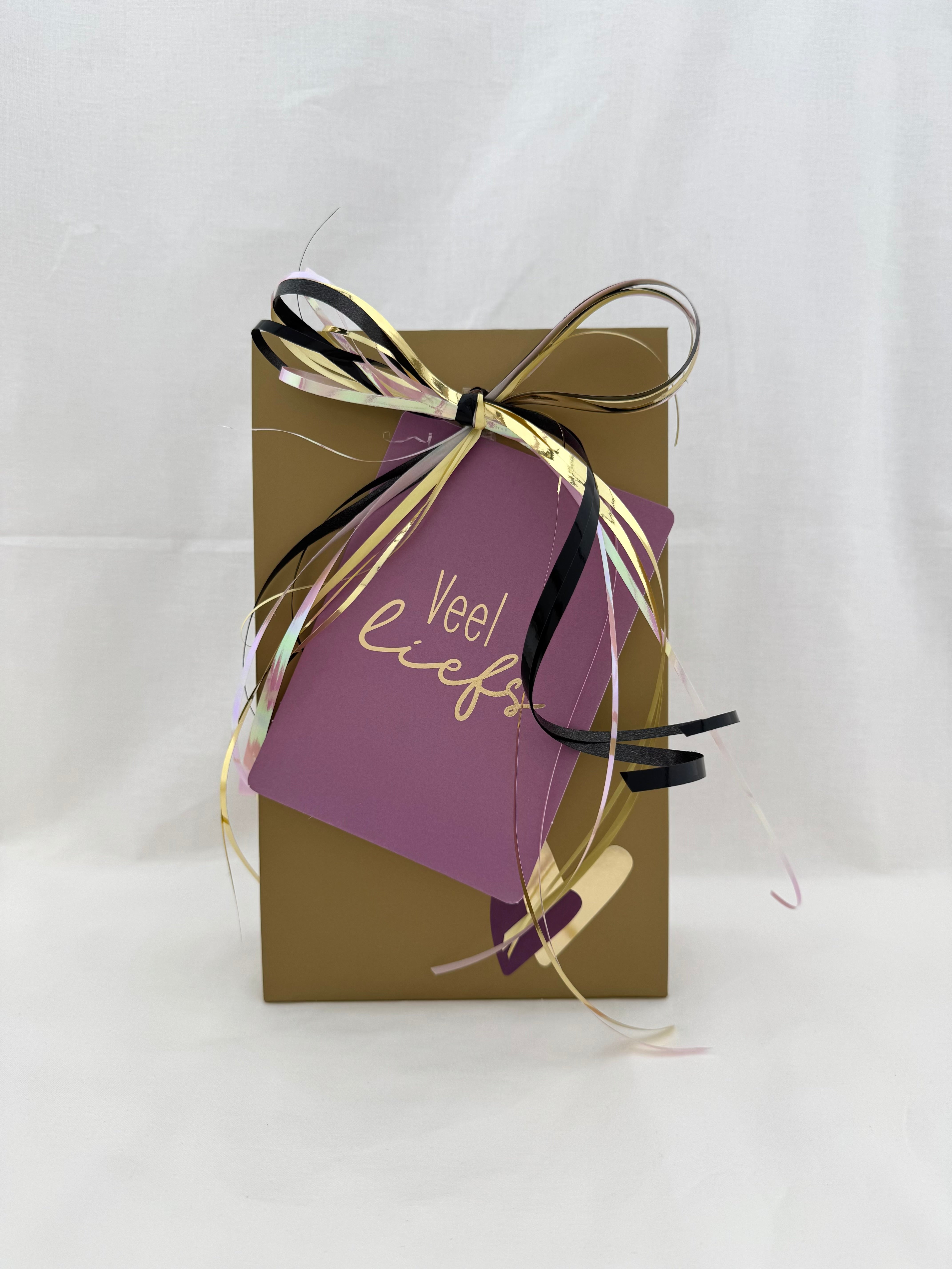Maak Valentijnsdag extra bijzonder met dit elegante cadeaupakket vol geur en ontspanning. De goudkleurige geschenkdoos is feestelijk versierd met een zwart-goud lint en een paars label met de warme boodschap “Veel Liefs”.