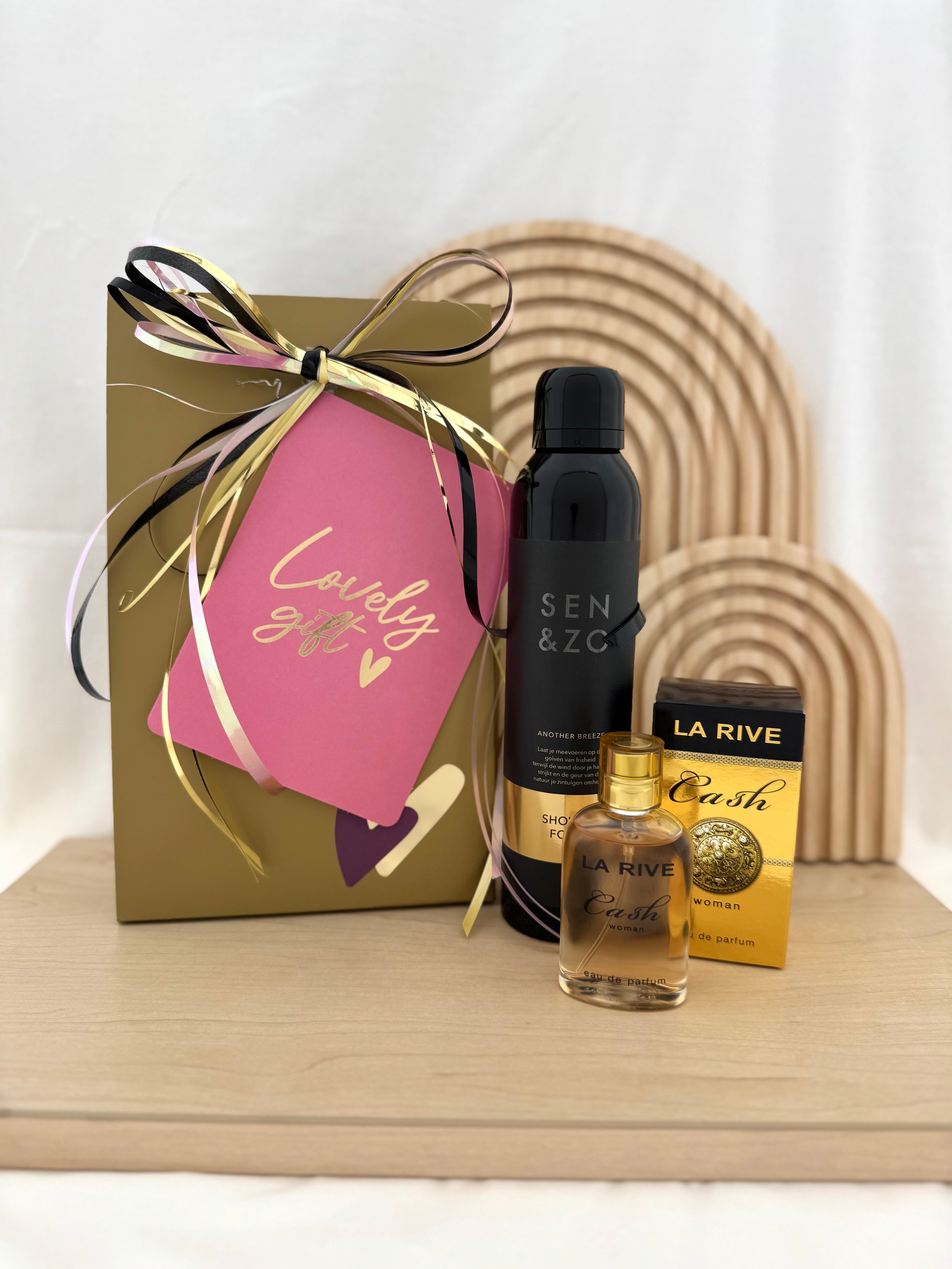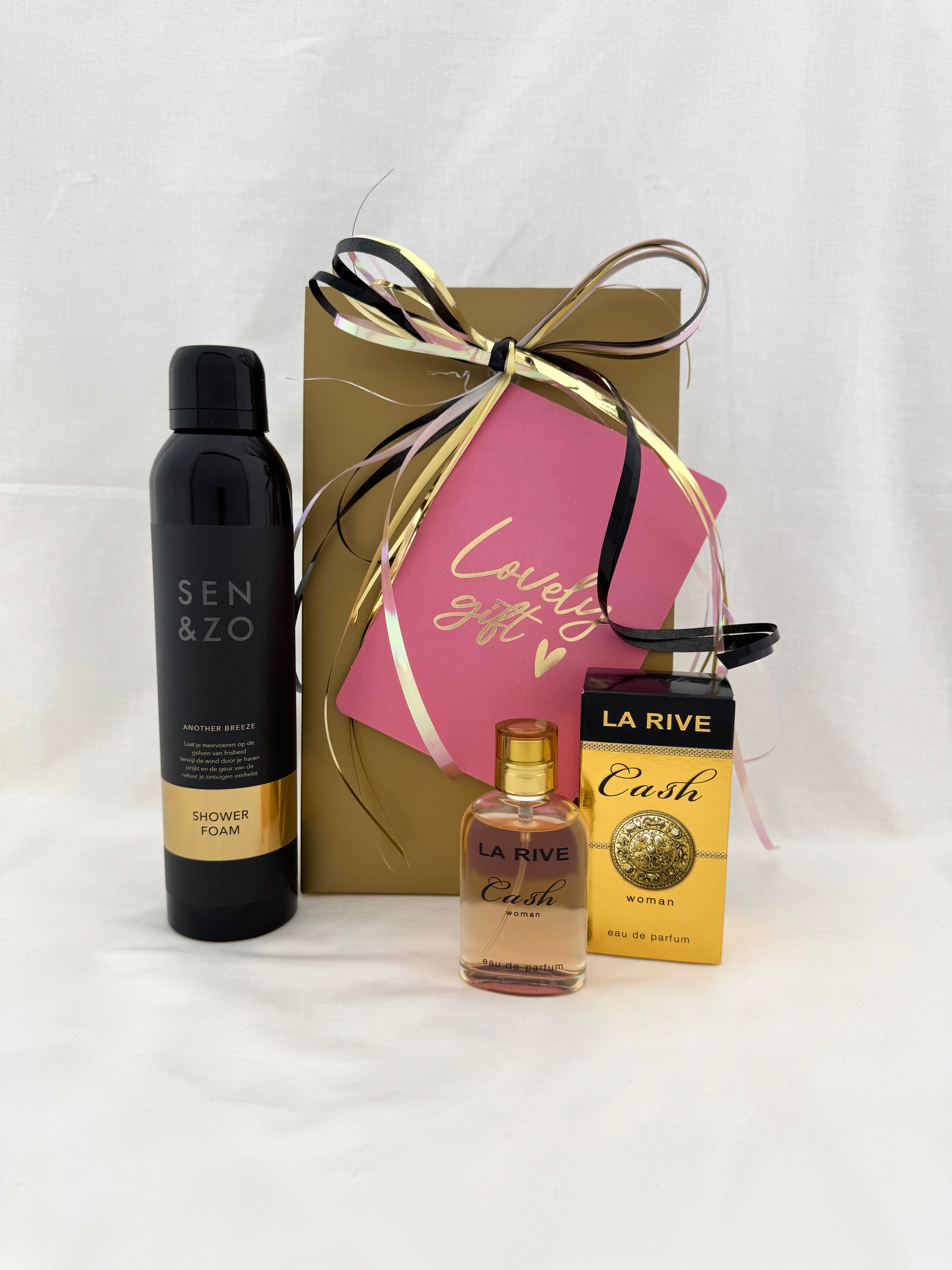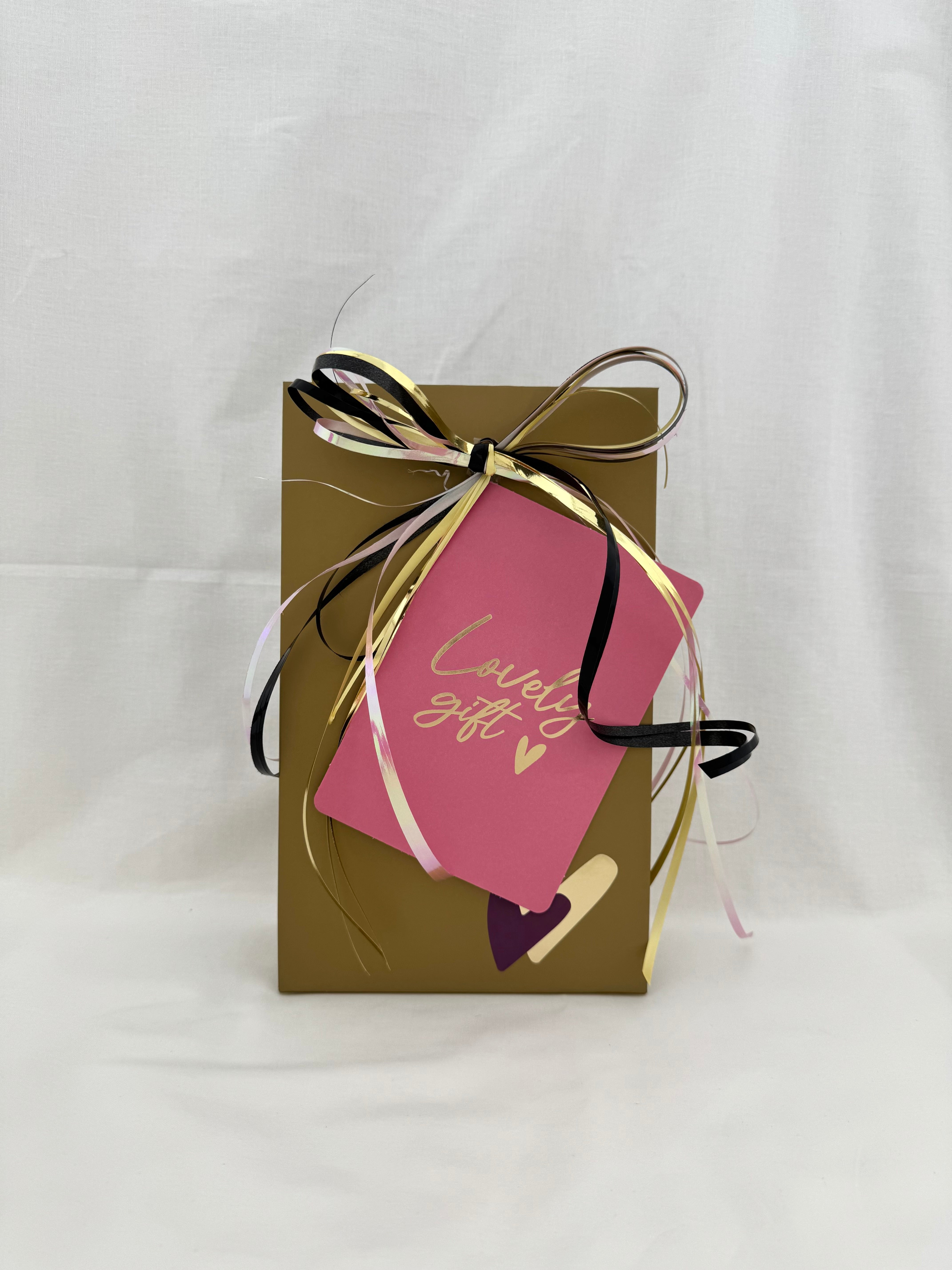 Dit elegante cadeaupakket is dé manier om iemand op een bijzondere manier te verrassen. De goudkleurige geschenkdoos is prachtig afgewerkt met een zwart-goud lint en een roze label met de tekst “Lovely Gift”.