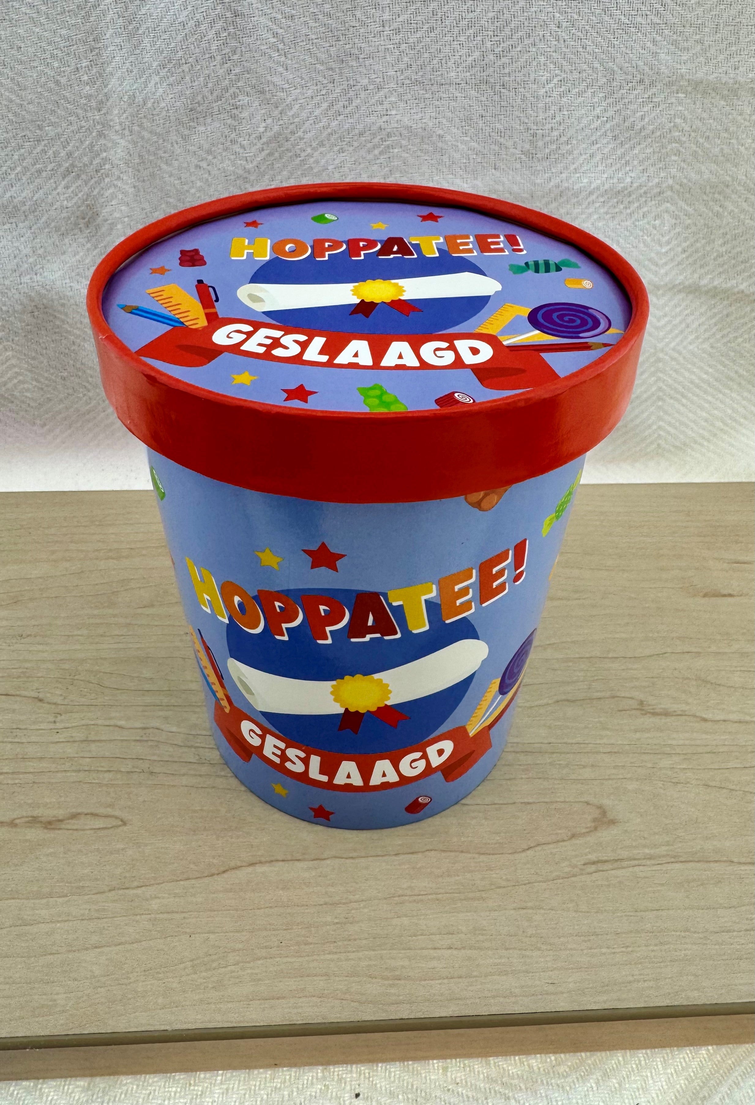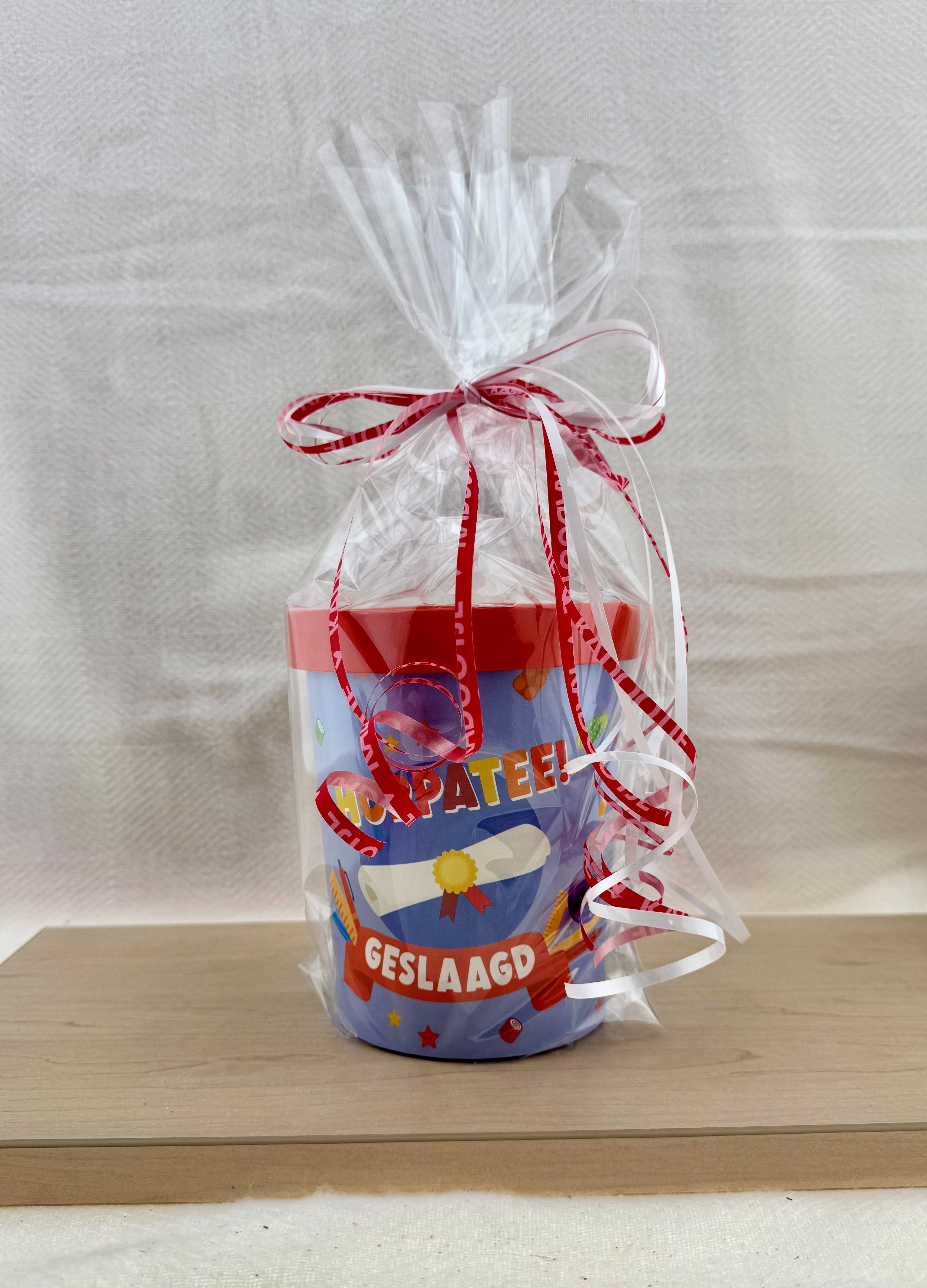 Feestelijke beker met deksel “Hoppatee! Geslaagd”