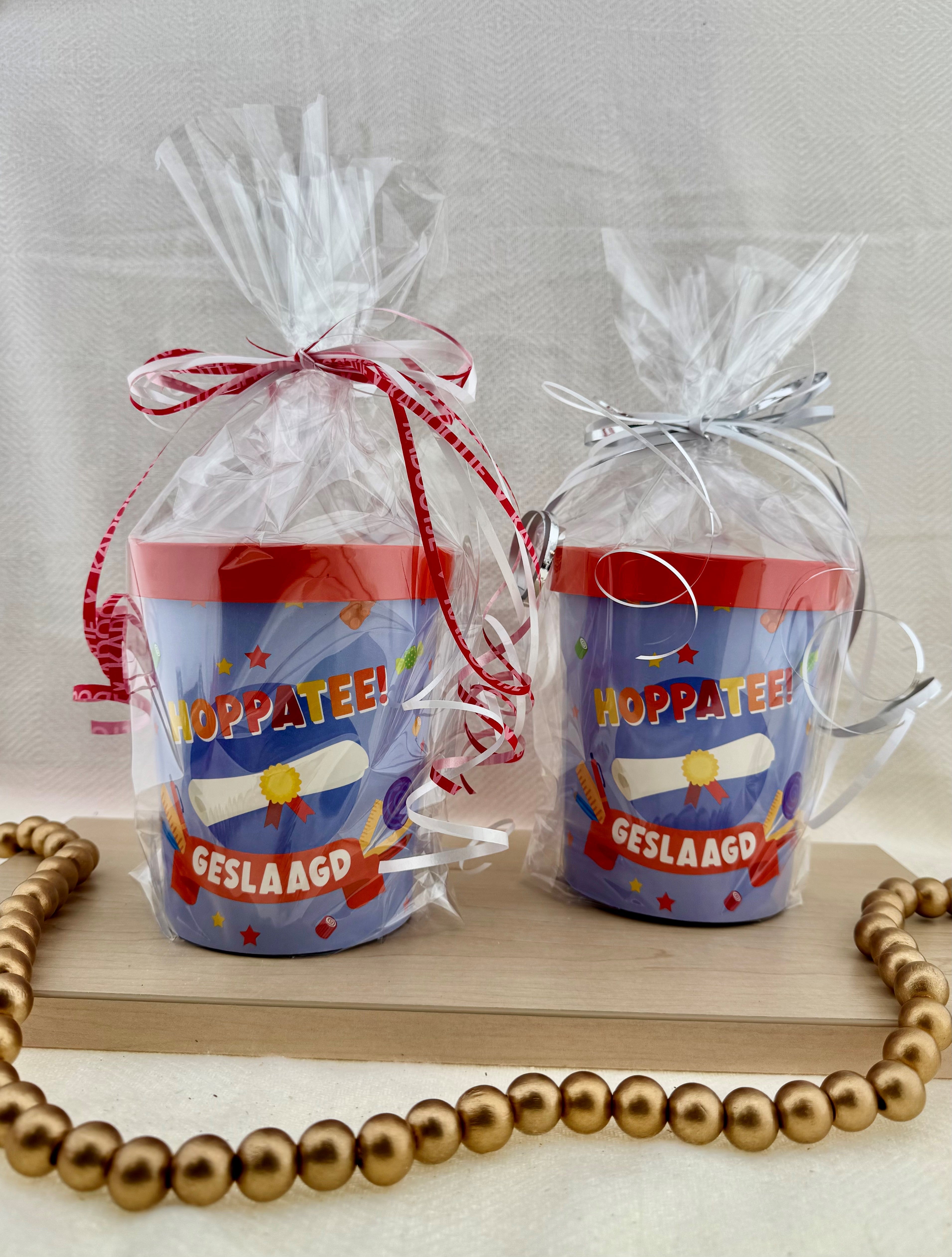 Feestelijke beker met “Hoppatee! Geslaagd” deksel
