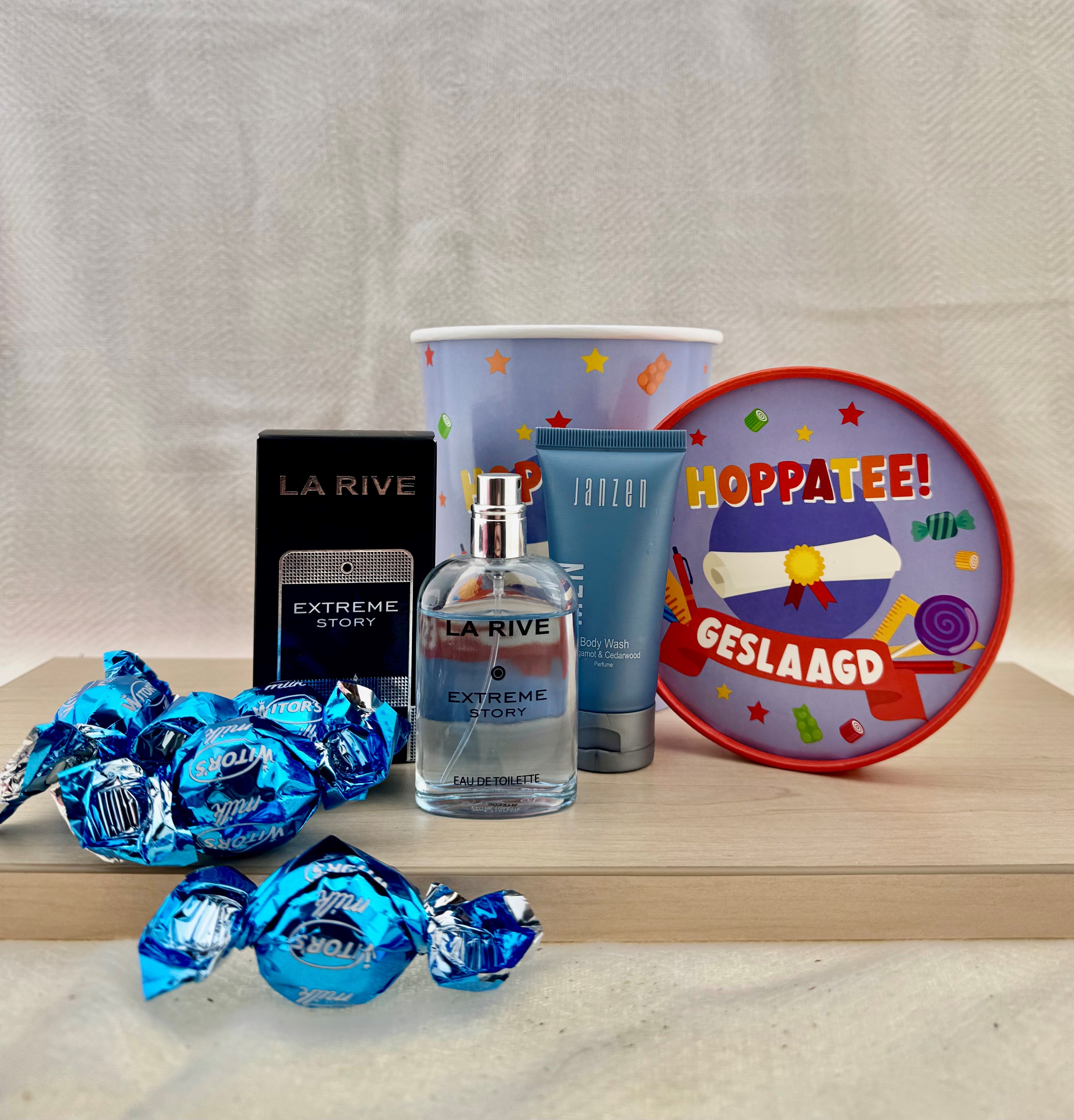 Verras de geslaagde met dit stoere en stijlvolle cadeaupakket! Een complete en feestelijke samenstelling speciaal voor hem, perfect als felicitatie bij het behalen van een diploma, rijbewijs of andere mijlpaal.