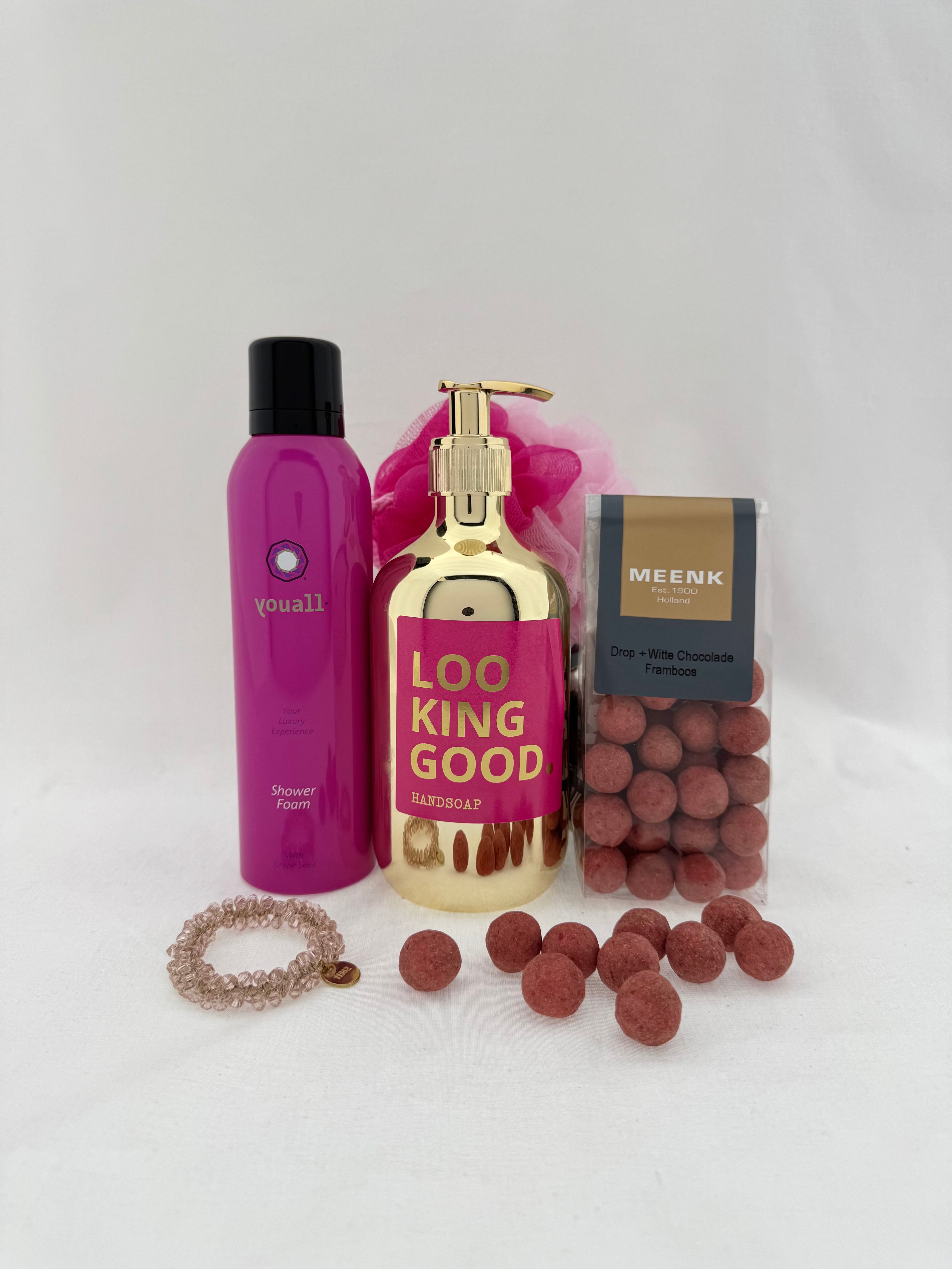 Geef een stijlvol en compleet verwenmoment cadeau! Deze luxe set combineert een heerlijke geurervaring met een vleugje zoet en een elegant accessoire.