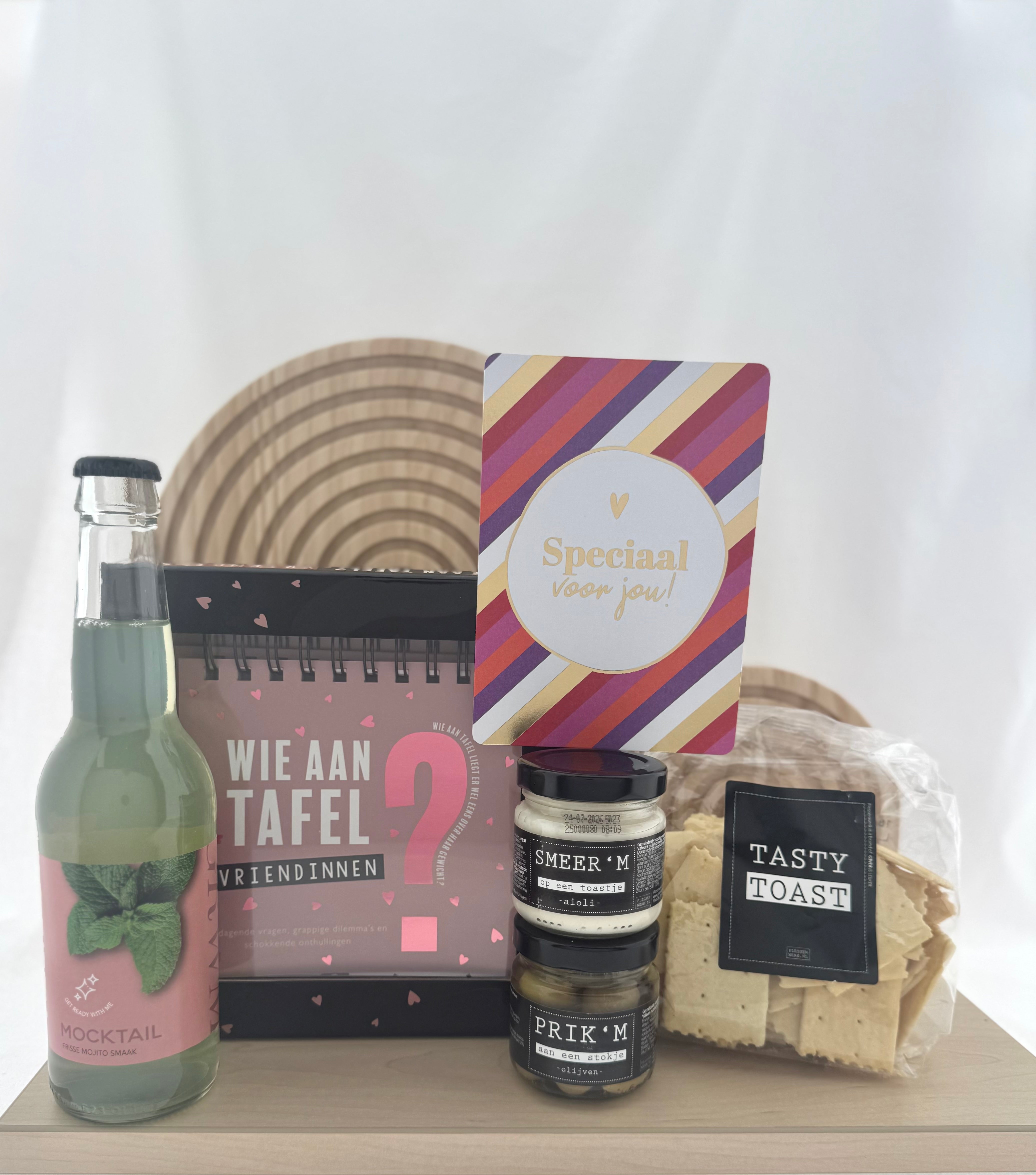 Dit pakket combineert smaakvolle borrelproducten met een vrolijk spel en een sfeervol kaartje. Ideaal om samen van te genieten en een moment extra speciaal te maken!