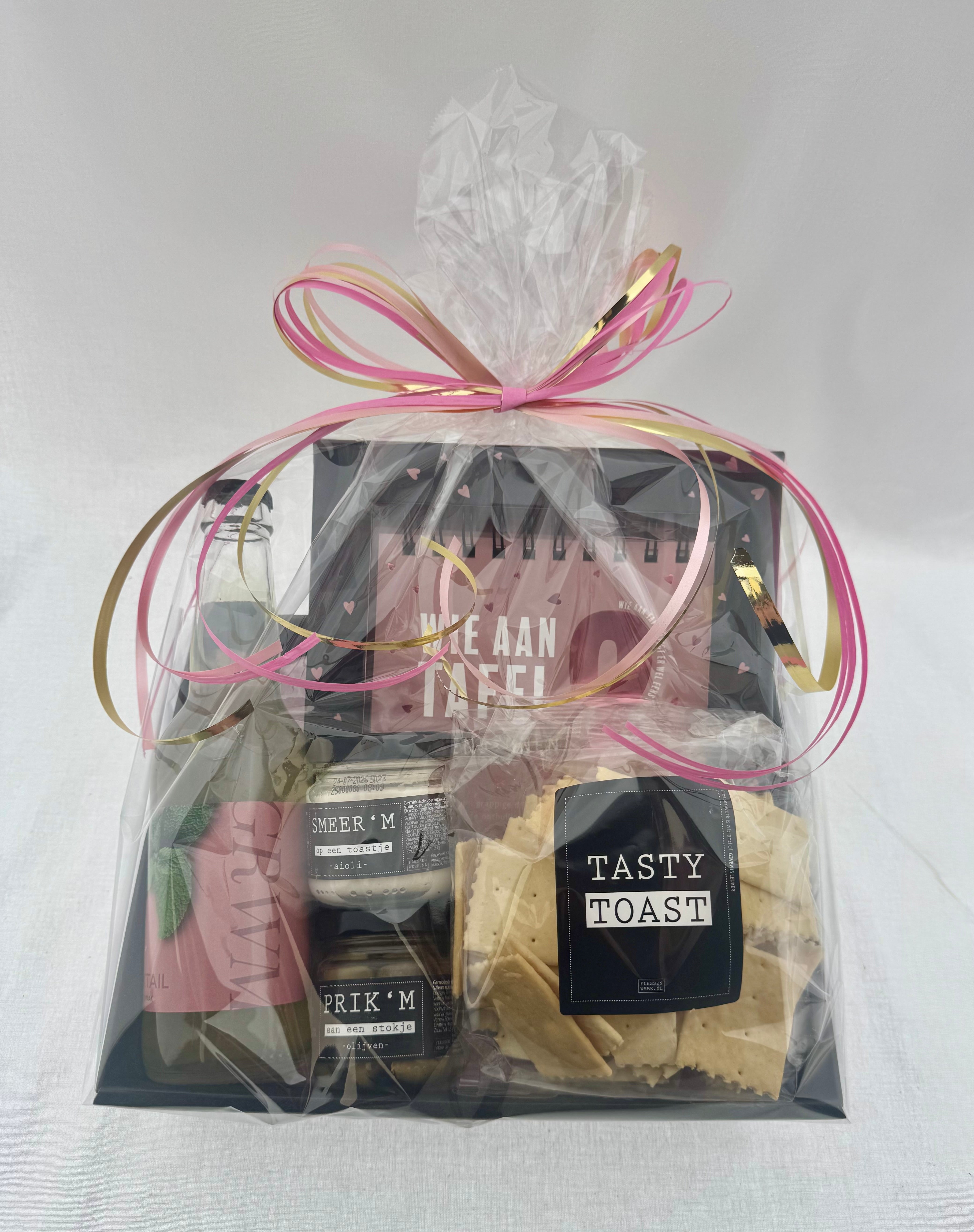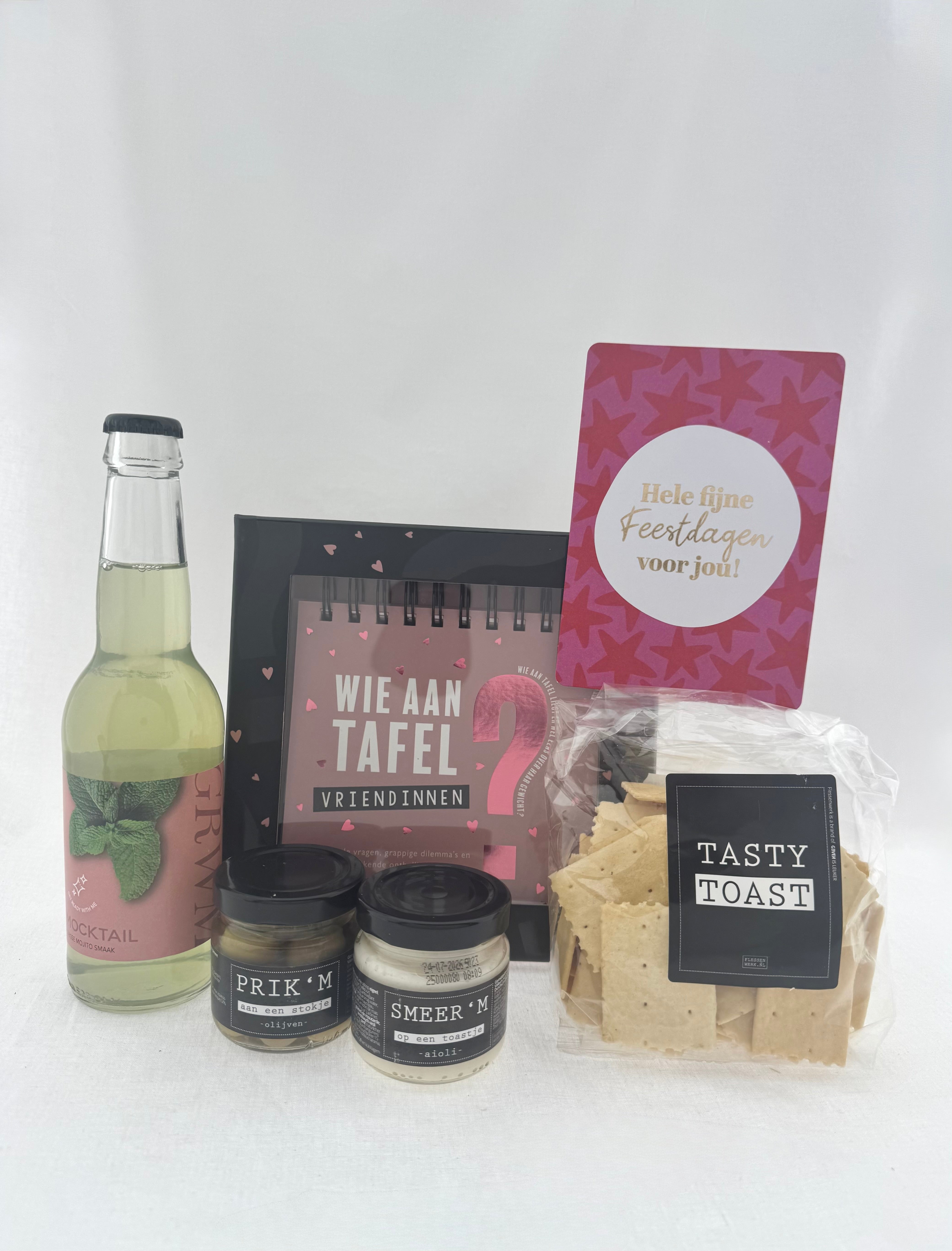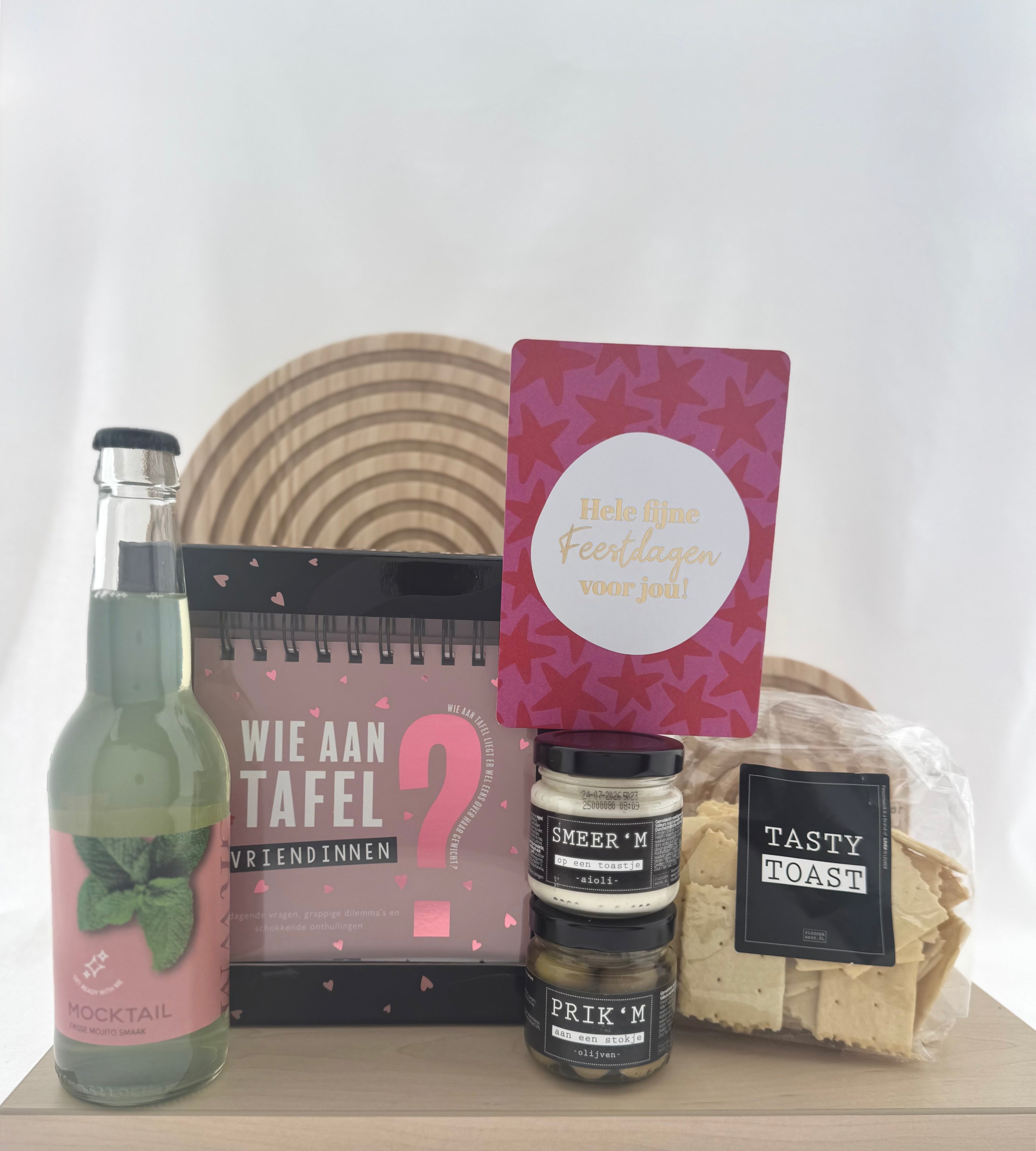 Het pakket combineert smaakvolle borrelproducten met een vrolijk spel en een feestelijke kaart, ideaal om samen van te genieten!