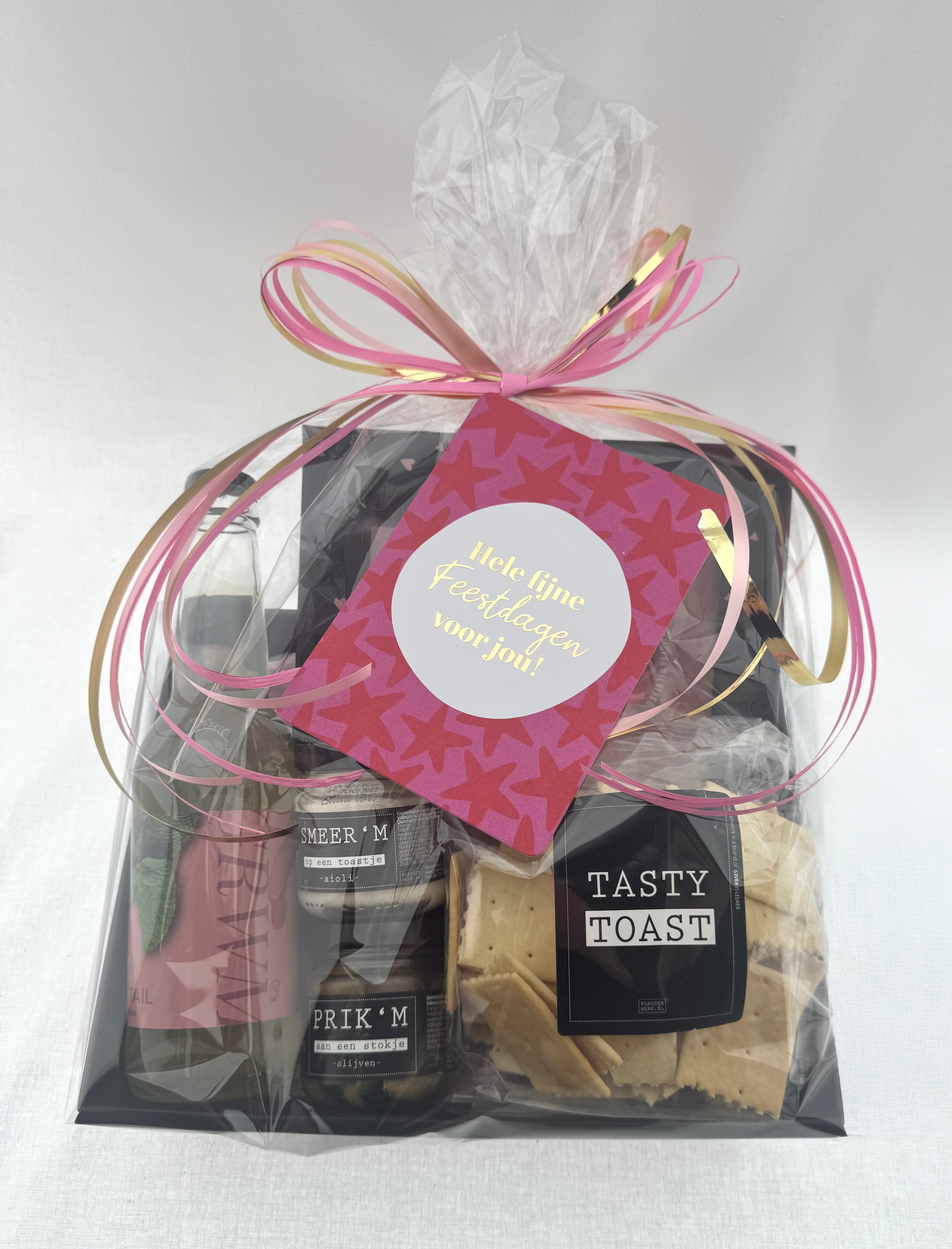 Verras iemand met dit feestelijke verwenpakket vol lekkers én gezelligheid! Dit stijlvolle cadeau is perfect voor de feestdagen!