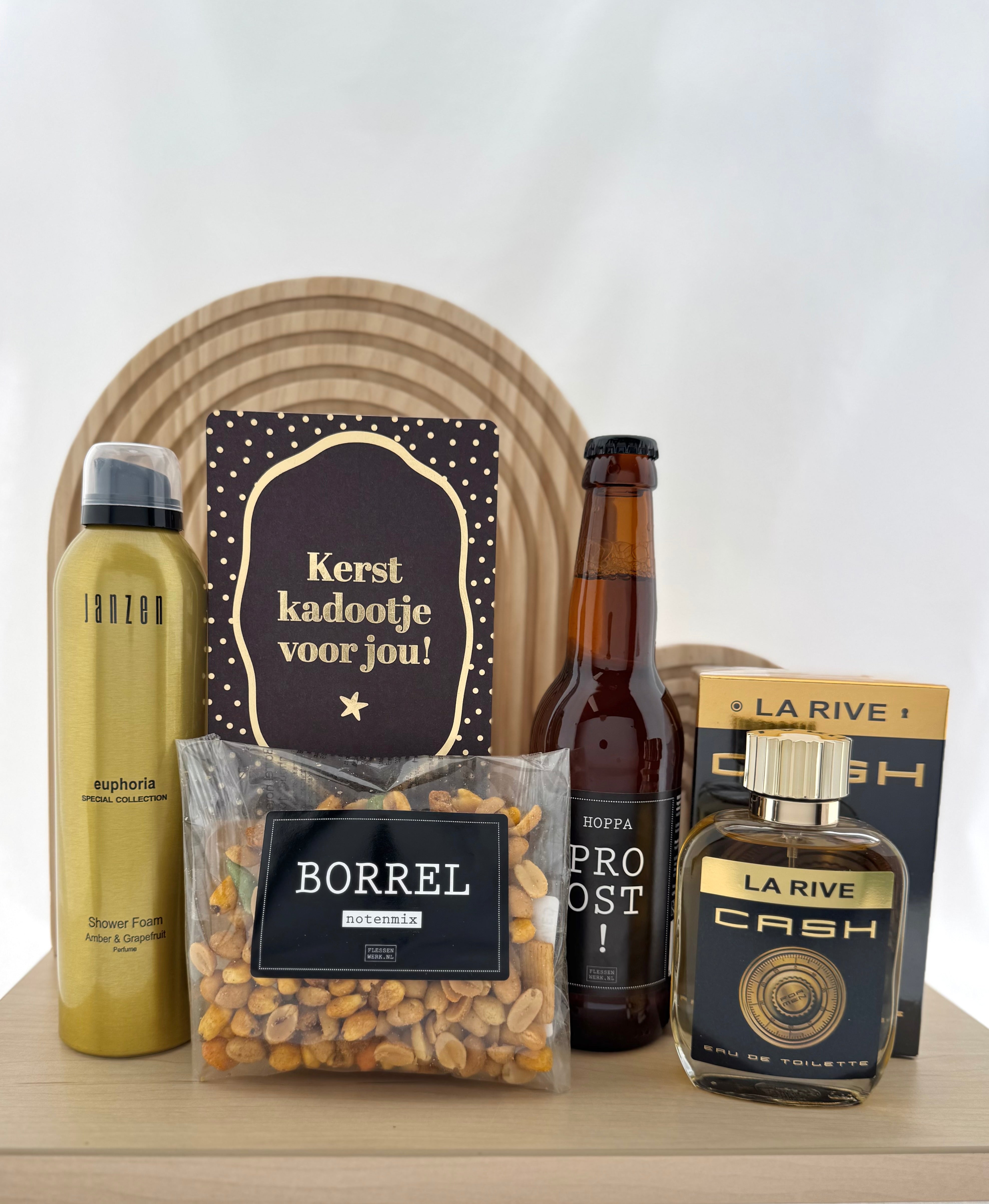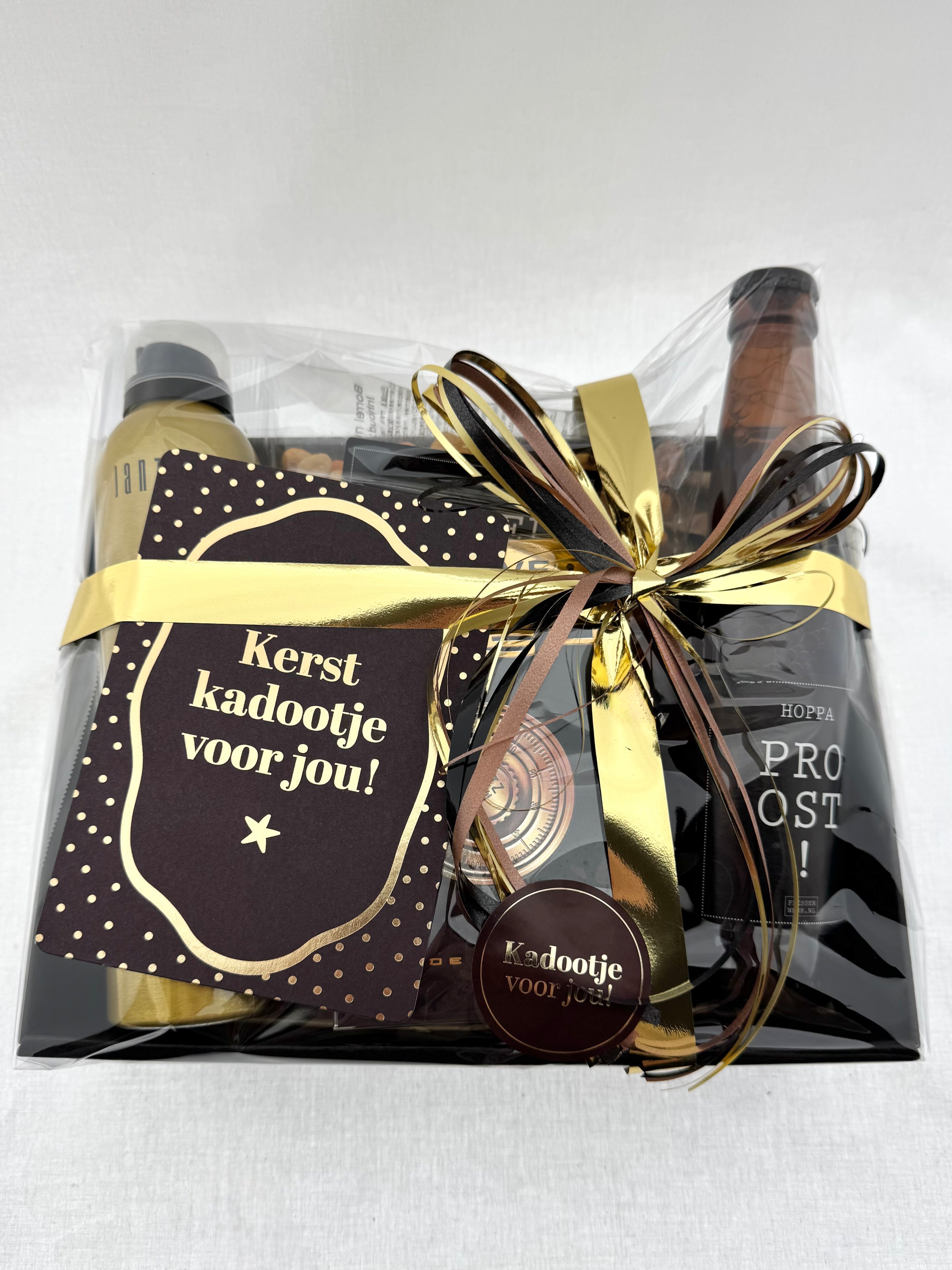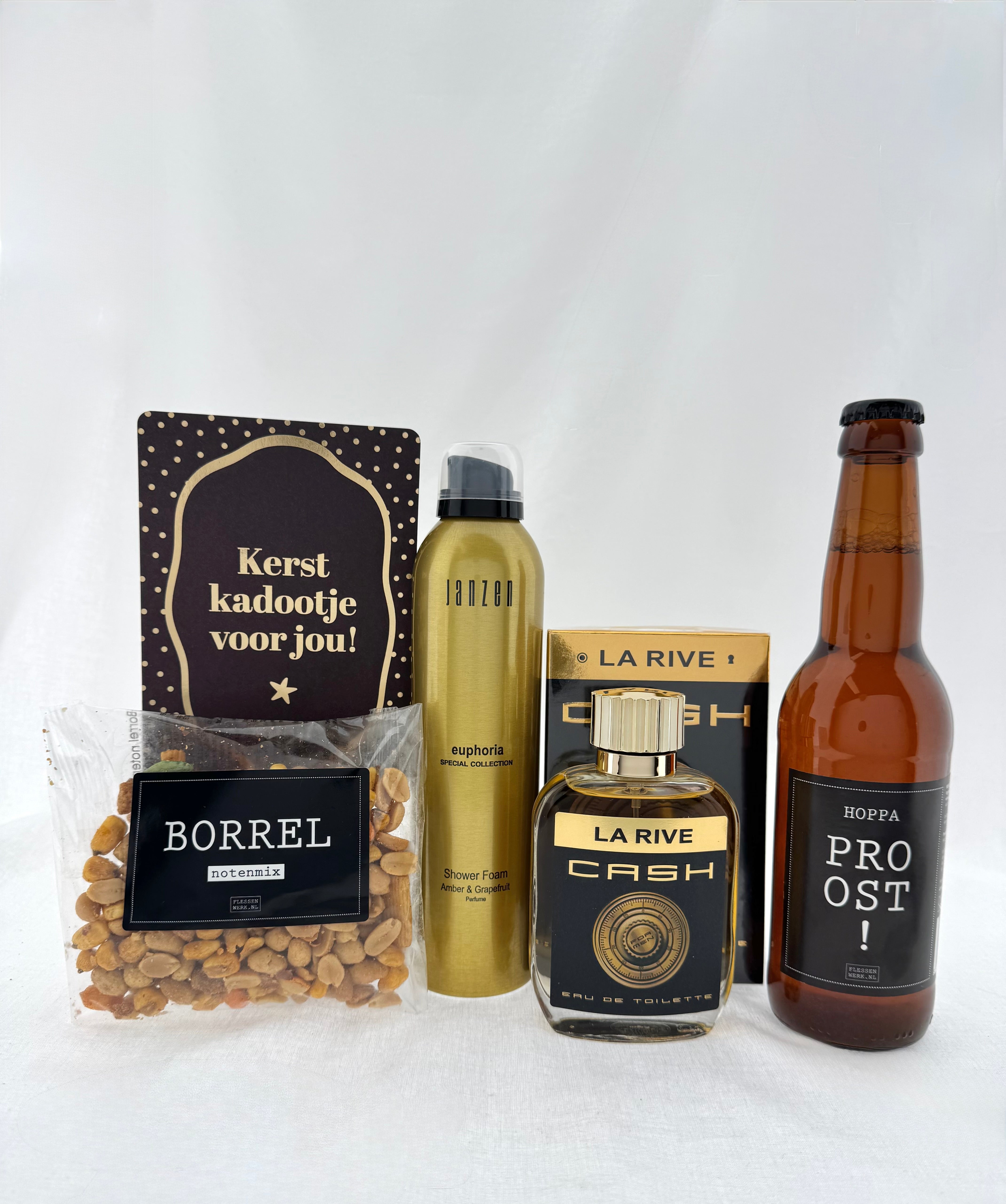 Een stijlvol samengesteld cadeaupakket voor hem, gevuld met luxe verzorging, een geurige eau de toilette, iets lekkers voor erbij én een speciaal biertje om te proosten!