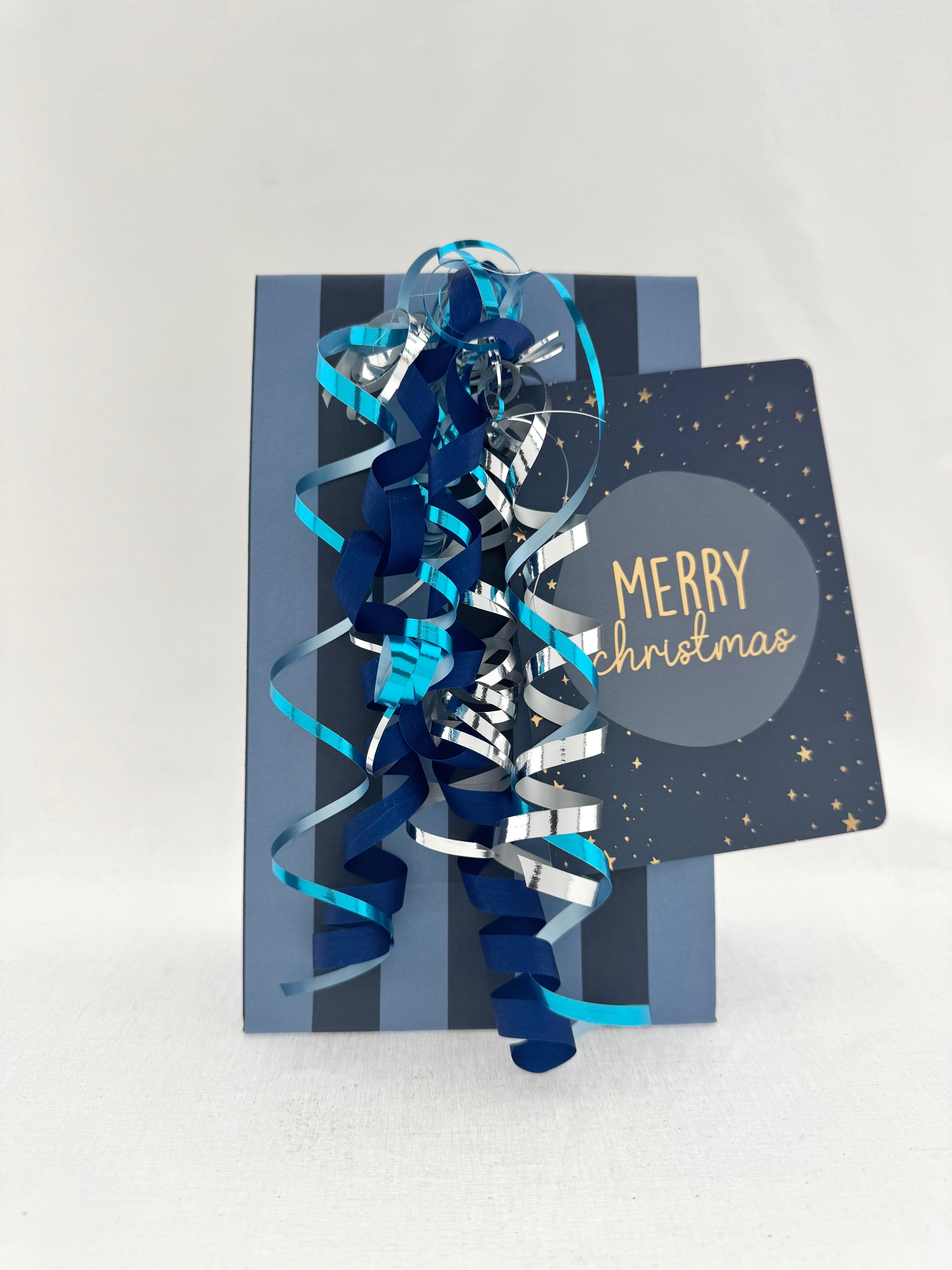 ❥ Geschenkverpakking: luxe blauwe cadeaudoos, feestelijk afgewerkt met glanzende linten in blauw en zilver.