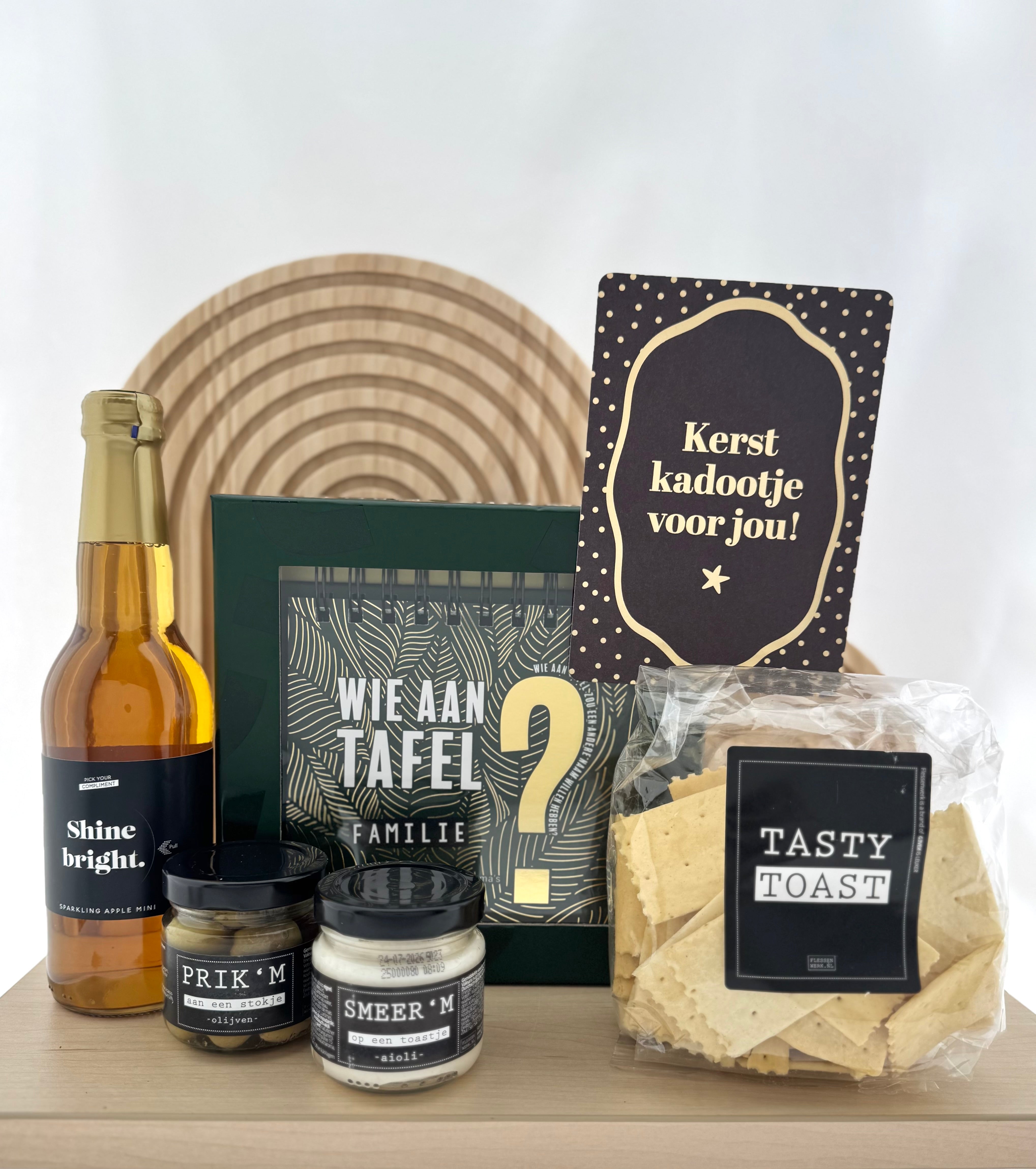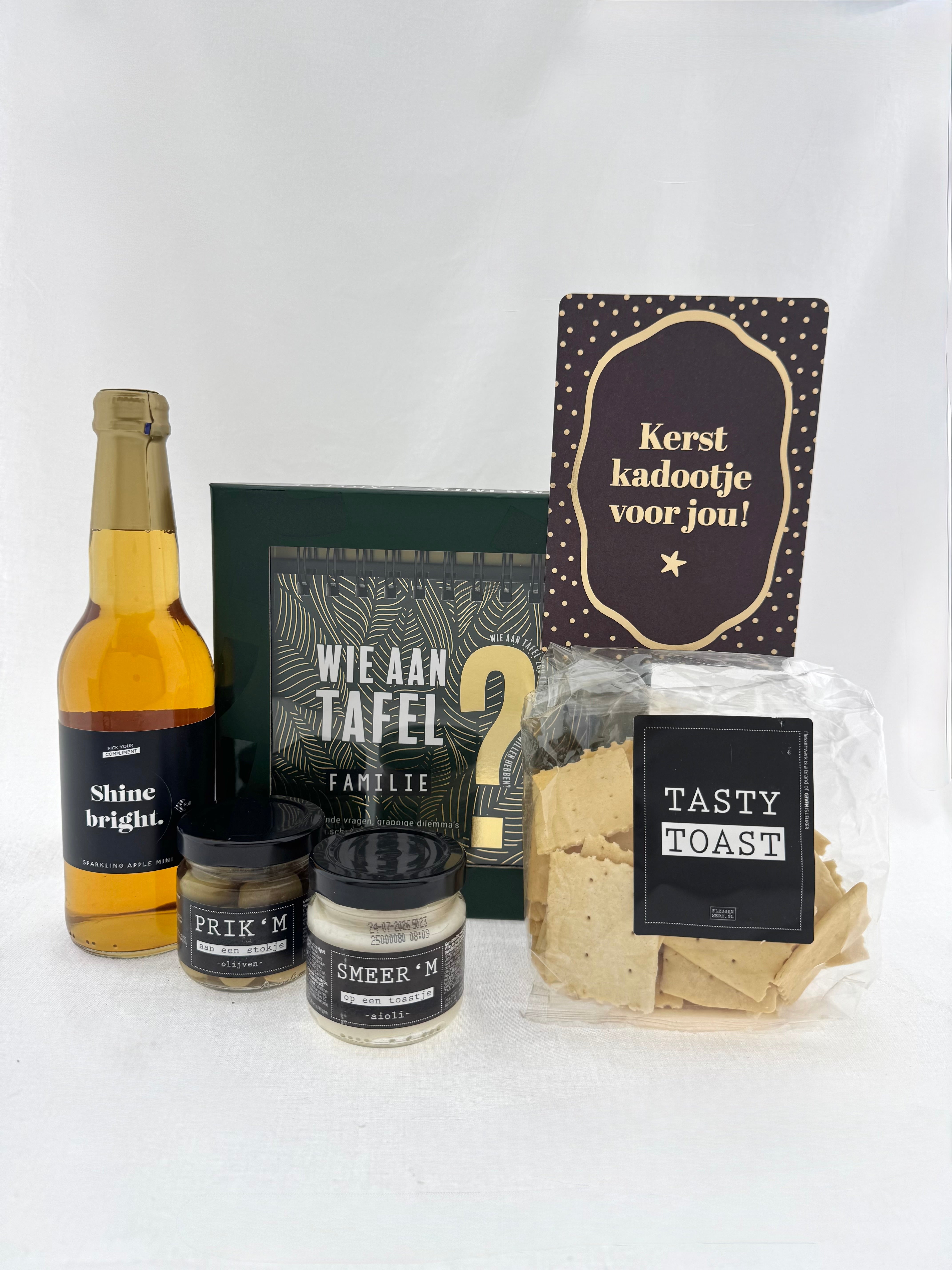 Breng familie en vrienden bij elkaar met dit feestelijke en smaakvolle kerstpakket! Dit luxe cadeau bevat alles voor een gezellige borrelavond én een speels moment aan tafel.