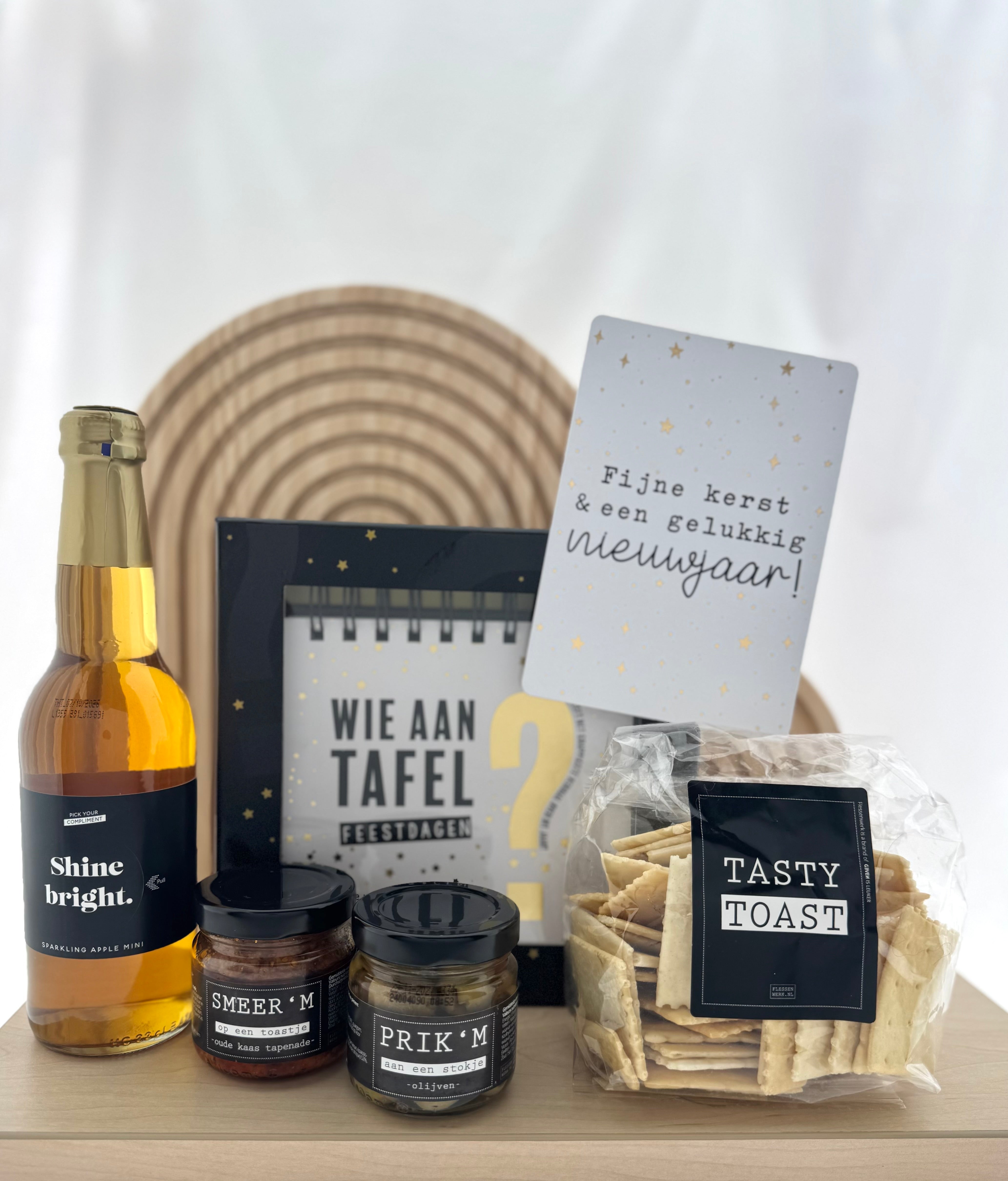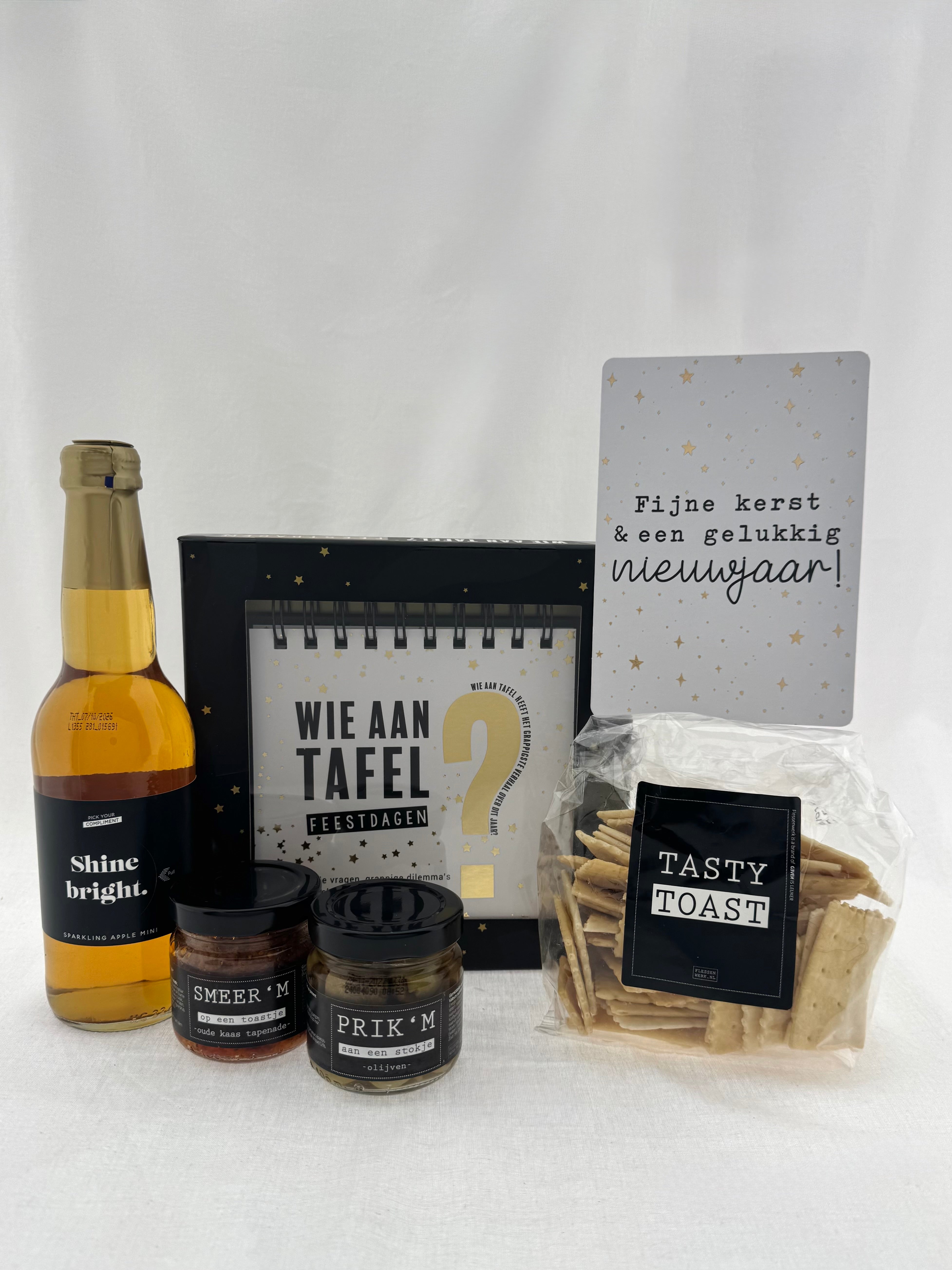 Een gezellig en smaakvol cadeaupakket voor de feestdagen! Deze set brengt mensen samen aan tafel met lekkere borrelhapjes, een feestelijk drankje en een speels tafelspel. Perfect als verrassing voor kerst.