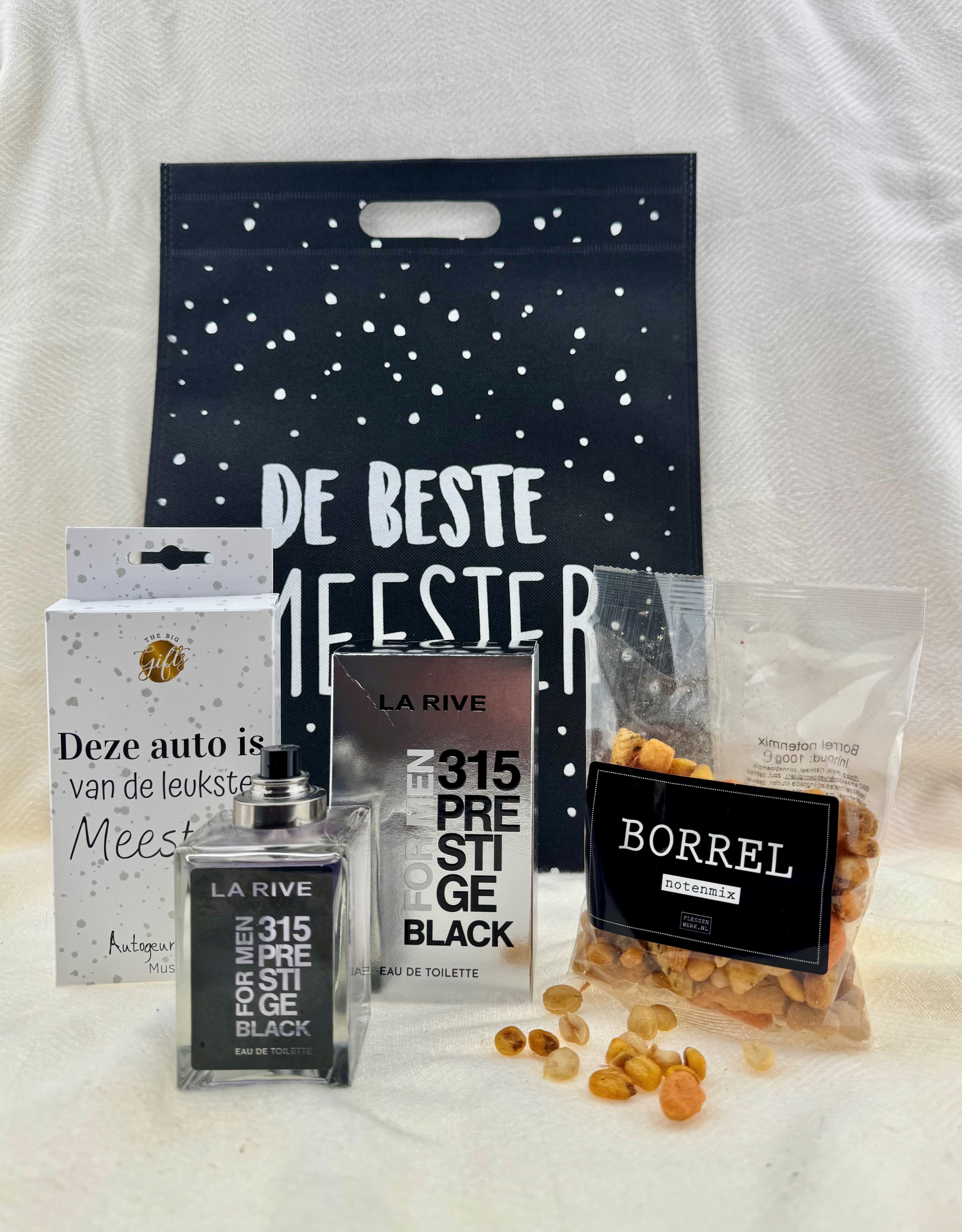 Verras jouw meester met dit stoere, stijlvolle en feestelijke cadeausetje, een perfecte afsluiter van het schooljaar of als blijk van waardering! Deze luxe giftbag bevat een combinatie van geur, snack en een grappige attentie, allemaal verpakt in een stijlvolle tas met de opdruk "De Beste Meester".