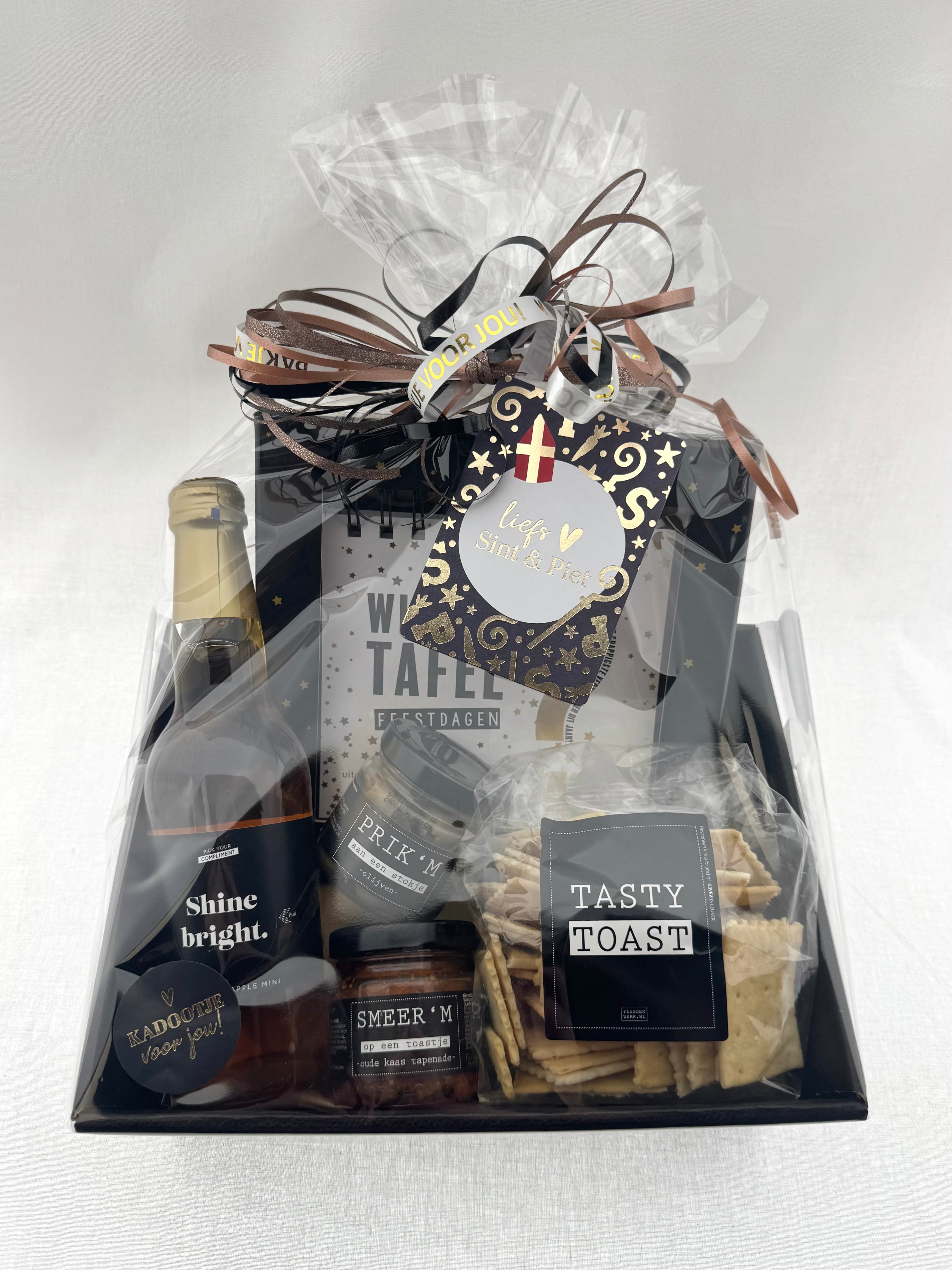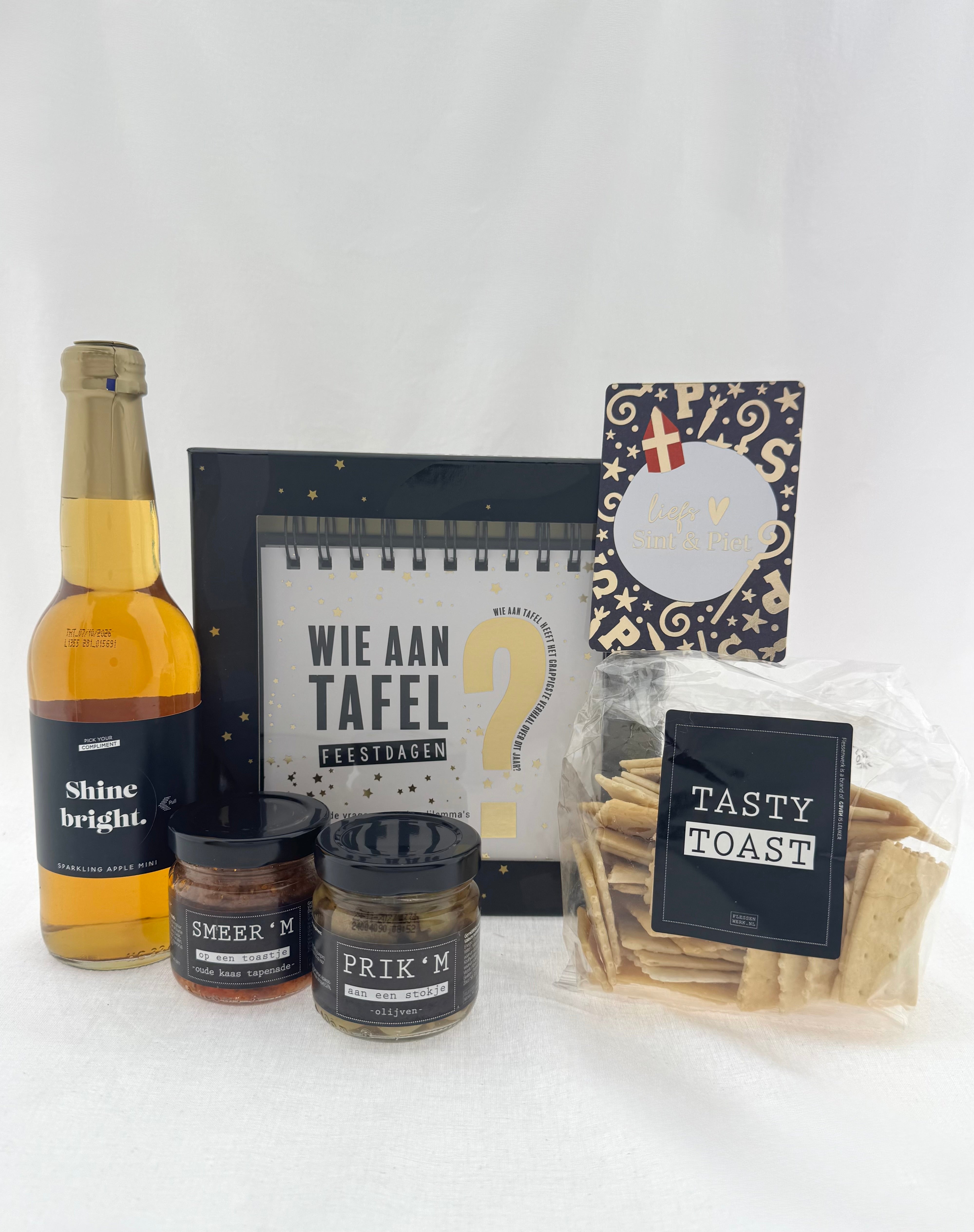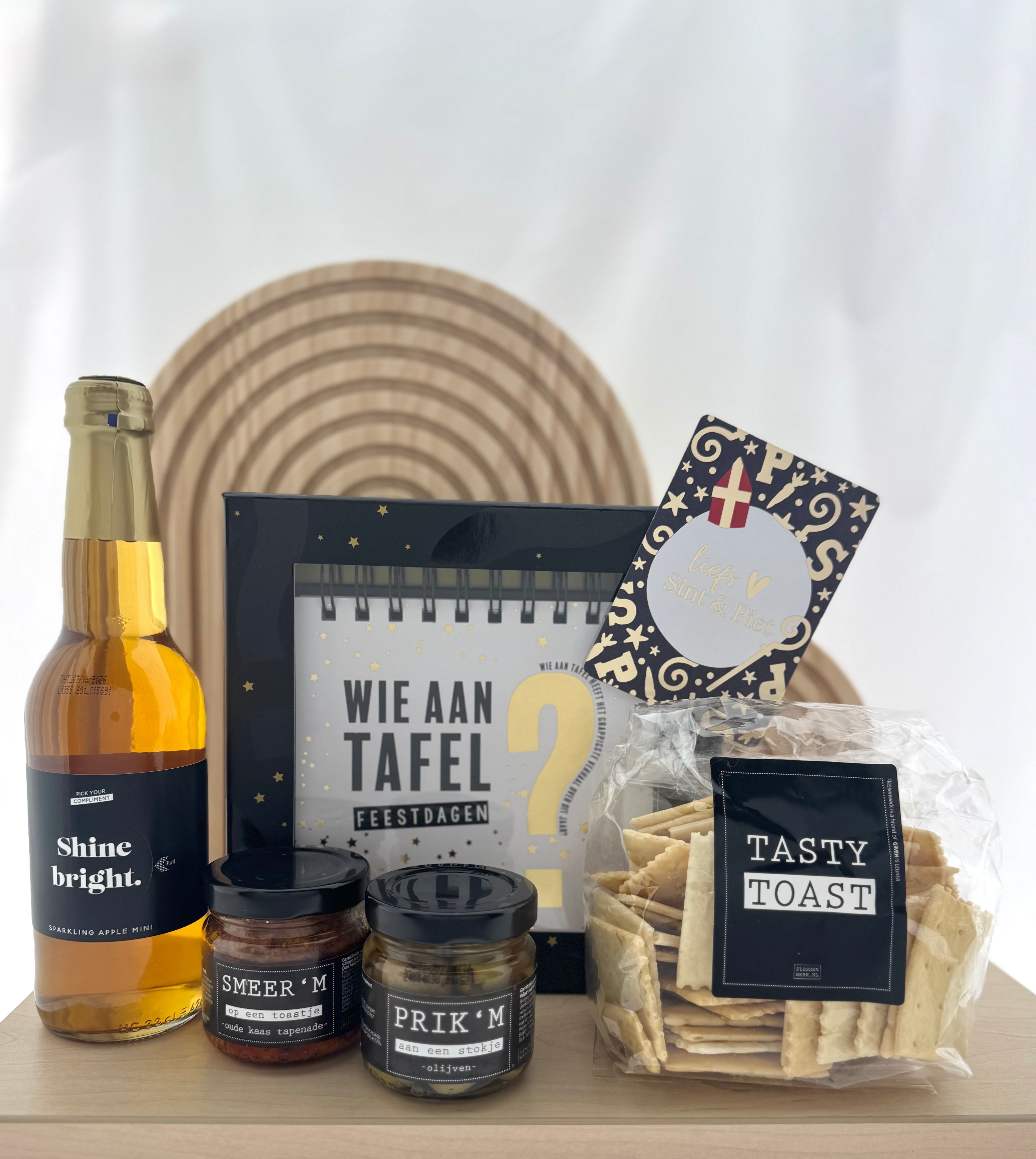 Een gezellig en smaakvol cadeaupakket voor de feestdagen! Deze set brengt mensen samen aan tafel met lekkere borrelhapjes, een feestelijk drankje en een speels tafelspel. Perfect als verrassing van Sint & Piet.