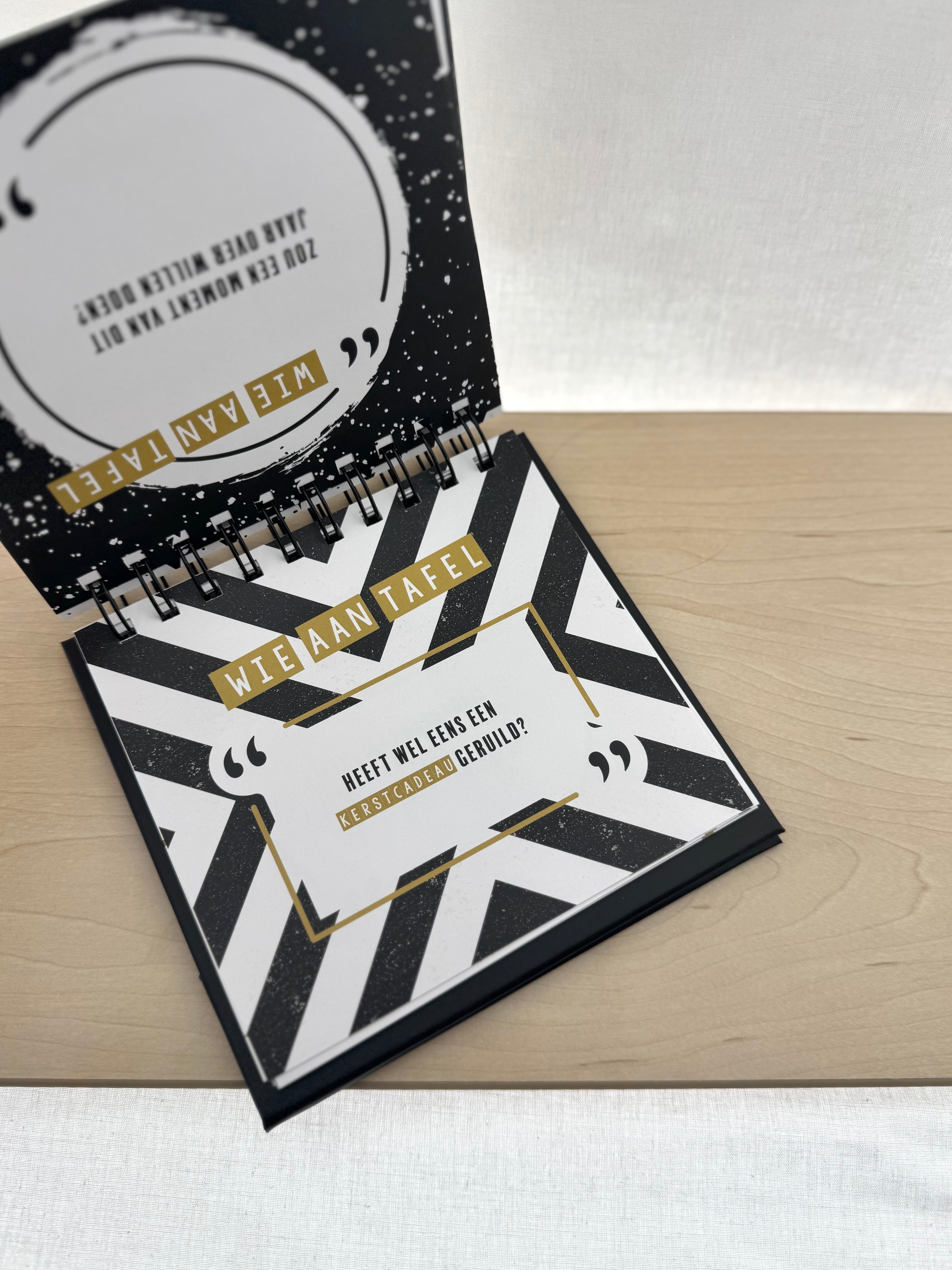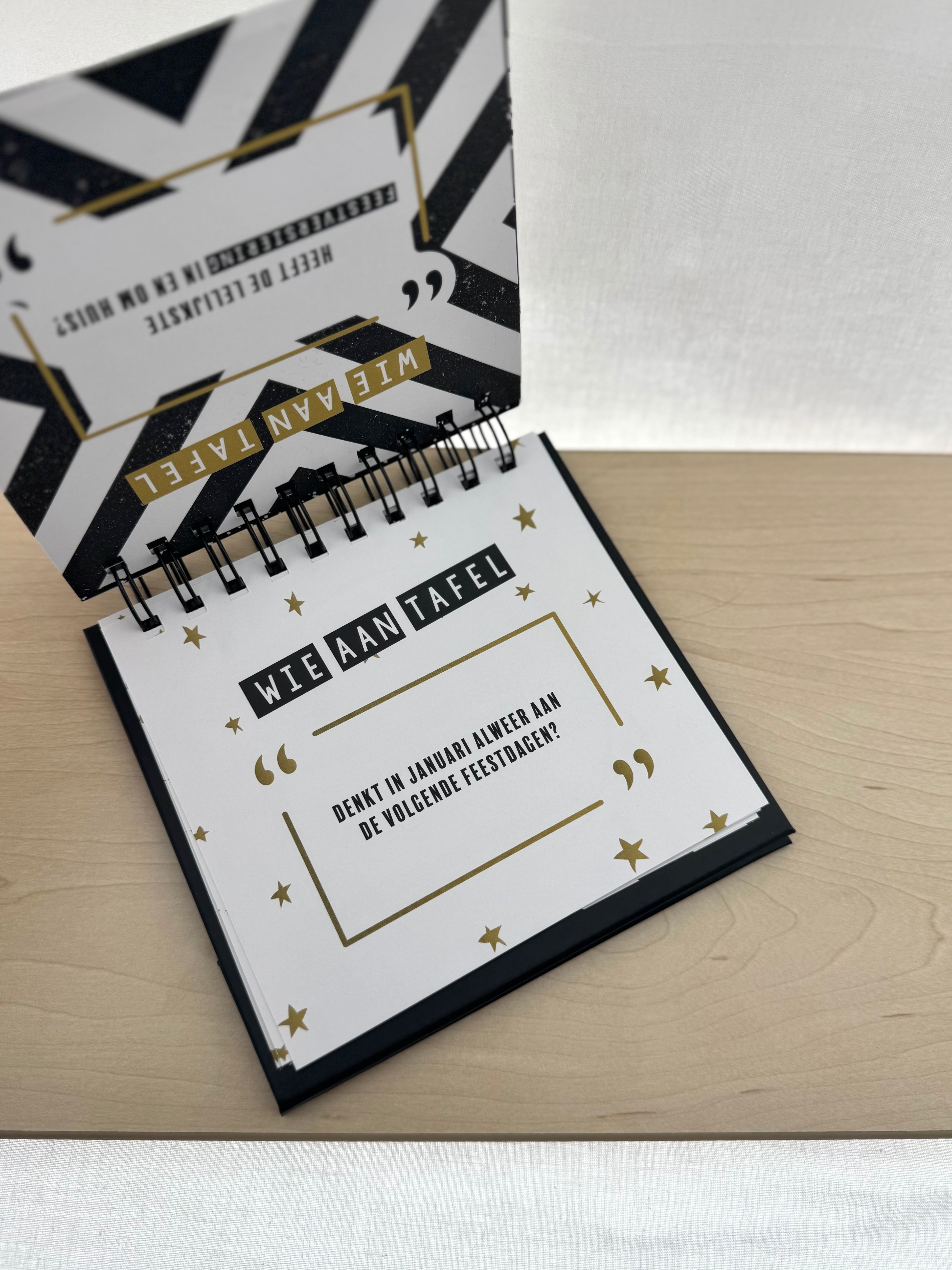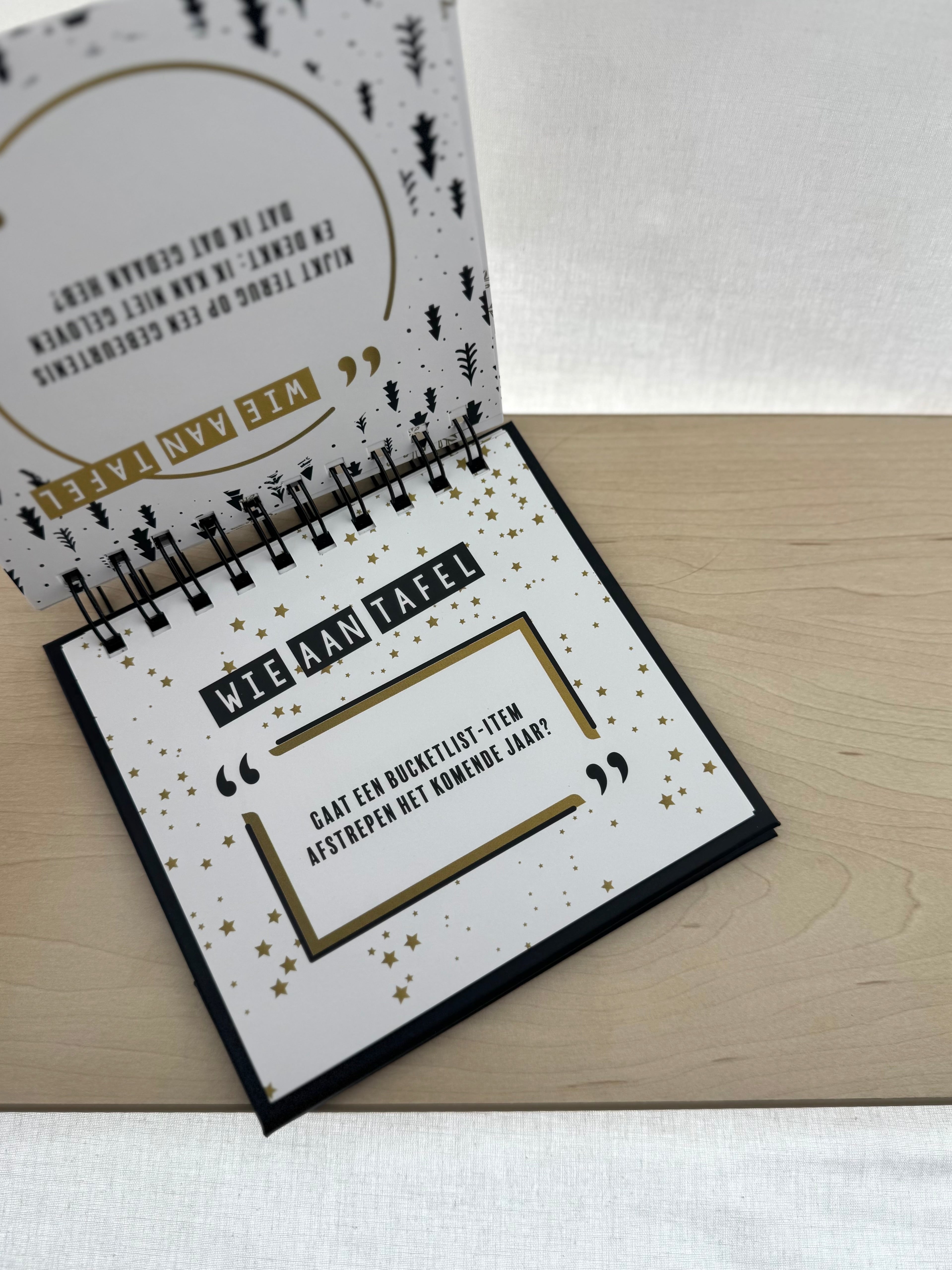 ❥ Wie aan tafel? Feestdagen-editie: Een vrolijk tafelspel met vragen en opdrachten voor tijdens de feestdagen. Zorgt voor gezelligheid en leuke gesprekken tijdens het diner.
