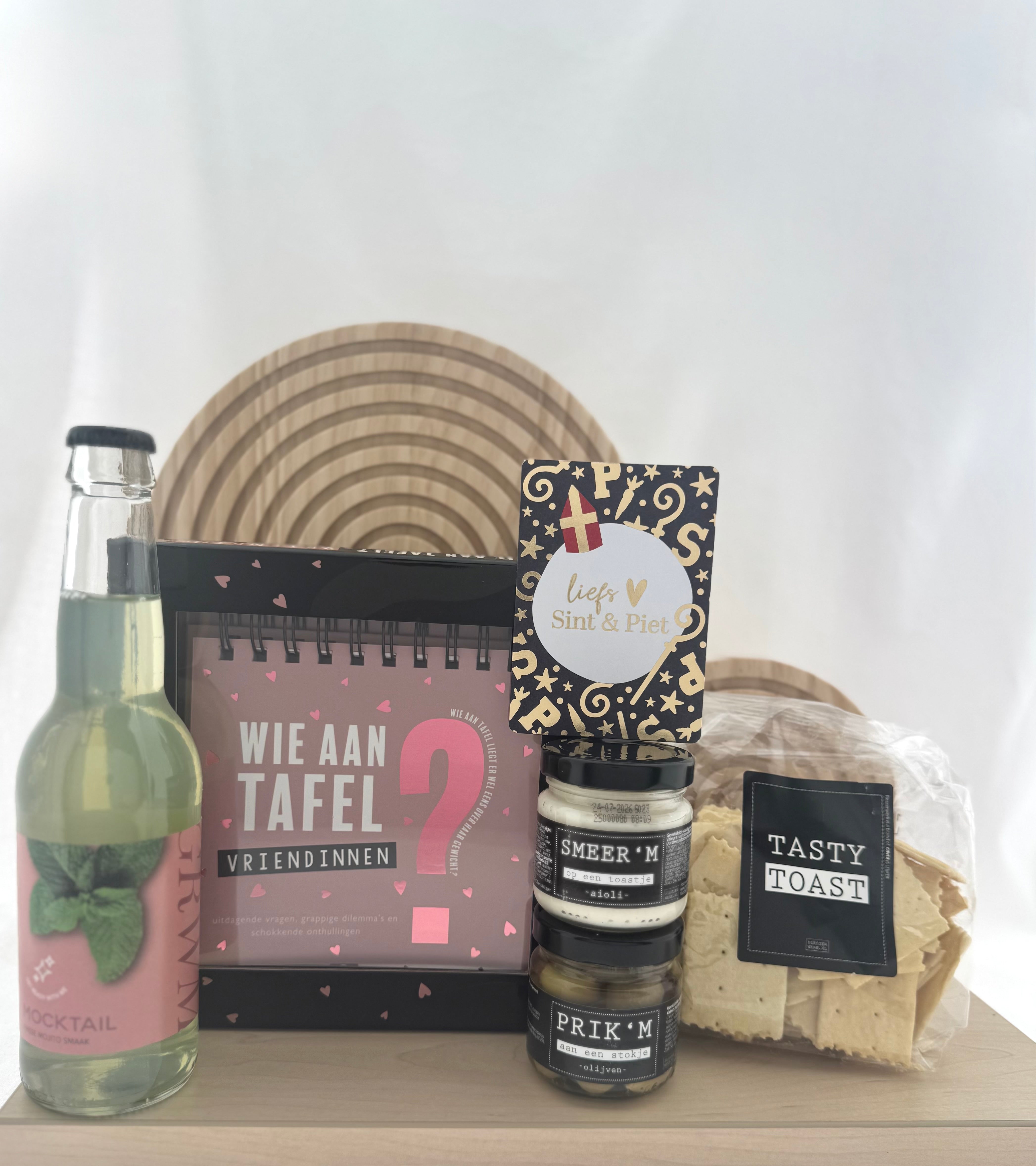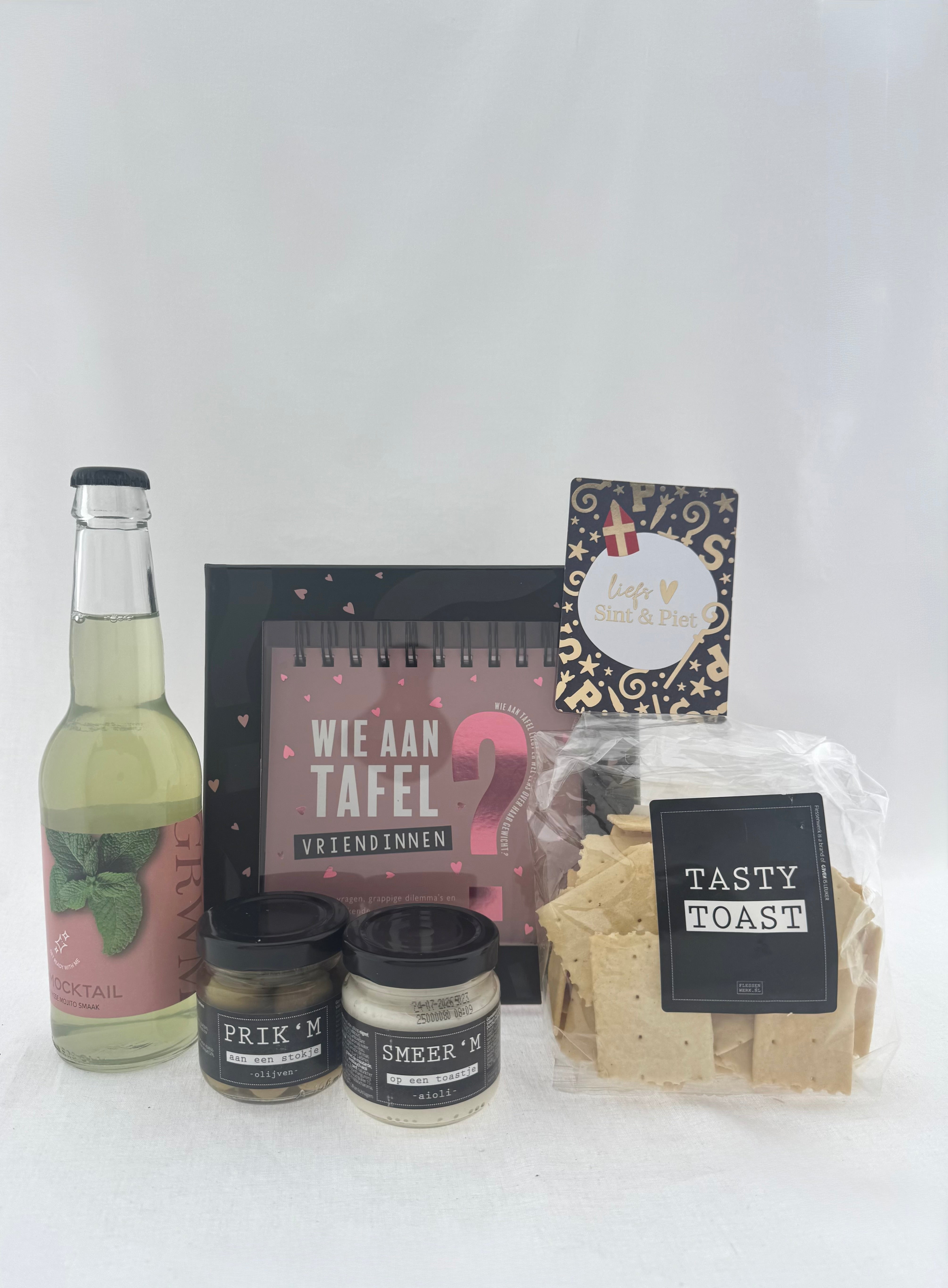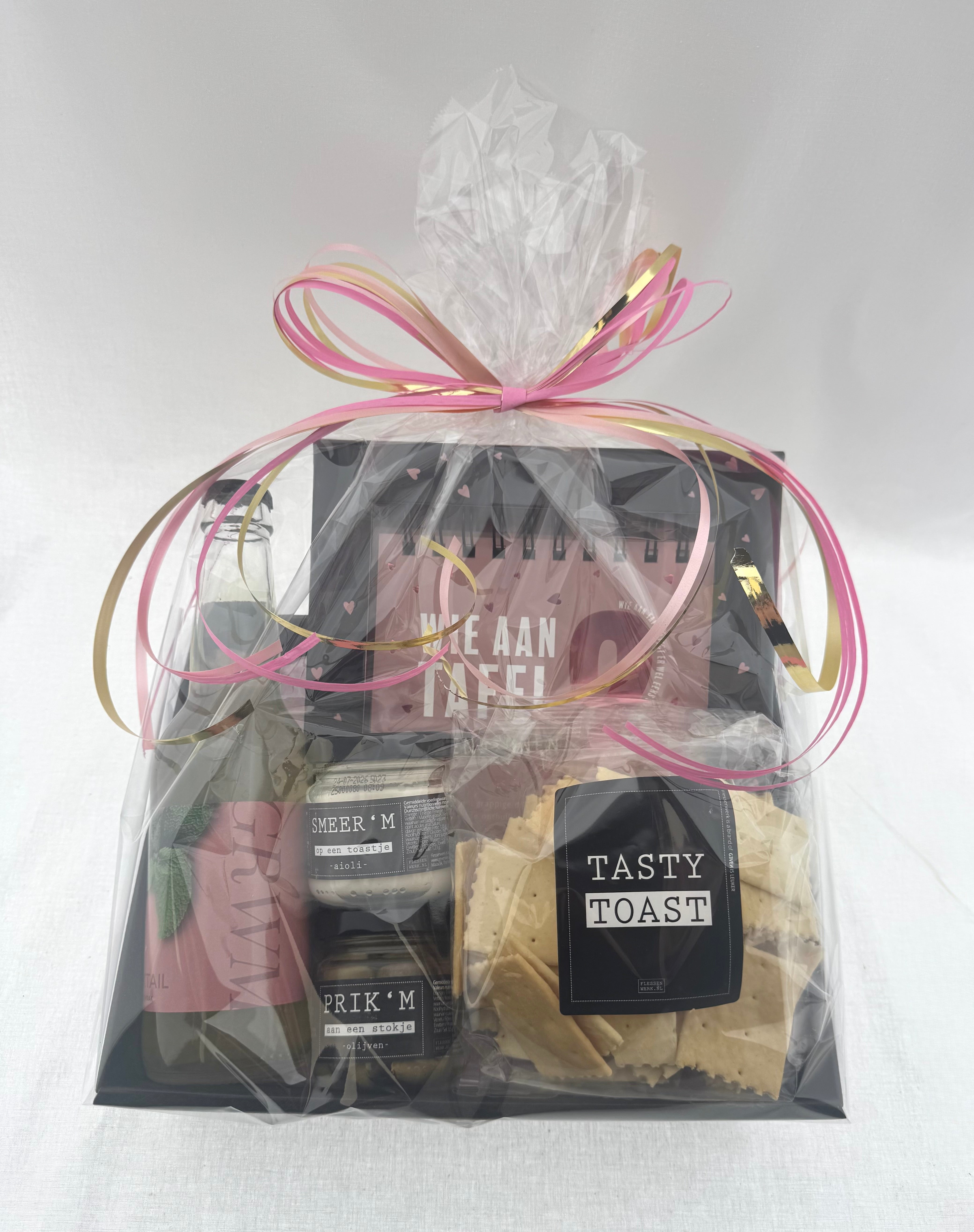 Het pakket combineert smaakvolle borrelproducten met een vrolijk spel en een feestelijke kaart, ideaal om samen van te genieten!