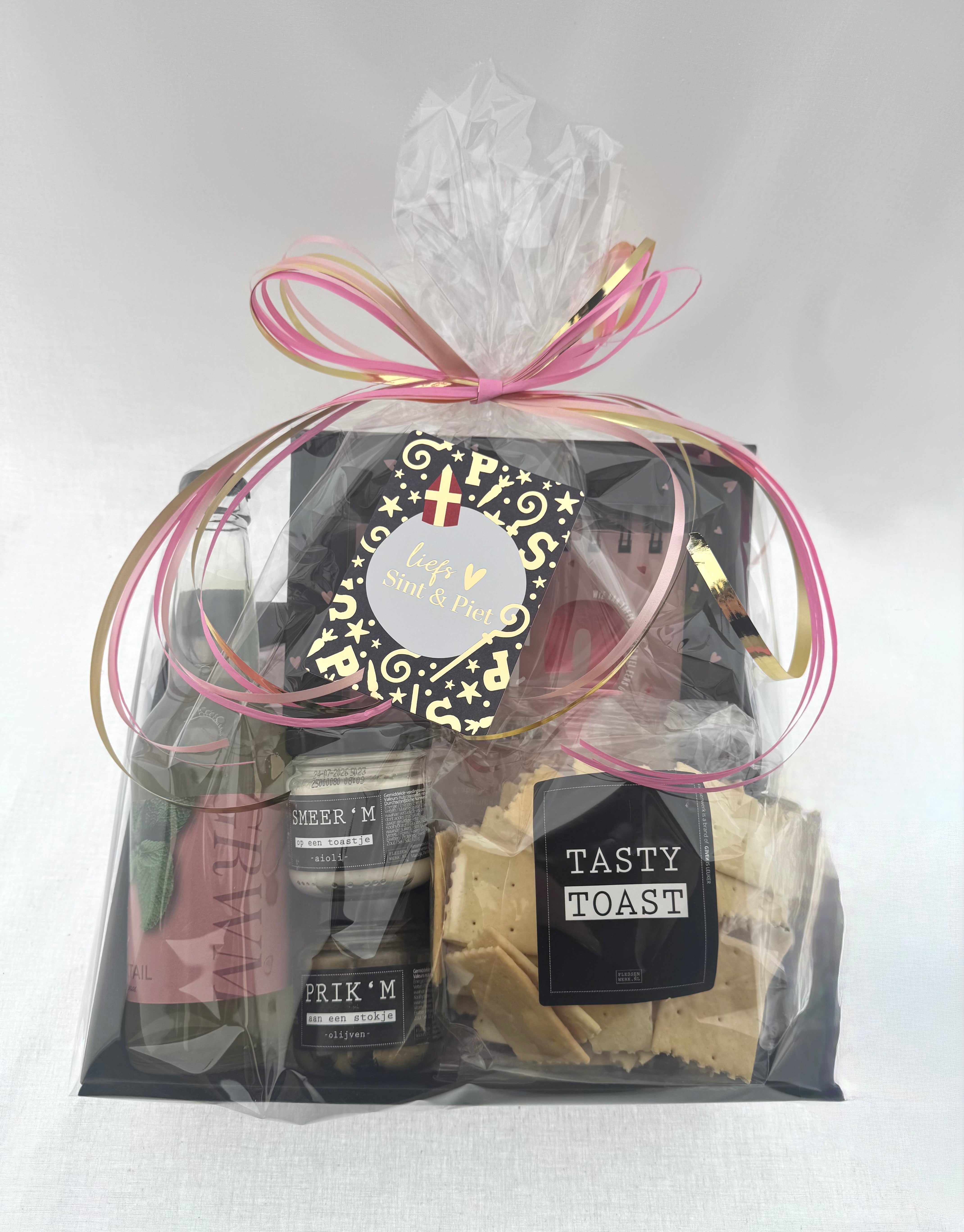 Verras iemand met dit feestelijke verwenpakket vol lekkers én gezelligheid! Dit stijlvolle cadeau is perfect voor sinterklaas!