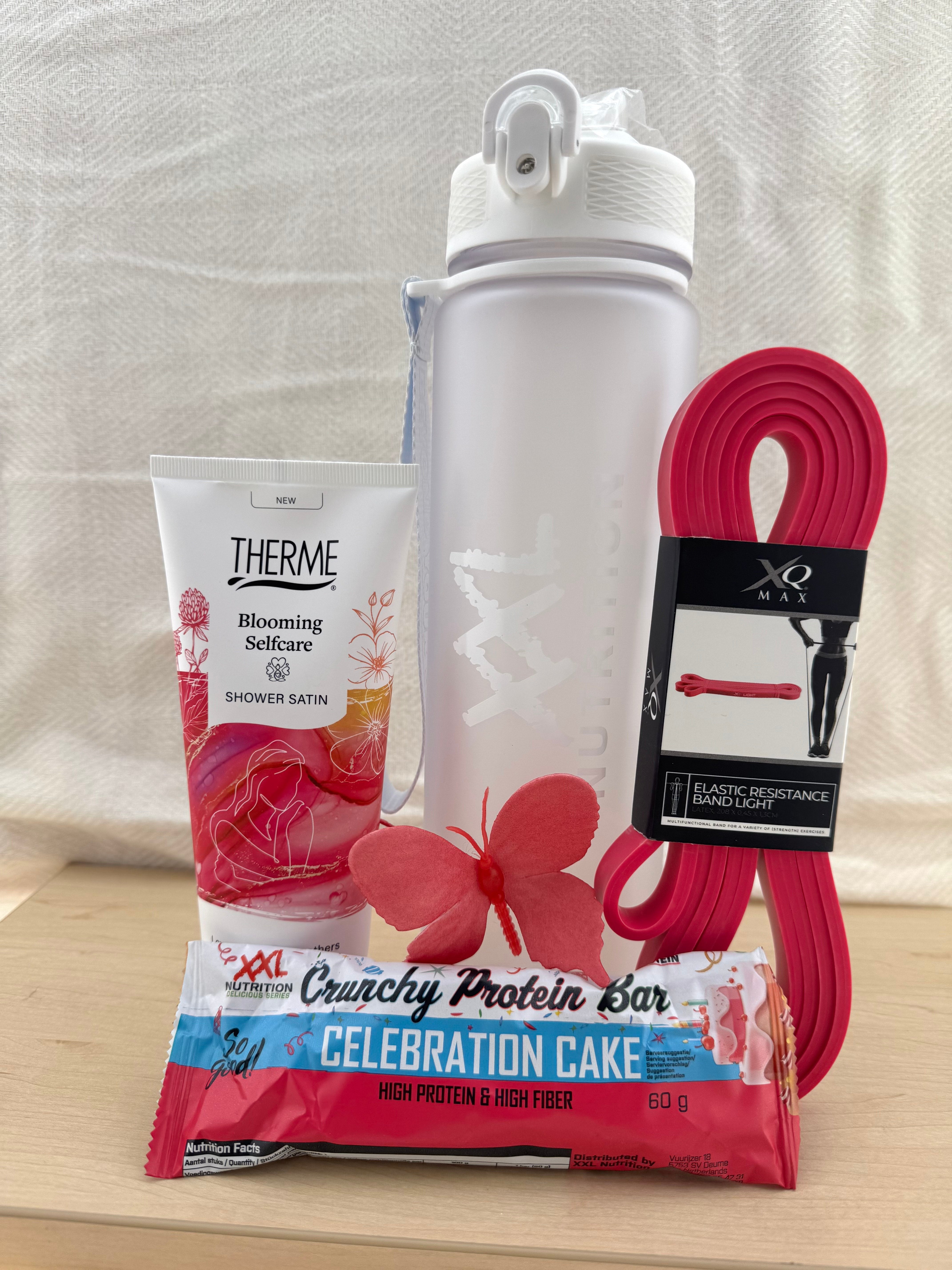 ✔️ XXL Nutrition Crunchy Protein Bar – Celebration Cake – Een heerlijke, eiwitrijke snack boordevol vezels, ideaal voor na de workout of als gezonde traktatie ✔️ Therme Douchegel- Blooming selcare, een heerlijke frisse bloemige geur voor een ontspannen verfrissende douche na het sporten.