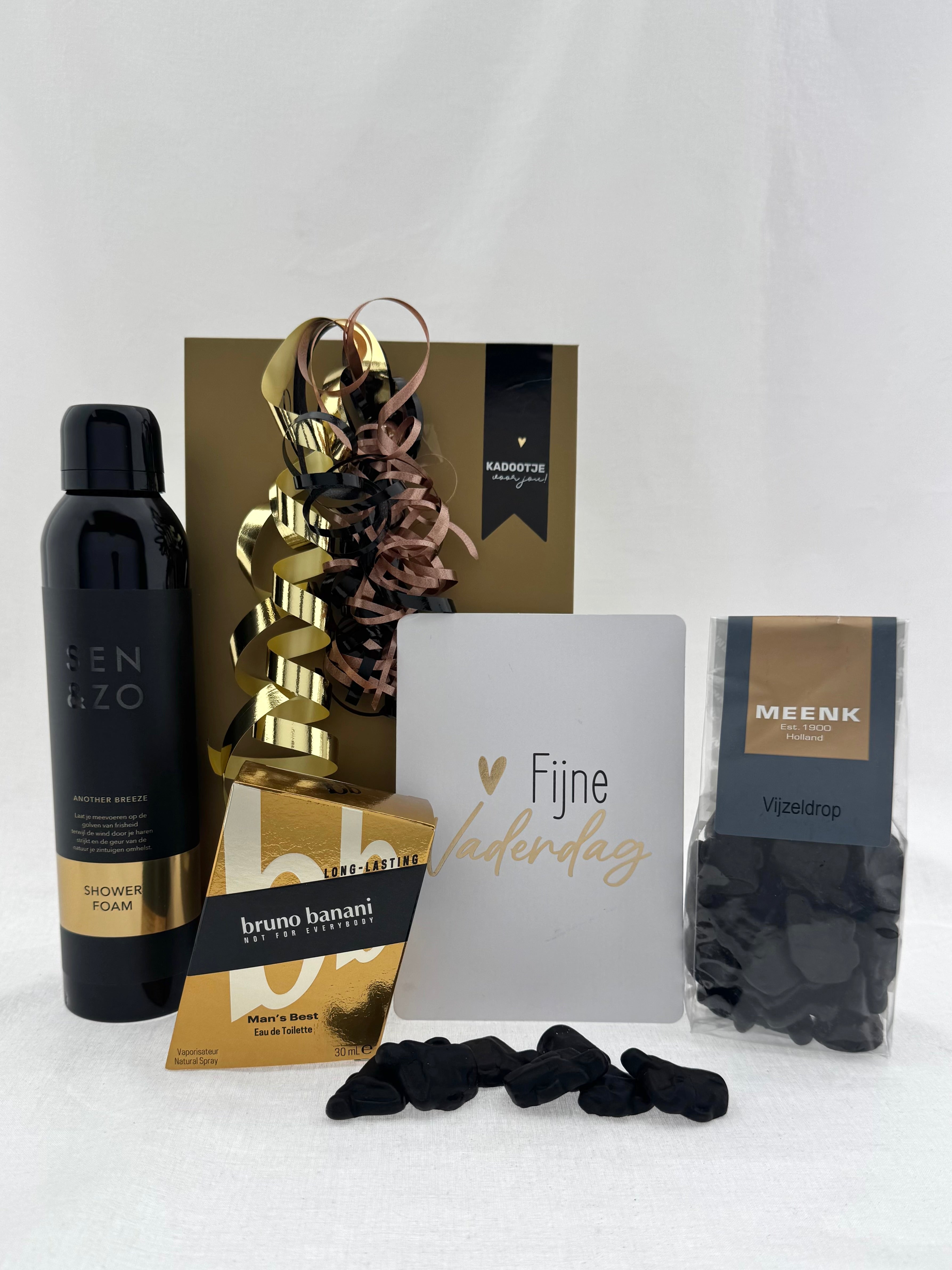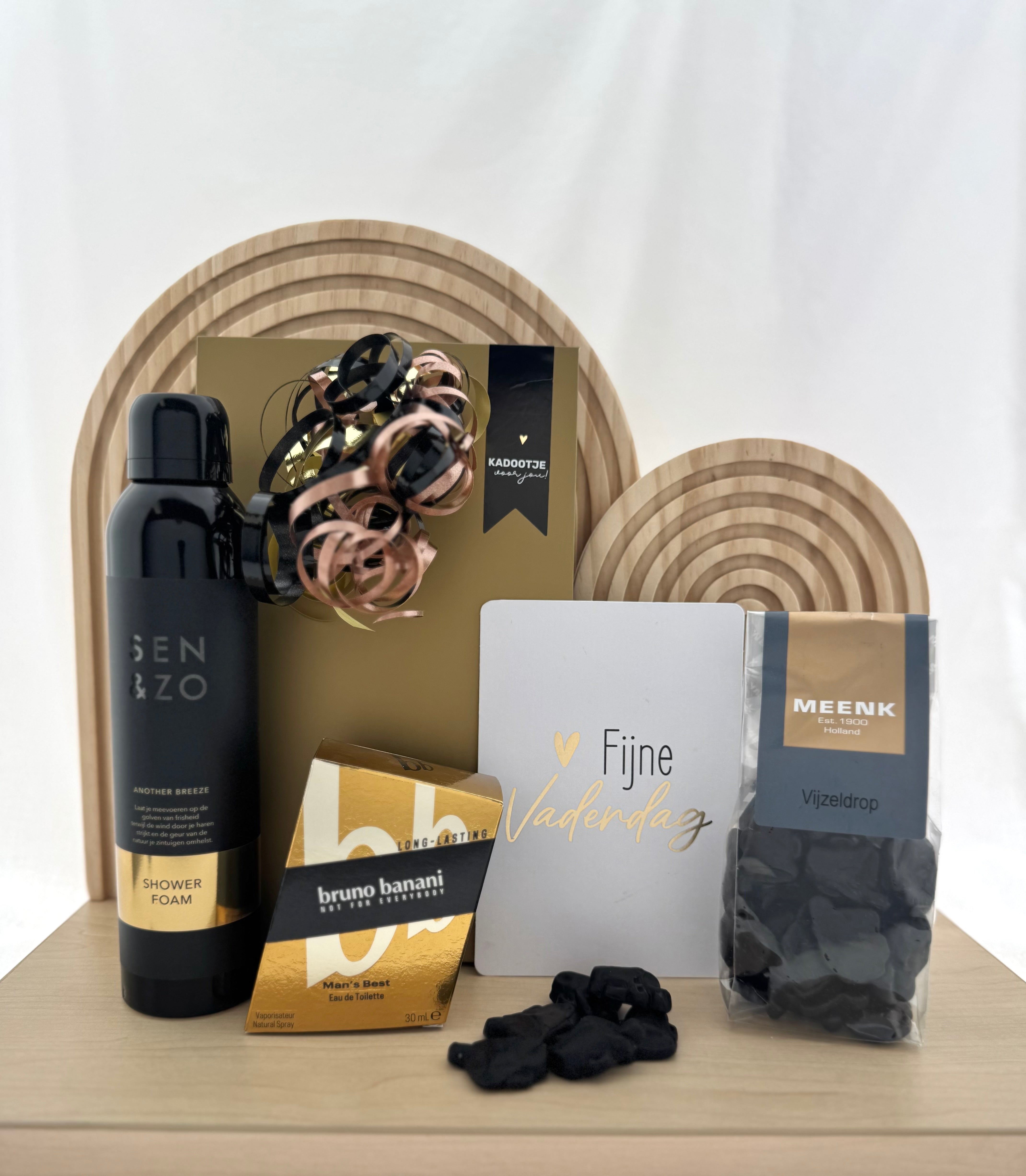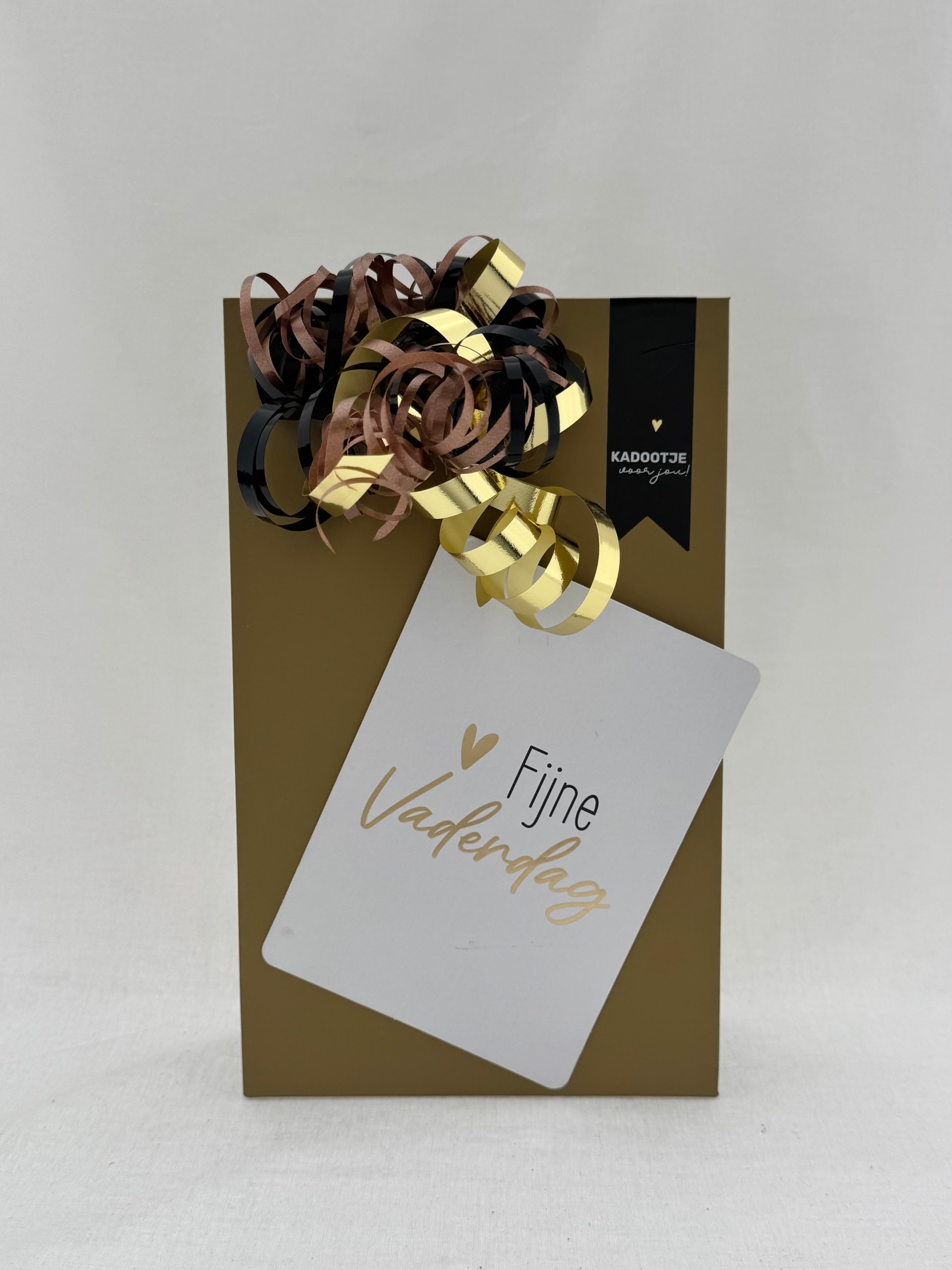 Het geheel is verpakt in een luxe goud-zwarte geschenkdoos, afgewerkt met feestelijke linten. Klaar om de liefste papa te verwennen!