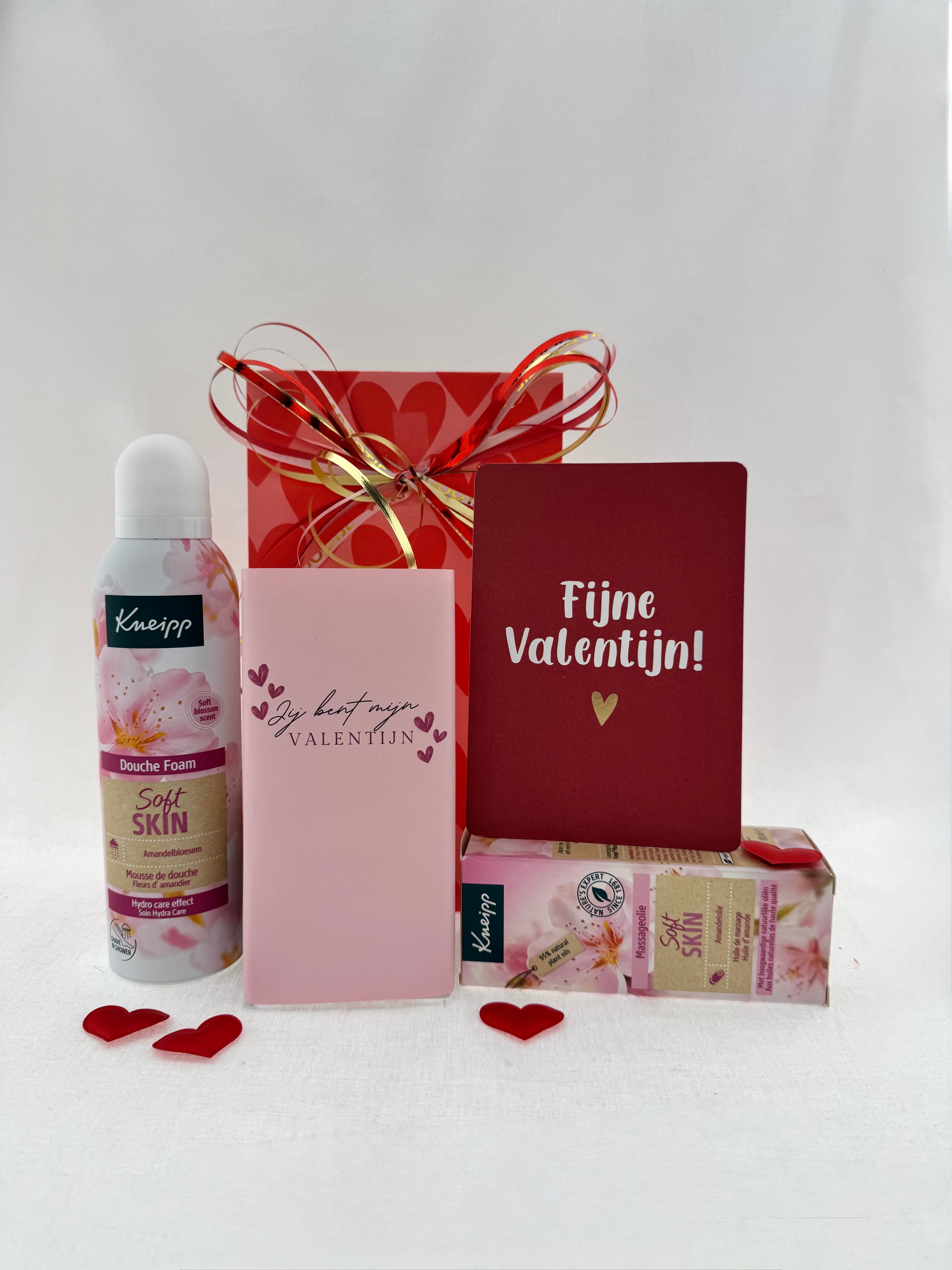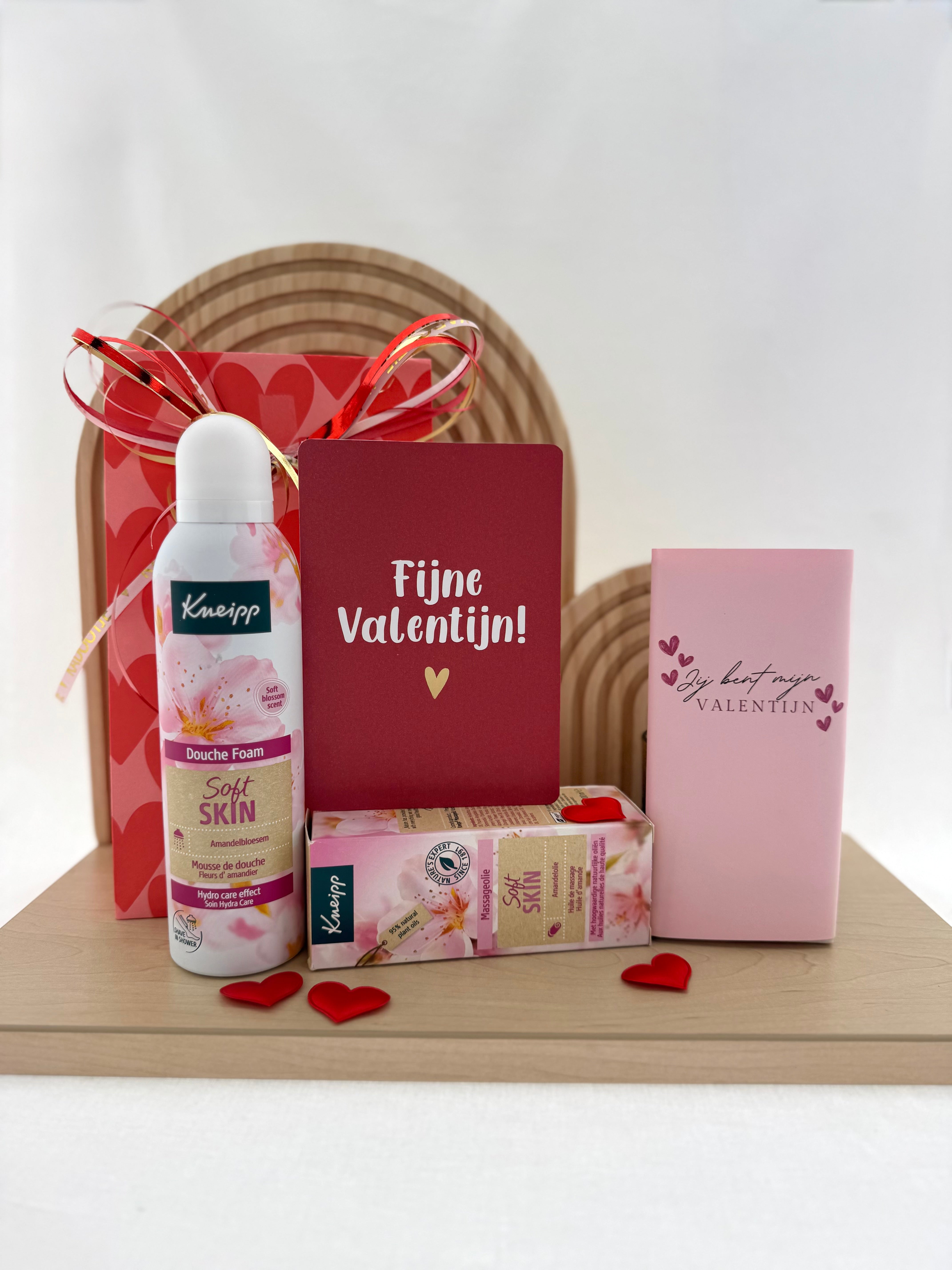 Een heerlijk verwenpakket voor een ontspannen Valentijnsmoment. Met de Kneipp Soft Skin massageolie en de Kneipp Soft Skin showerfoam creëer je samen of alleen een warm spa-gevoel in huis. De chocolade van de Notenshop maakt het cadeau extra lief en compleet.