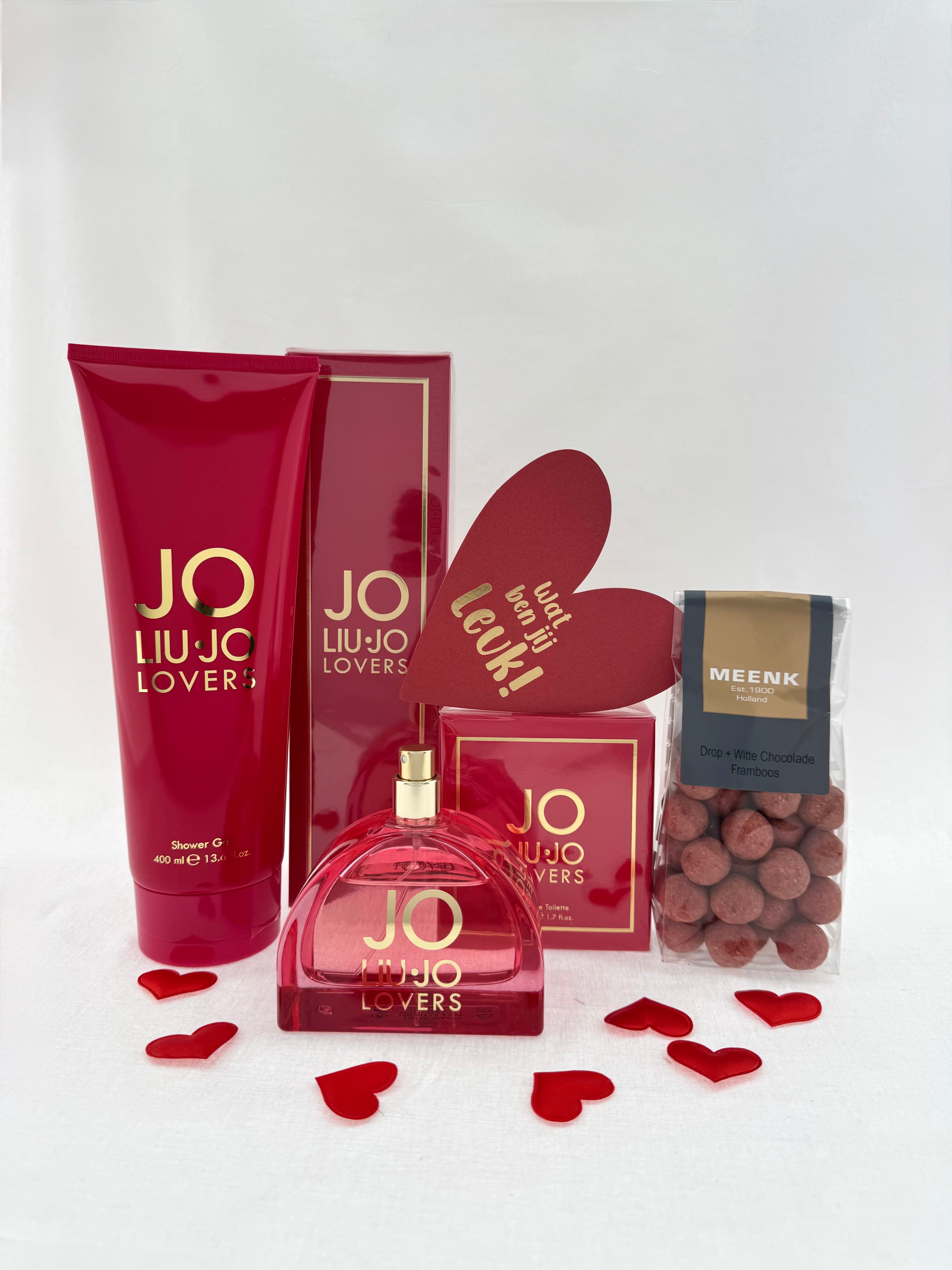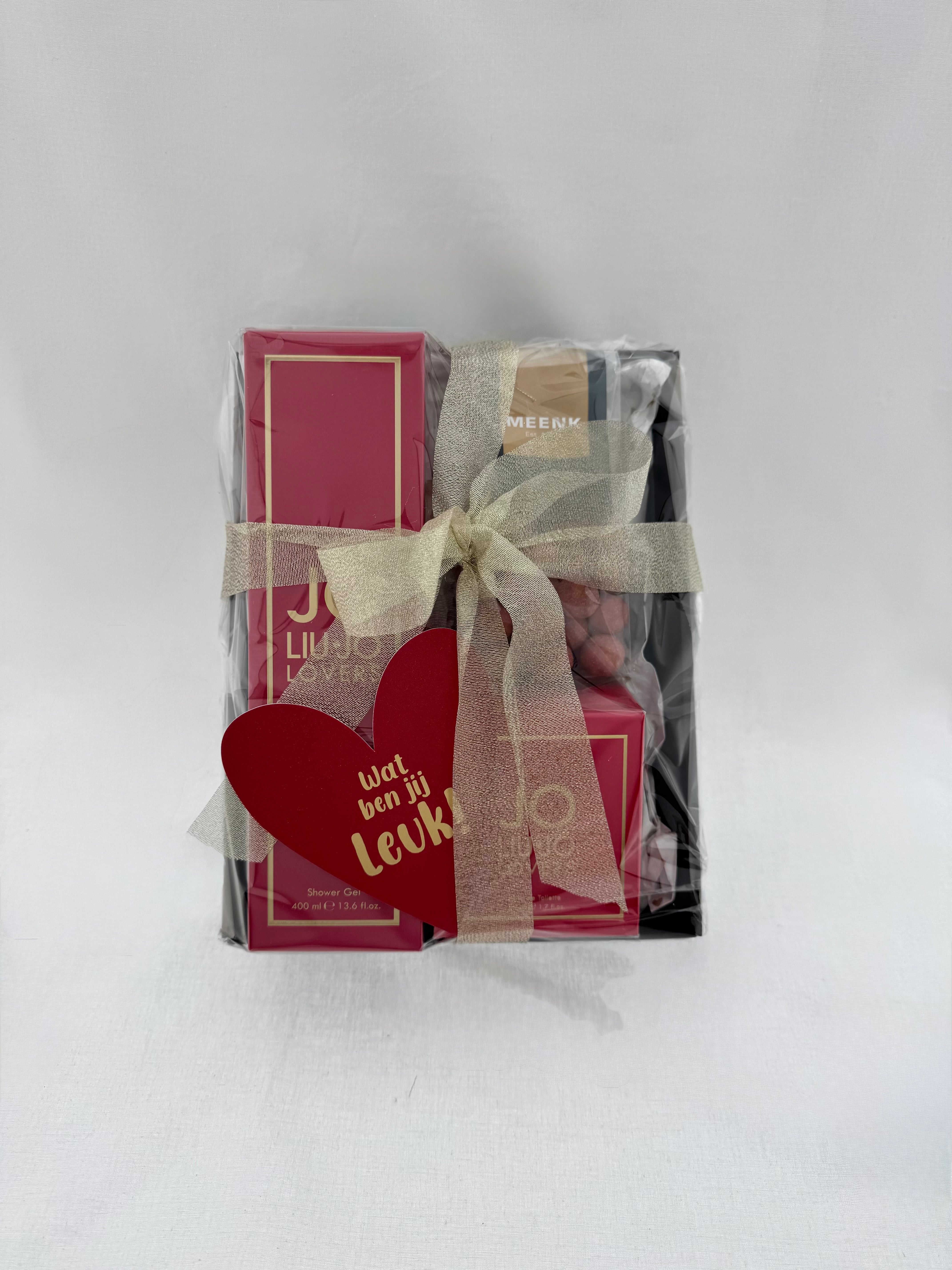 Een stijlvol verwenpakket met een vleugje luxe: Liu Jo parfum, een bijpassend showerproduct en een zoete traktatie van Meenk. Perfect om cadeau te geven bij Valentijn!