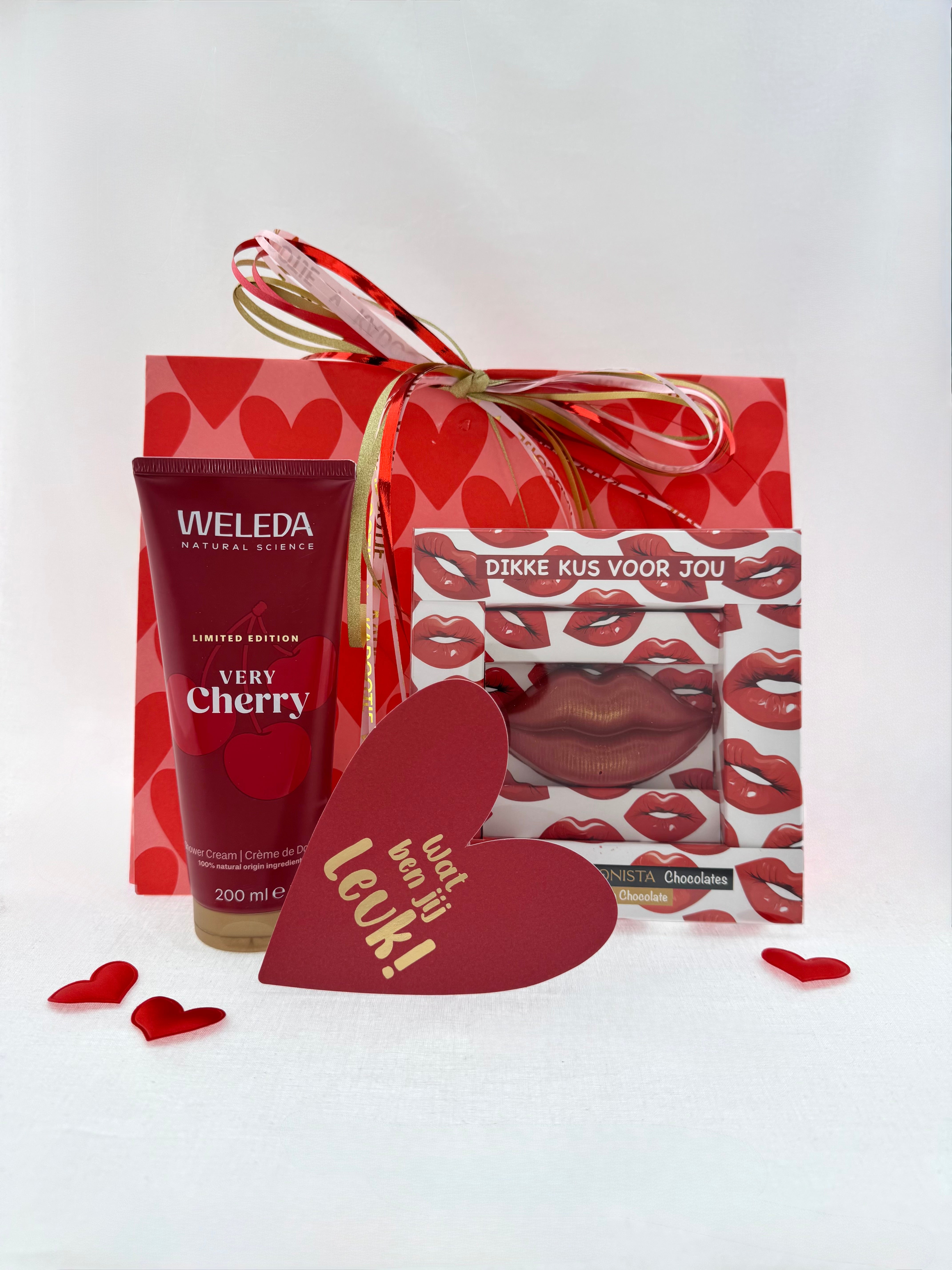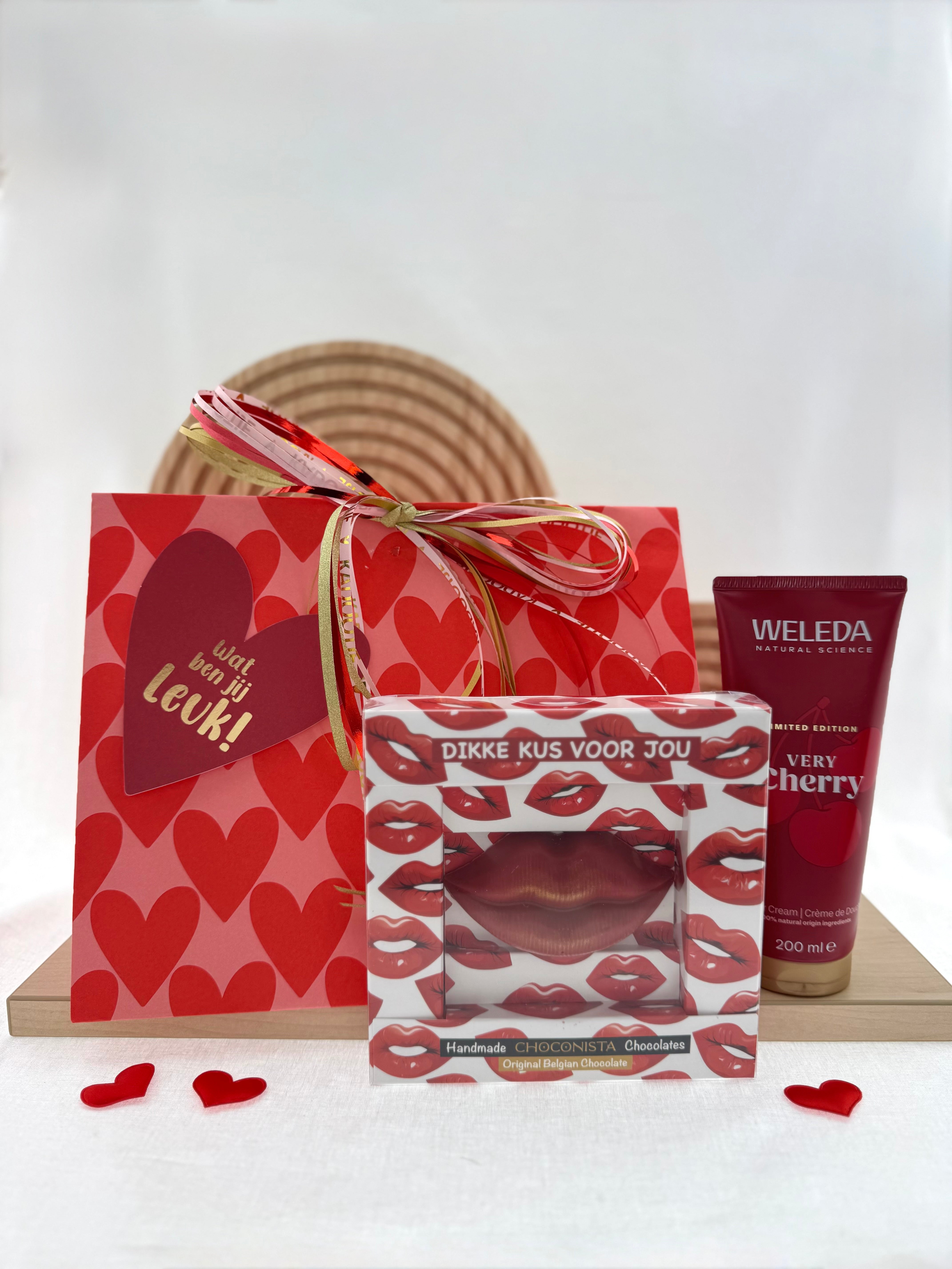 Een lief en vrolijk Valentijnscadeautje met een zoete knipoog. De Weleda Cherry zorgt voor een heerlijk verzorgmoment met een fruitige geur, en de Choconista “Dikke kus” 3D maakt het cadeau extra speels en romantisch. Perfect als klein gebaar met grote glimlach.