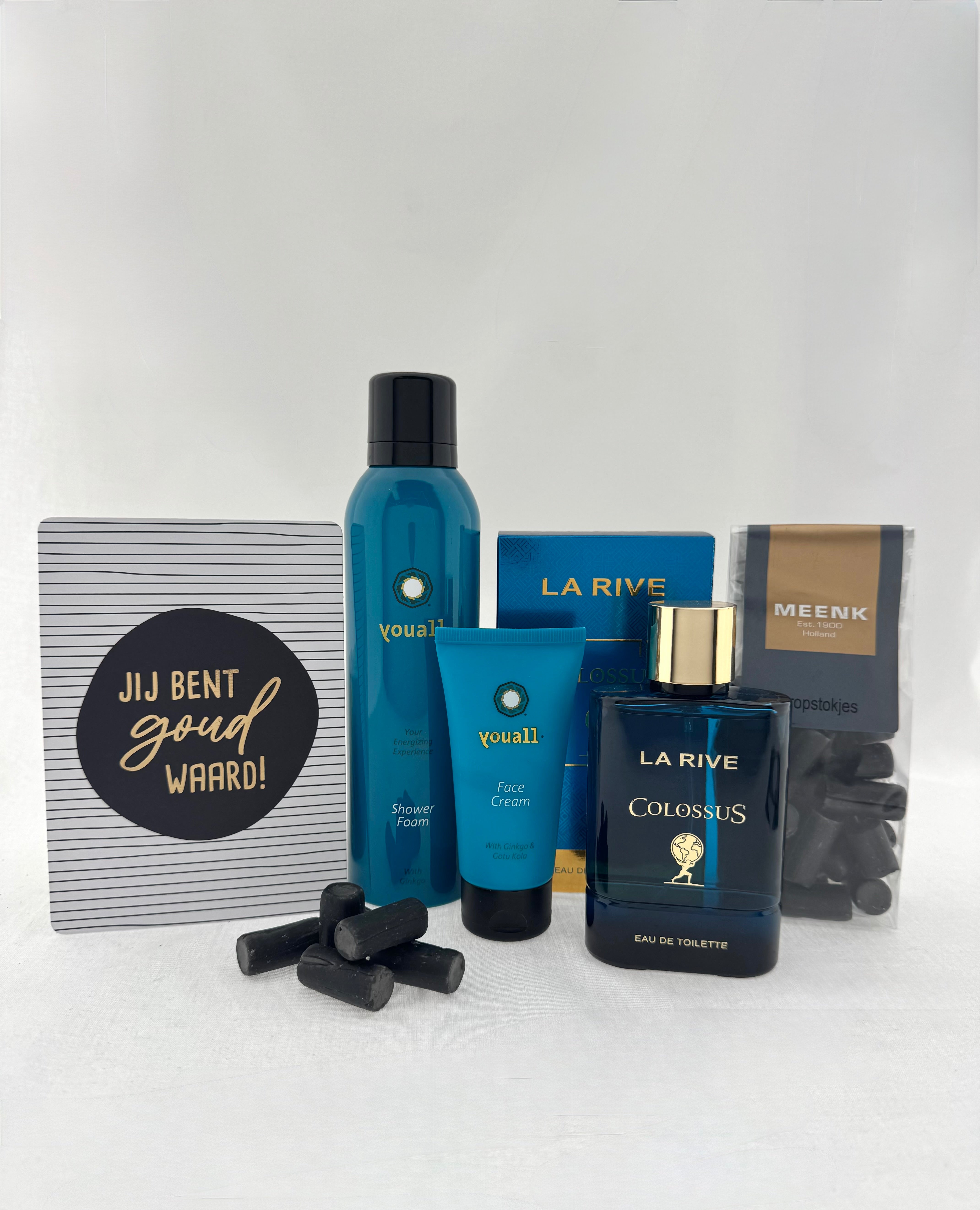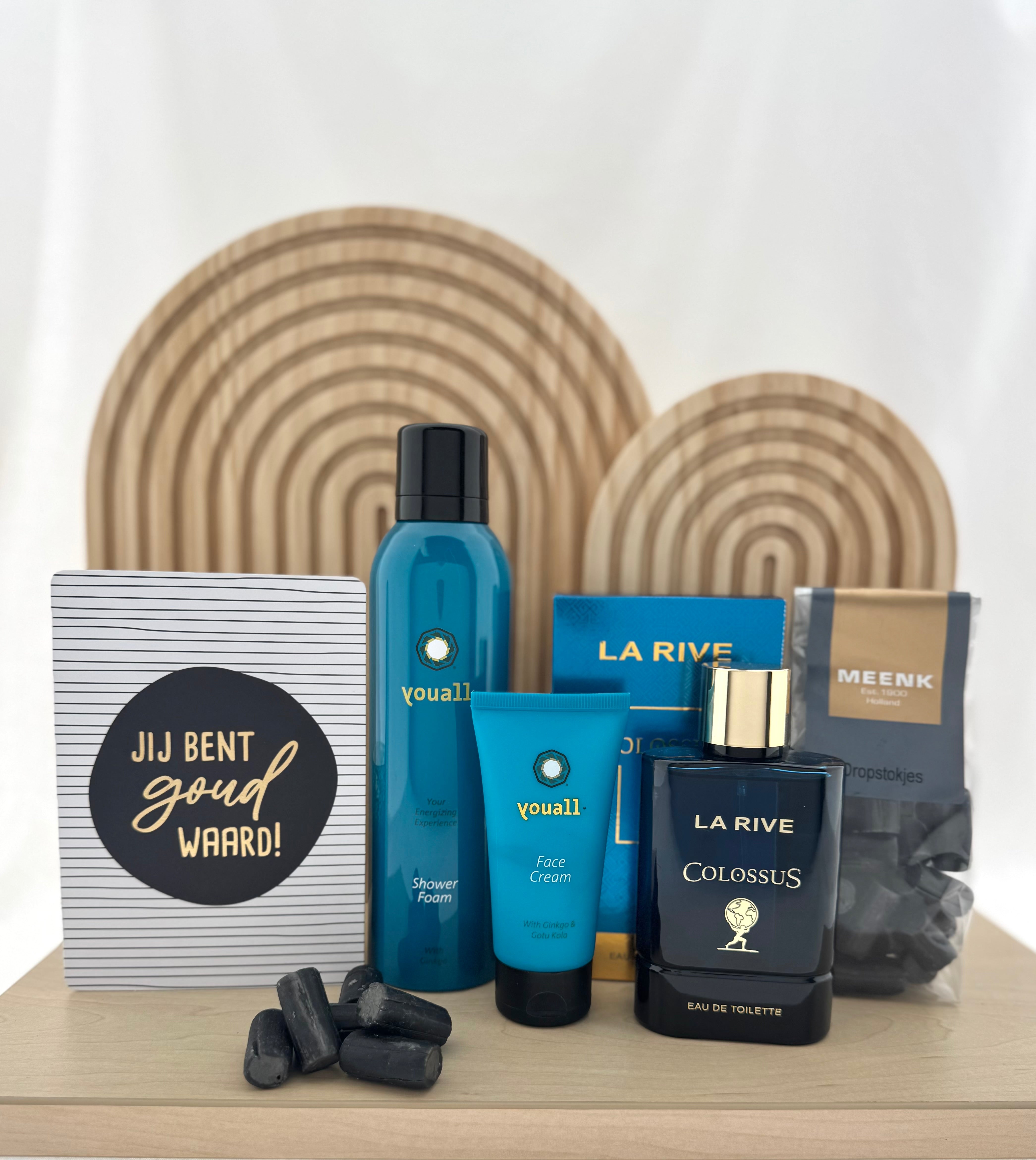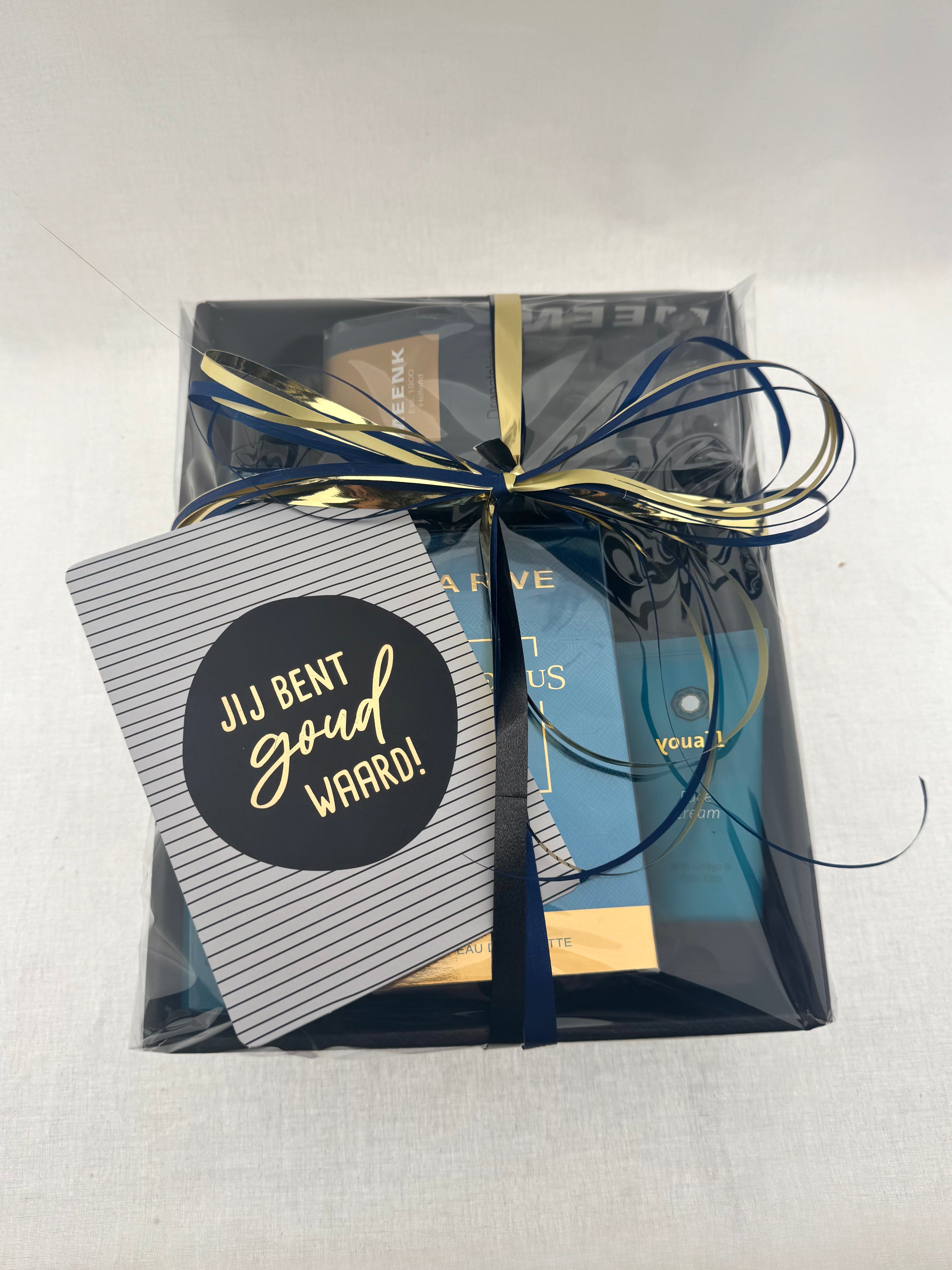 Verras hem deze Valentijn met een stijlvol en luxe verzorgingspakket in elegante blauwtinten. Dit cadeau combineert verzorging, geur en een kleine lekkernij tot een compleet verwenpakket. Perfect om te laten zien hoeveel hij voor je betekent.