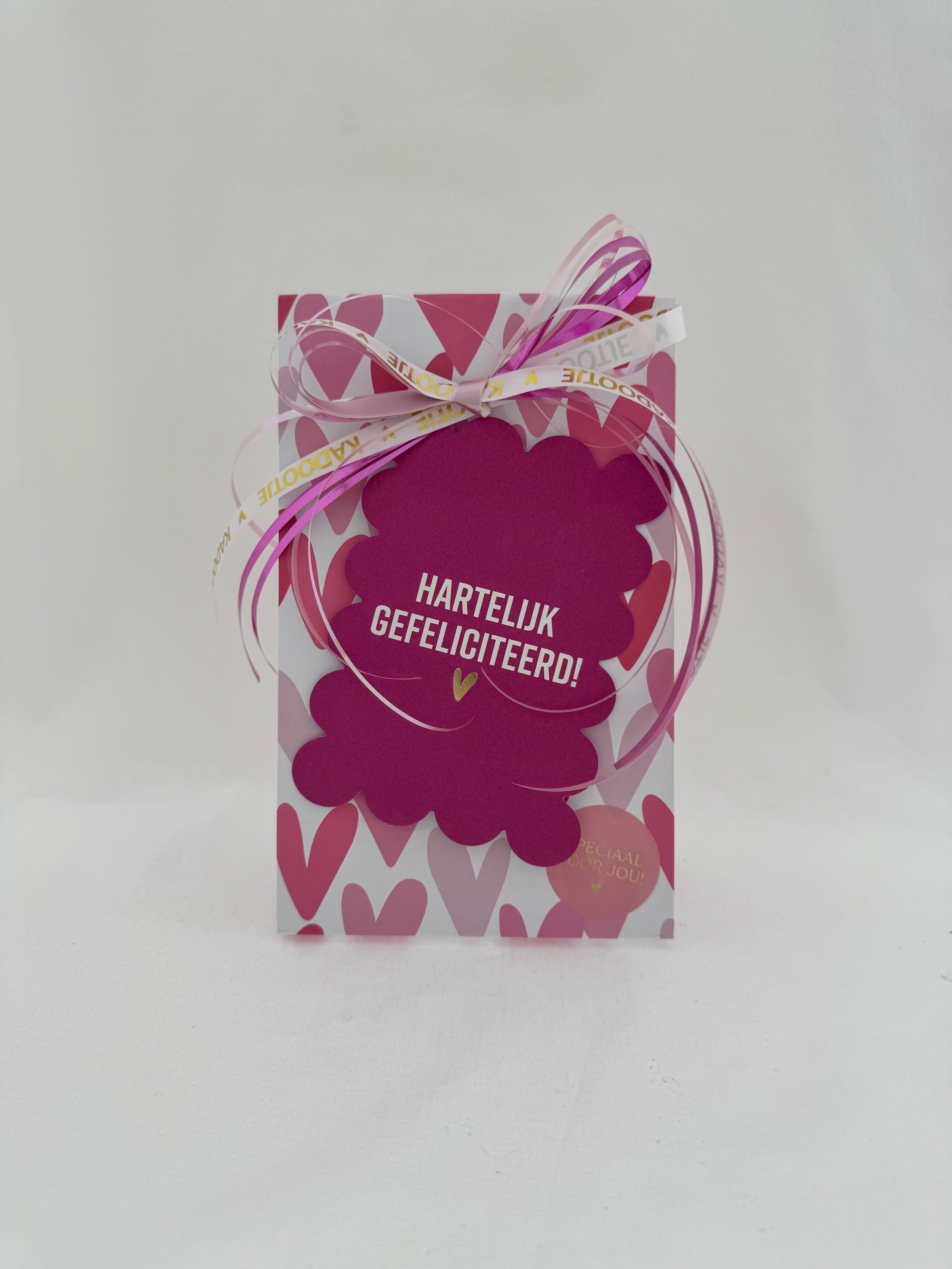 ❥ Kaartje met “Hartelijk Gefeliciteerd!”*: ideaal voor verjaardagen en met ruimte voor een persoonlijke boodschap.