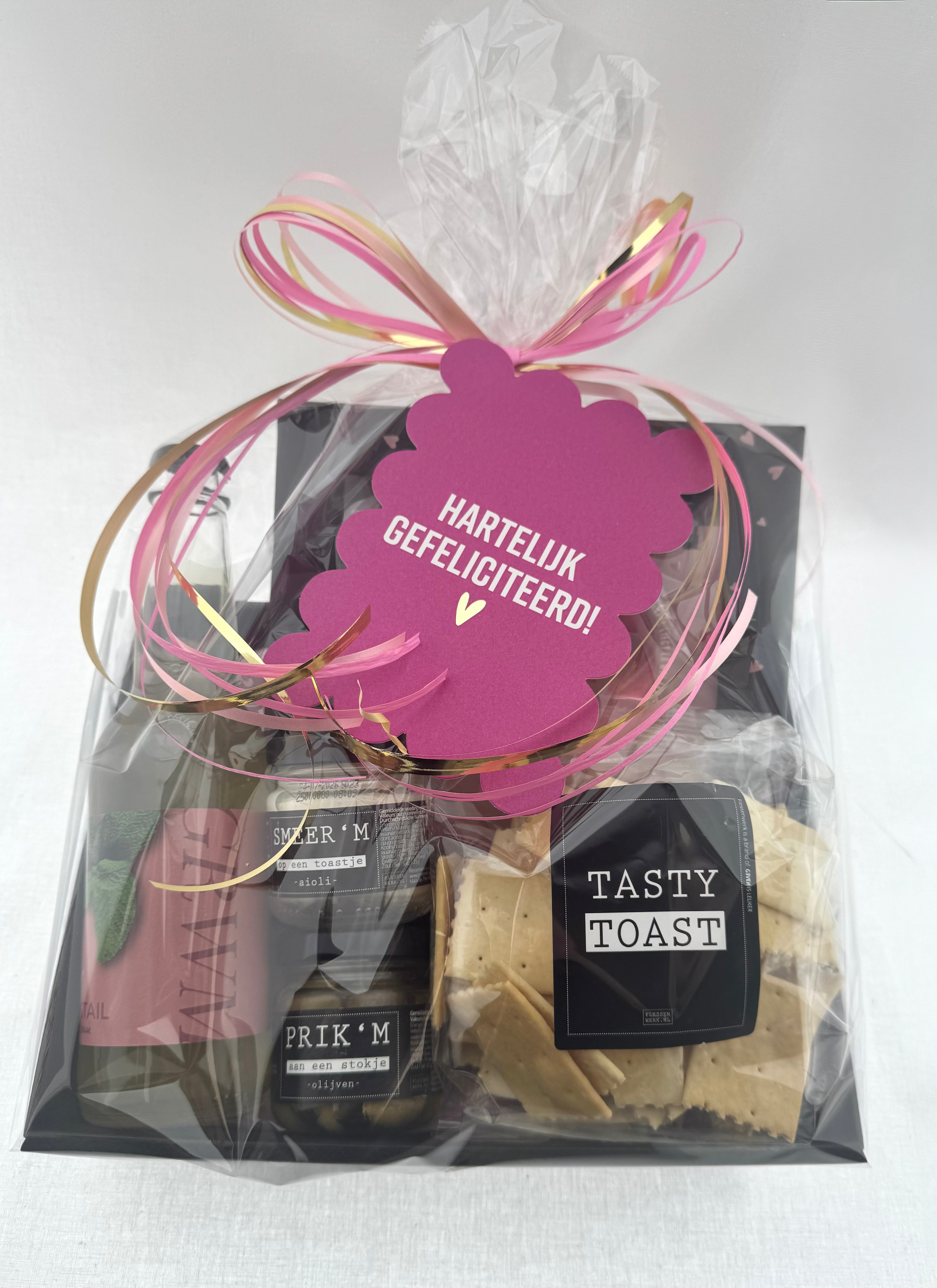 Verras iemand met dit feestelijke verwenpakket vol lekkers én gezelligheid! Dit stijlvolle cadeau is perfect voor een onvergetelijke verjaardag.