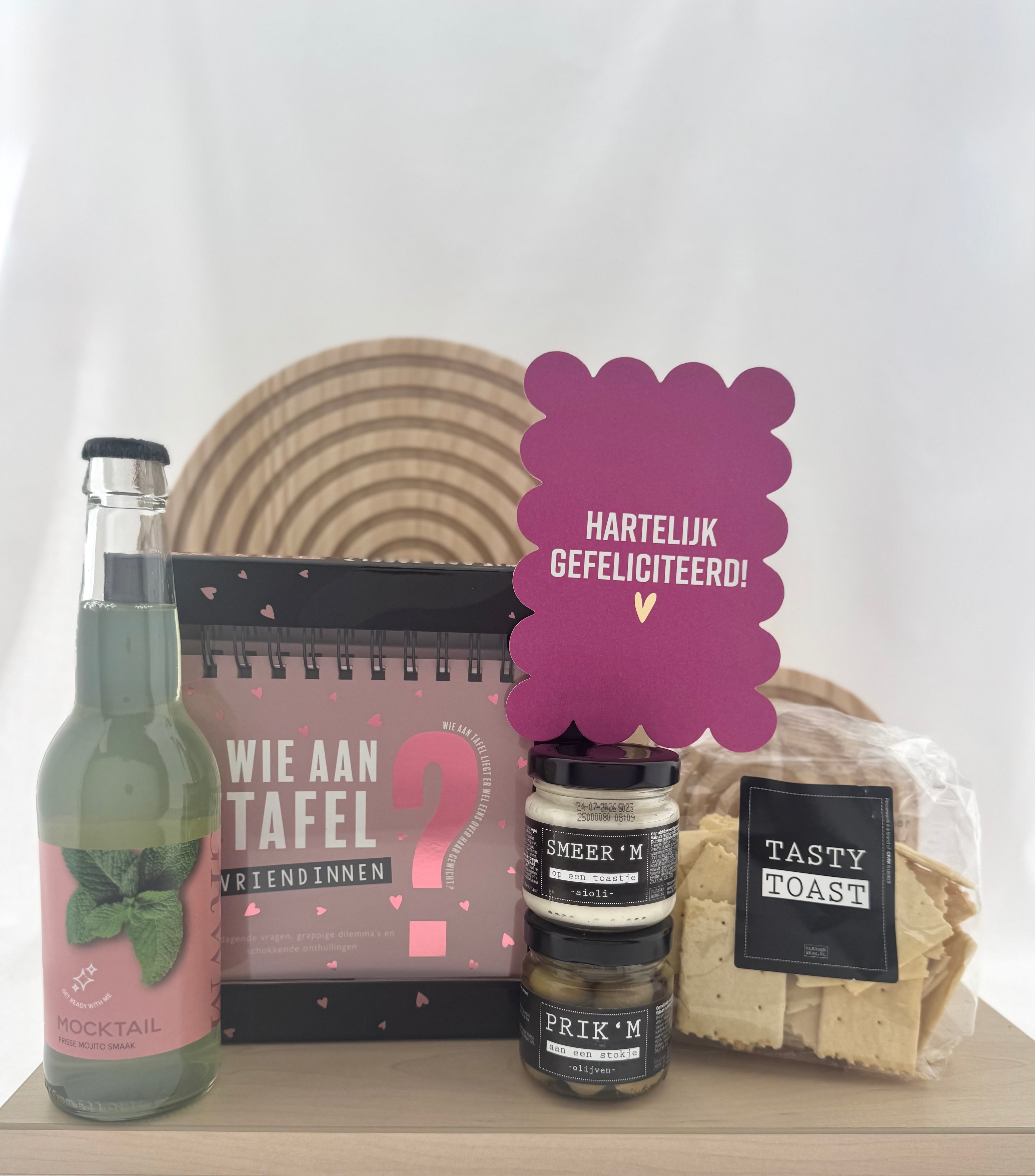 Dit pakket combineert smaakvolle borrelproducten met een vrolijk spel en een feestelijk kaartje. Ideaal voor een gezellige verjaardag vol plezier!