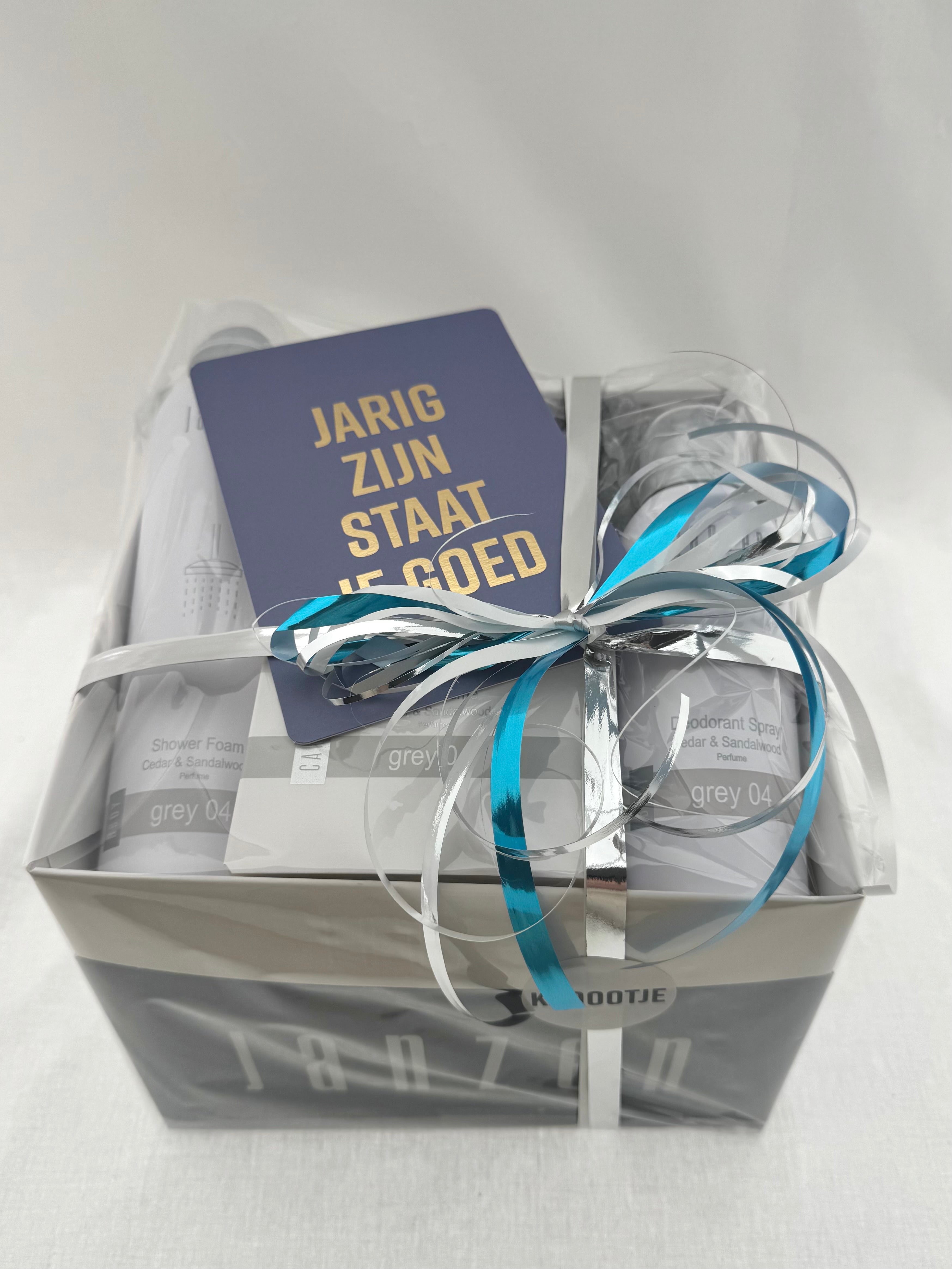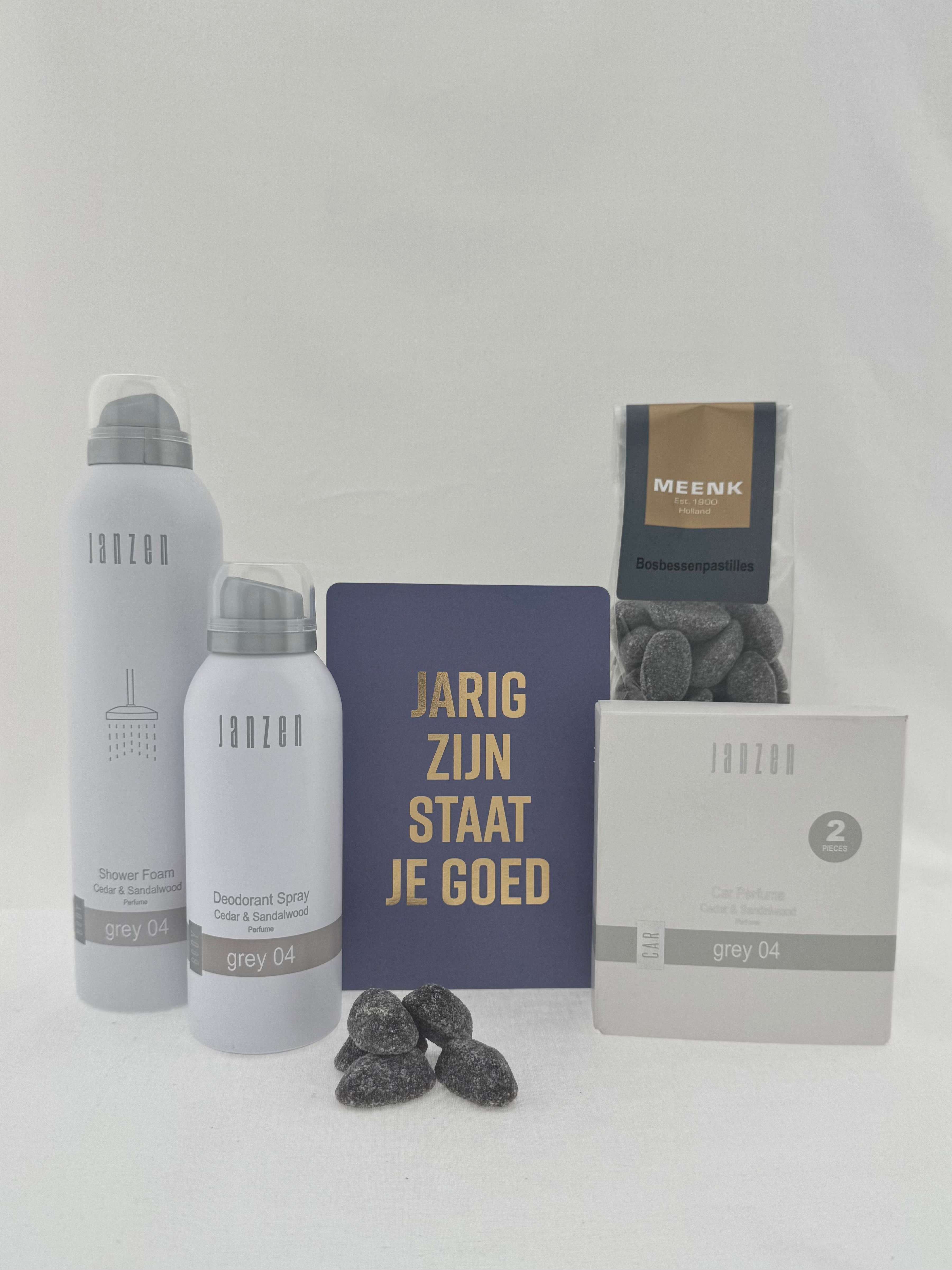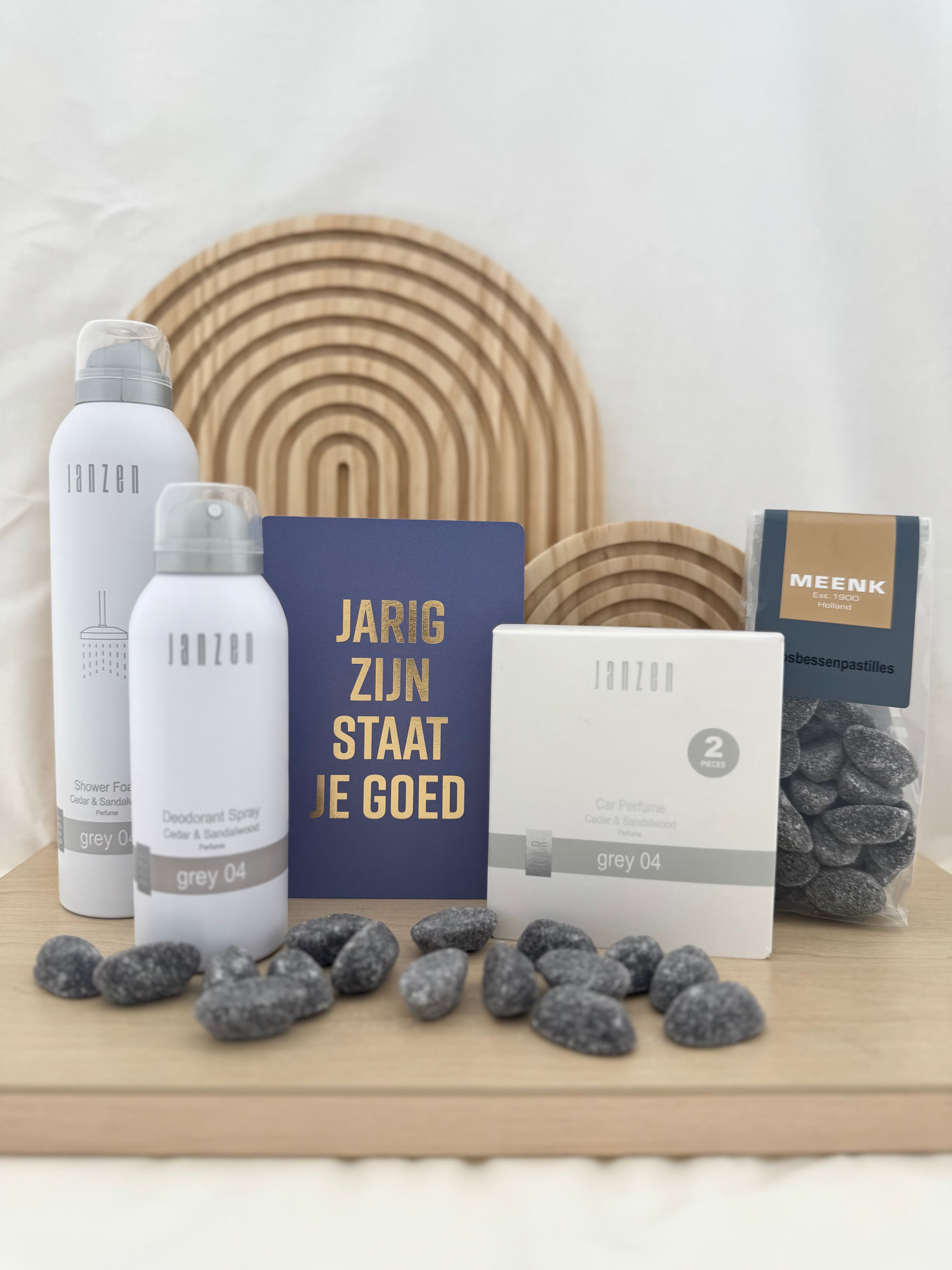 Een stijlvol en geurend cadeaupakket om iemand te feliciteren met zijn verjaardag. Dit luxe verwenmoment is perfect samengesteld met producten van Janzen in de heerlijke geur Grey 04, Cedar & Sandalwood. Een warme, elegante geur met een vleugje frisheid die zorgt voor ontspanning en comfort.