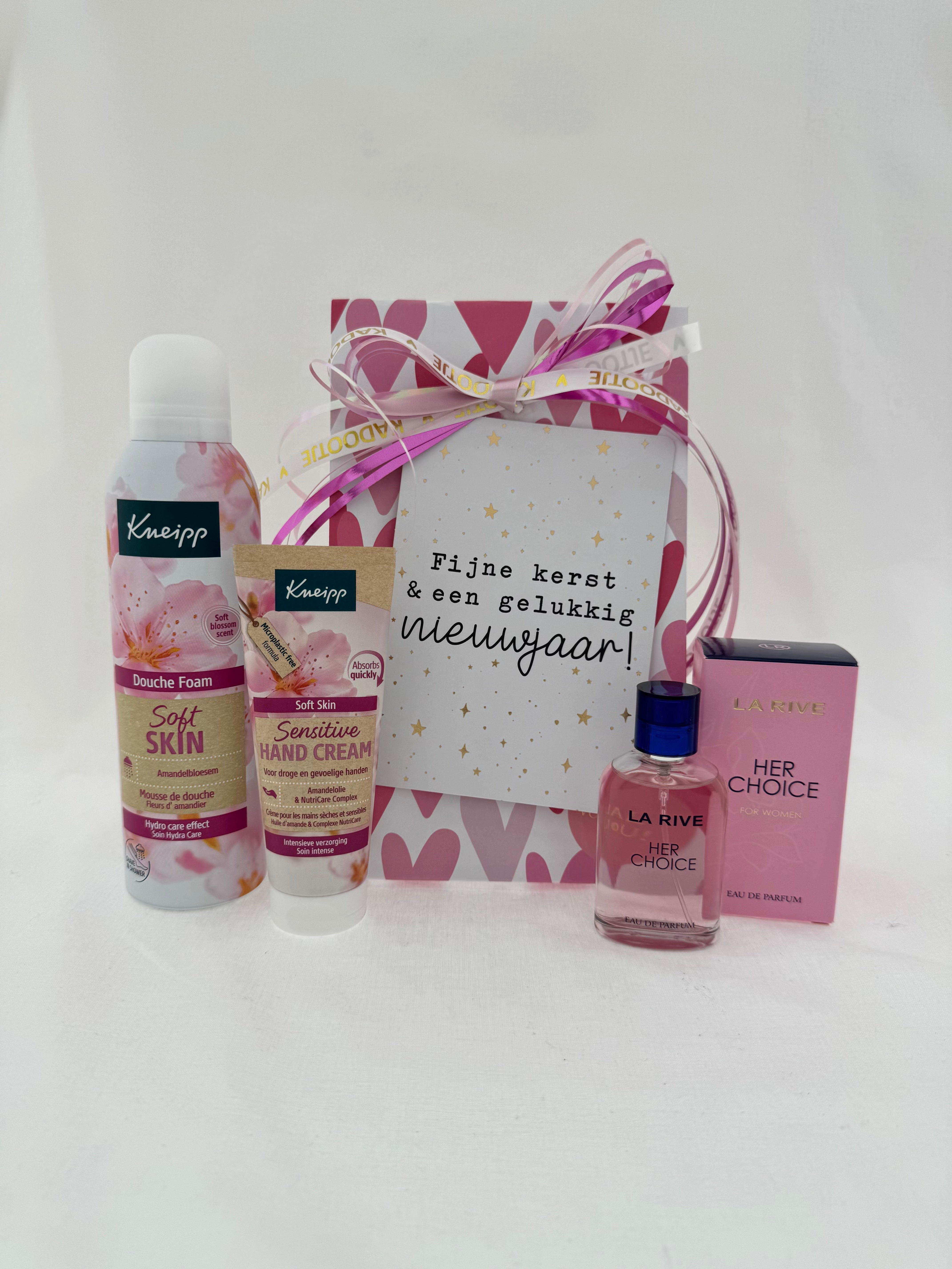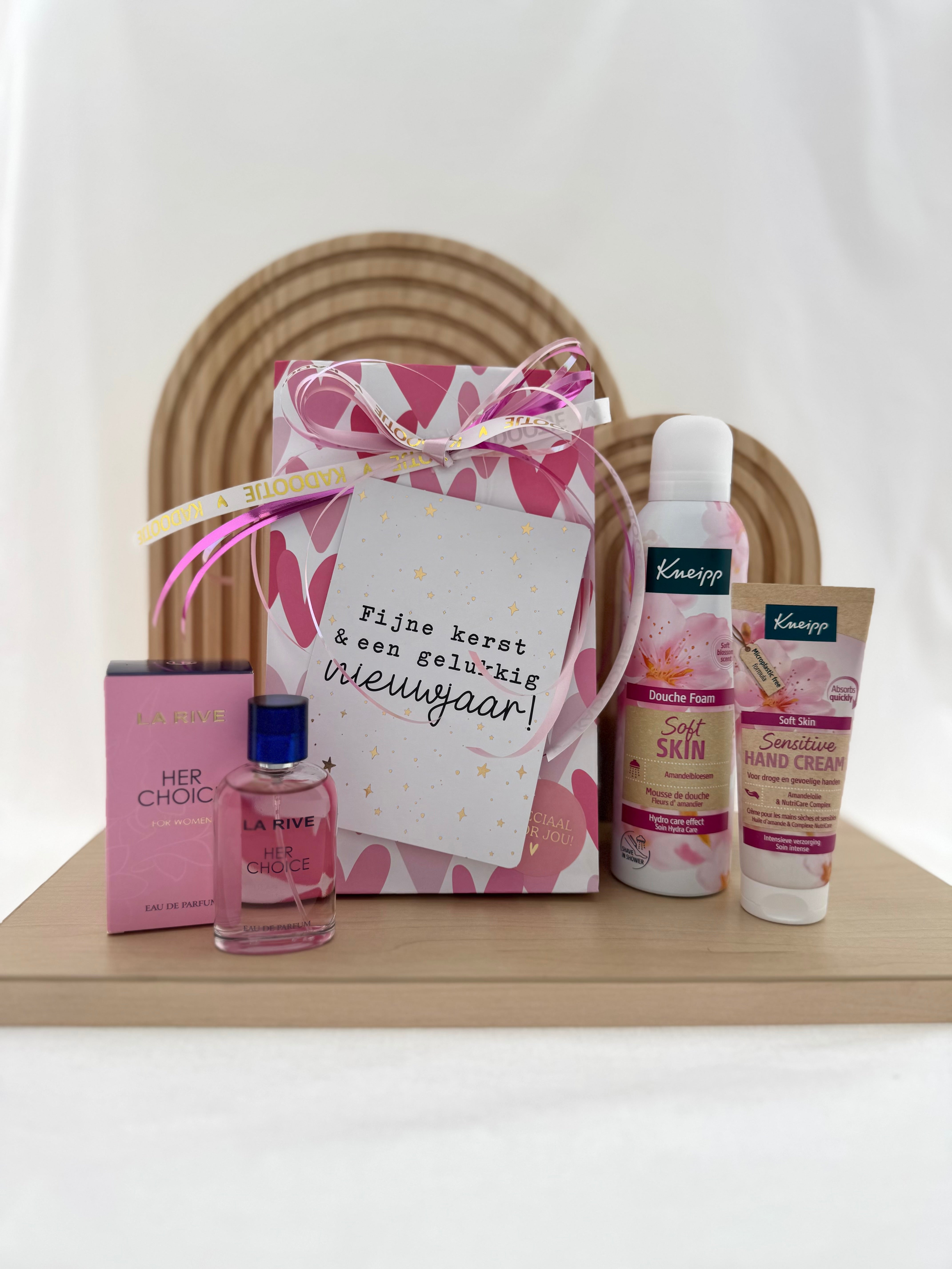 Verras iemand met een compleet wellness cadeau vol heerlijke geuren en verzorging. Dit feestelijke pakket combineert luxe verzorgingsproducten met een elegante parfum, verpakt in een vrolijke geschenkdoos.
